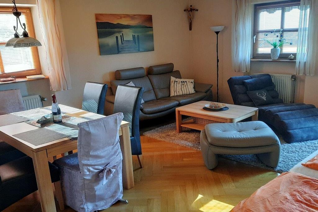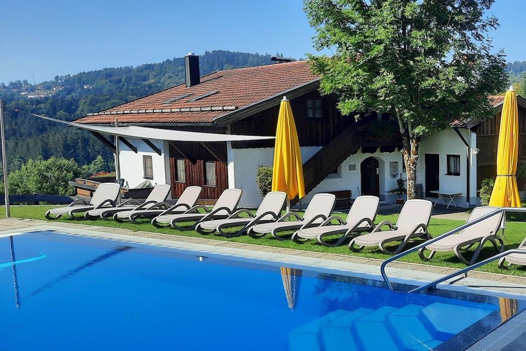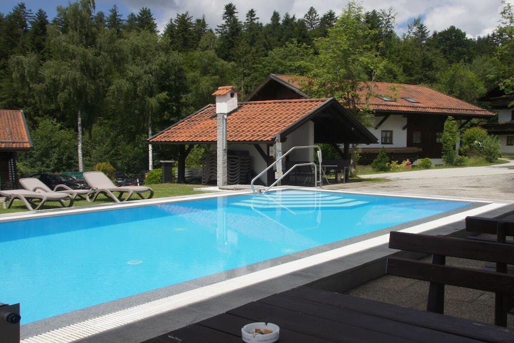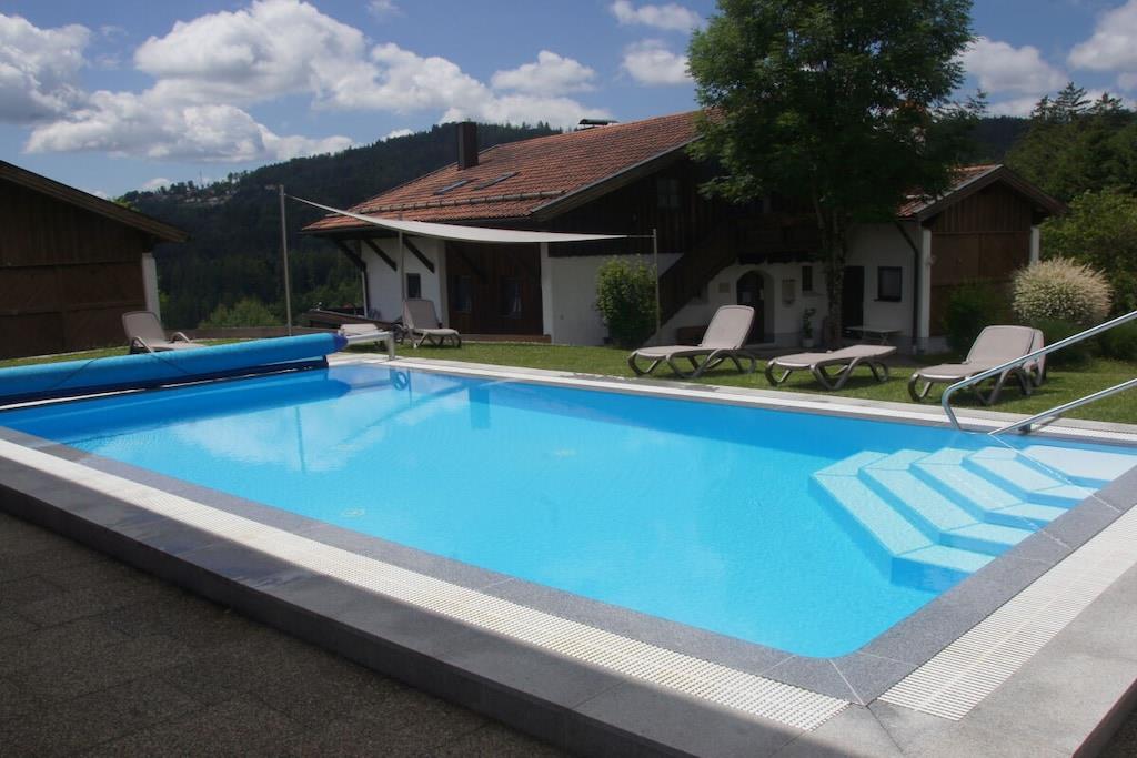 Die ebenerdige südlich gelegene komfortable Ferienwohnung mit traumhaftem Balkonblick auf Hauzenberg und Umgebung, mit hauseigenem Hallenbad, Sauna und Freibad lassen keine Wünsche übrig. Parkplatz vor dem Haus, Grillmöglichkeit, Spielplatz (ideal für Kinder) stehen zur Verfügung. Die Wohnung ist für 4 Personen mit vollwertigen Betten ausgestattet, für ein Kleinkind kann ein Kinderreisebett und Kinderstuhl bereitgestellt werden. Geräumiges Wohnzimmer mit Essbereich und Sitzecke, Doppelbett (Schrankbett), Fernseher, sowie WLAN, weiteres Schlafzimmer, für 2 Personen, eine moderne volleingerichtete Küche mit Geschirrspüler, Backofen, Kühlschrank mit separater Gefrierkombination und vielem mehr, modernes Bad mit Dusche und Toilette, Für 4 Pers. steht Bettwäsche z. Verfügung, ebenso sind pro/Pers. 2 Handtücher verfügbar (für Schwimmbad, Sauna u. Liege bitte eigene Handtücher mitbringen).