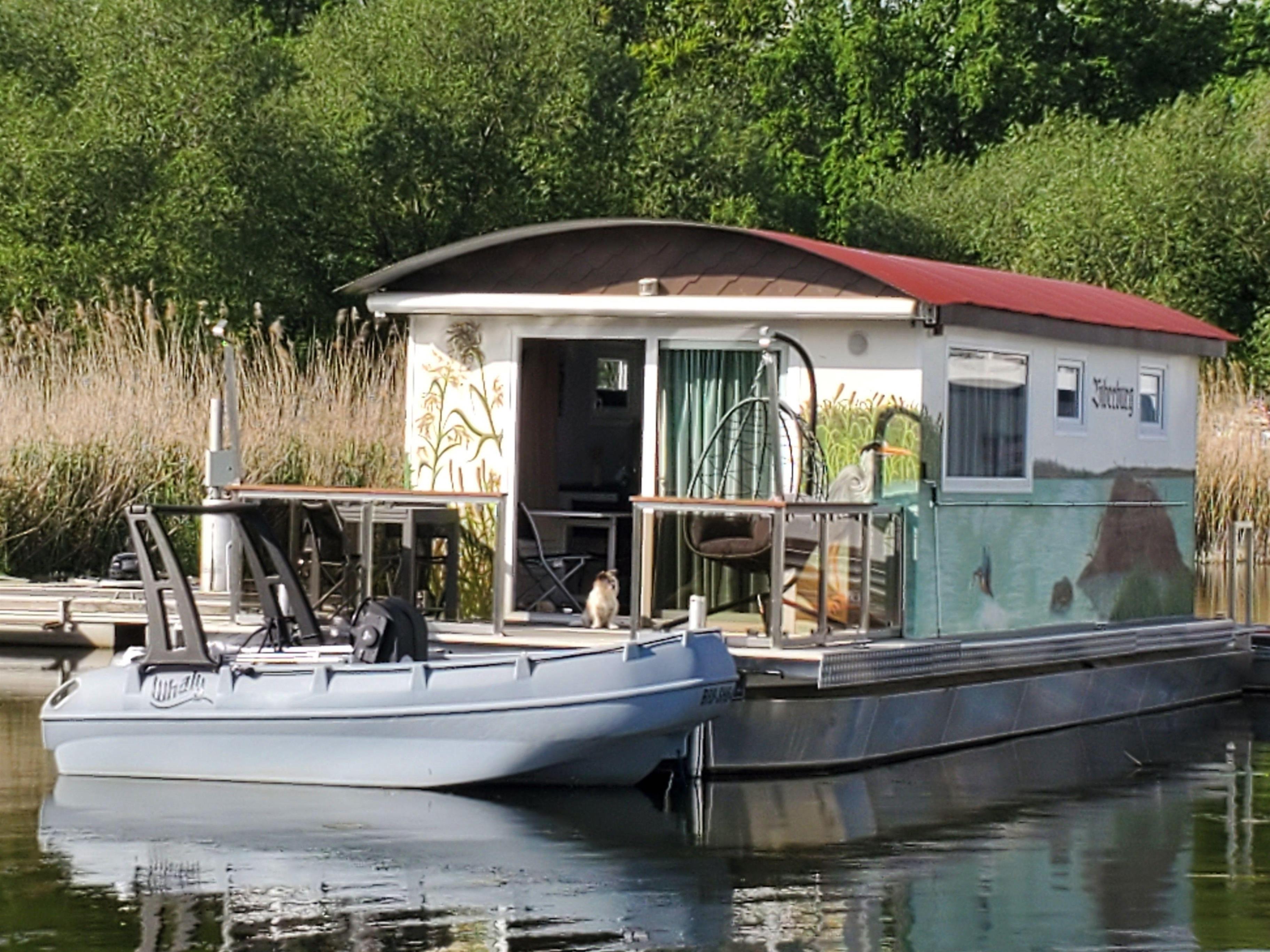 Das schwimmende Haus liegt fest verankert am Steg. Die solide und zweckmäßige Ausstattung mit viel Liebe zum Detail sorgt für erholsame Stunden im gemütlichen Ambiente. Ein kleines Schlafzimmer mit einem Doppel- und einem Hochbett sowie einem Schlafsofa im Wohnzimmer mit freiem Blick auf den See. Hier können Sie die Zeit vergessen und einfach die Natur genießen.