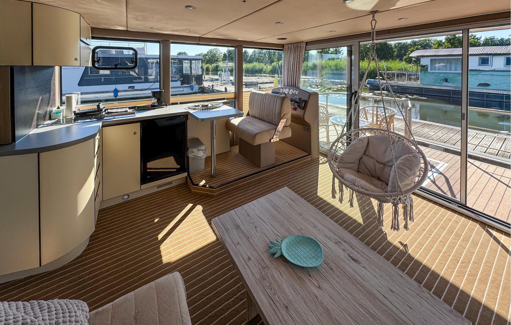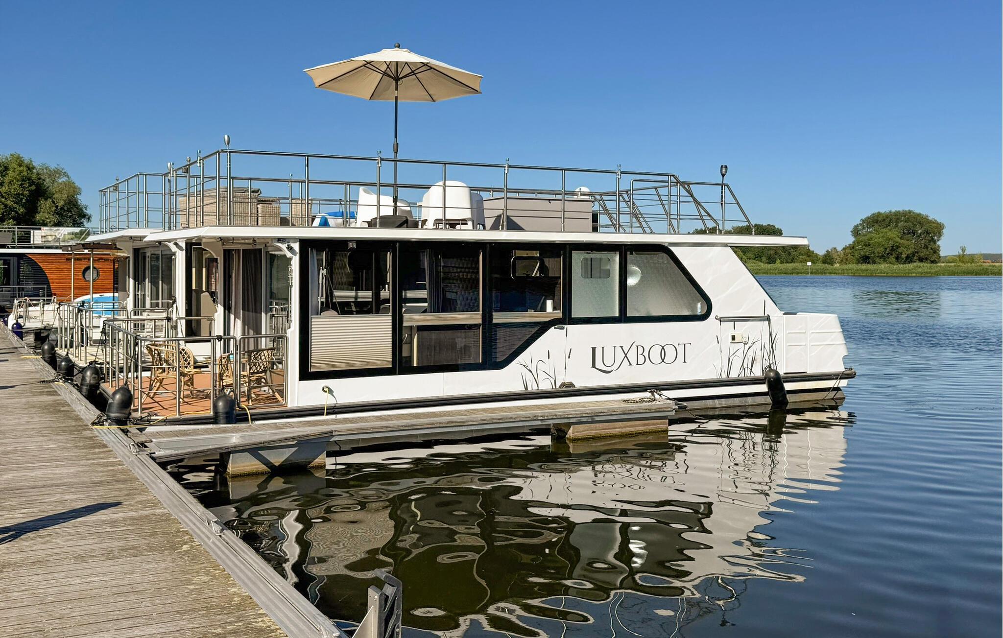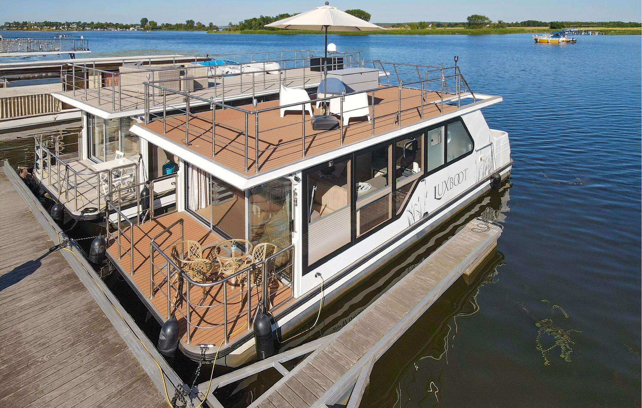 Oplev en unik ferie på denne stilfulde husbåd ved Havelsee. Den moderne og lyse indretning skaber en indbydende atmosfære, hvor I straks vil føle jer hjemme. Nyd vandets ro, mens I slapper af på terrasserne eller beundrer udsigten gennem de store vinduer. Den åbne opholdsstue giver en luftig og hyggelig stemning, og det fuldt udstyrede køkken har alt, hvad I har brug for under jeres ophold. Udendørs kan I vælge mellem terrassen med udendørs køkken eller den store tagterrasse, der indbyder til solbadning og hyggelige stunder med en drink ved solnedgang.