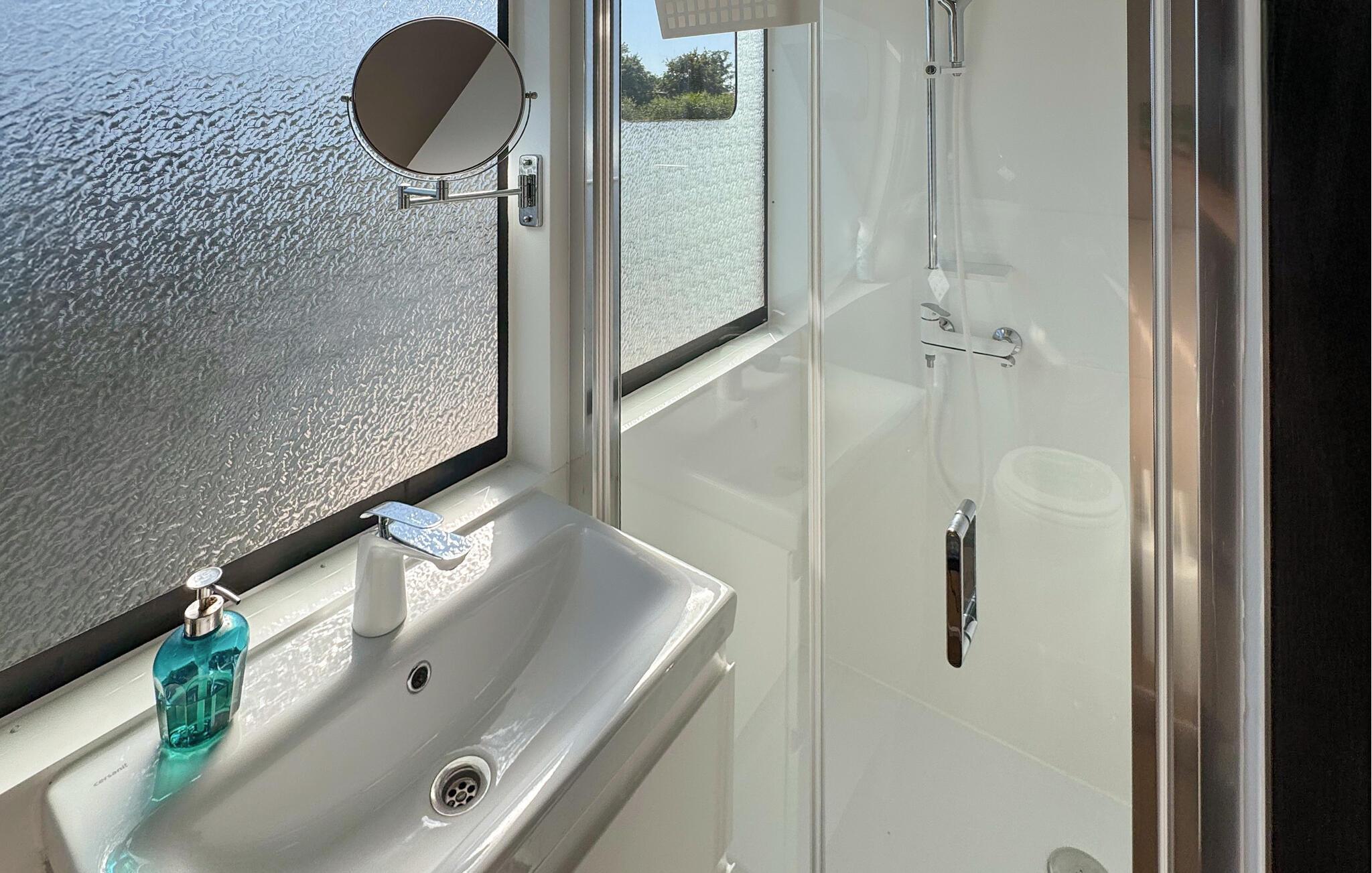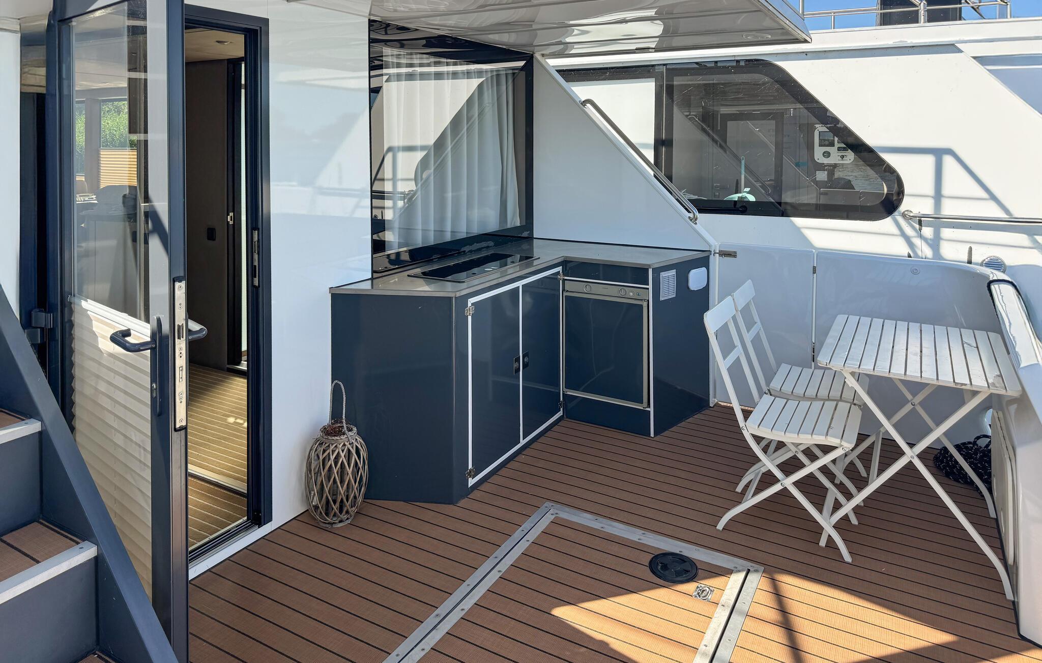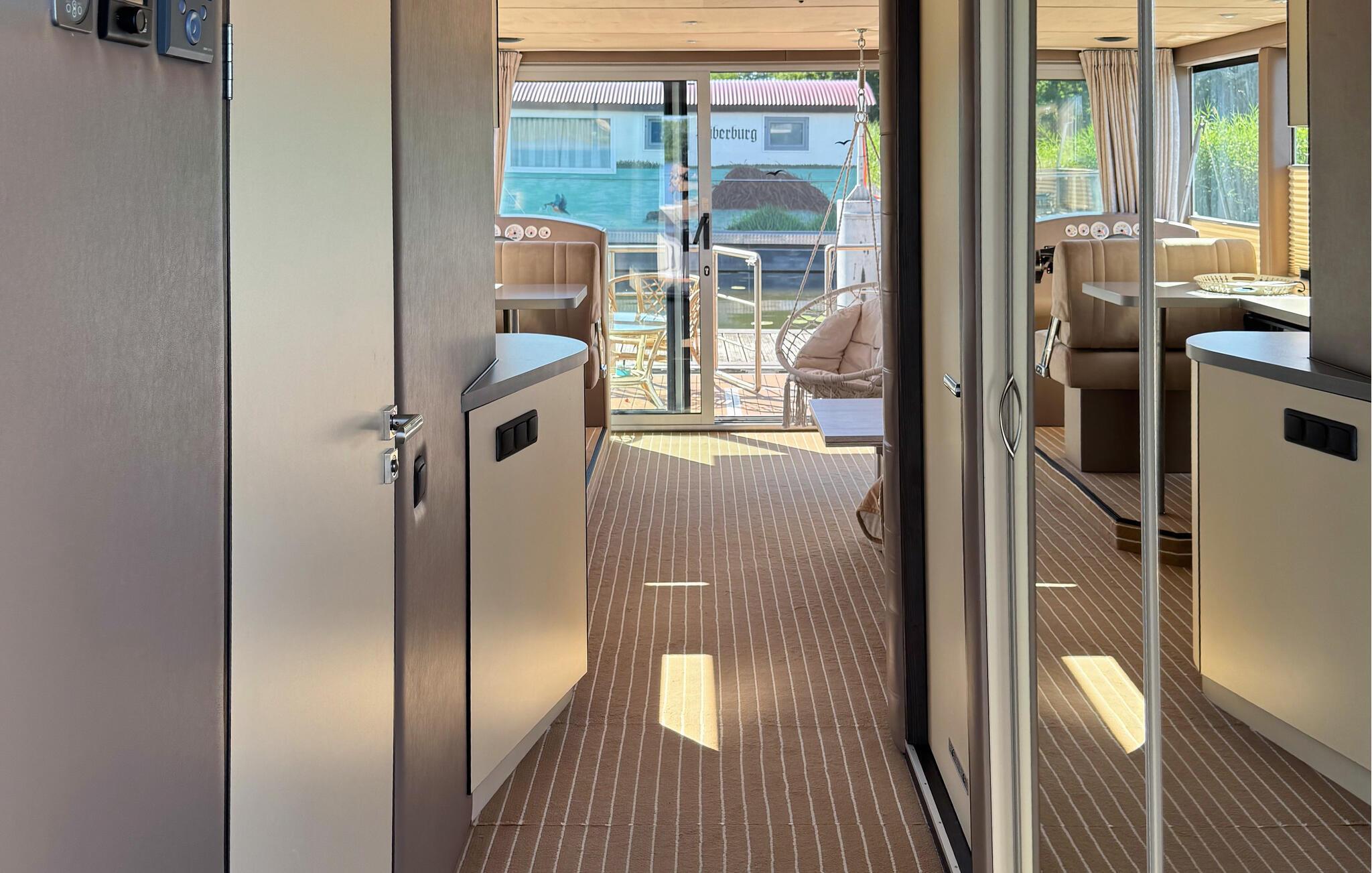 Oplev en unik ferie på denne stilfulde husbåd ved Havelsee. Den moderne og lyse indretning skaber en indbydende atmosfære, hvor I straks vil føle jer hjemme. Nyd vandets ro, mens I slapper af på terrasserne eller beundrer udsigten gennem de store vinduer. Den åbne opholdsstue giver en luftig og hyggelig stemning, og det fuldt udstyrede køkken har alt, hvad I har brug for under jeres ophold. Udendørs kan I vælge mellem terrassen med udendørs køkken eller den store tagterrasse, der indbyder til solbadning og hyggelige stunder med en drink ved solnedgang.