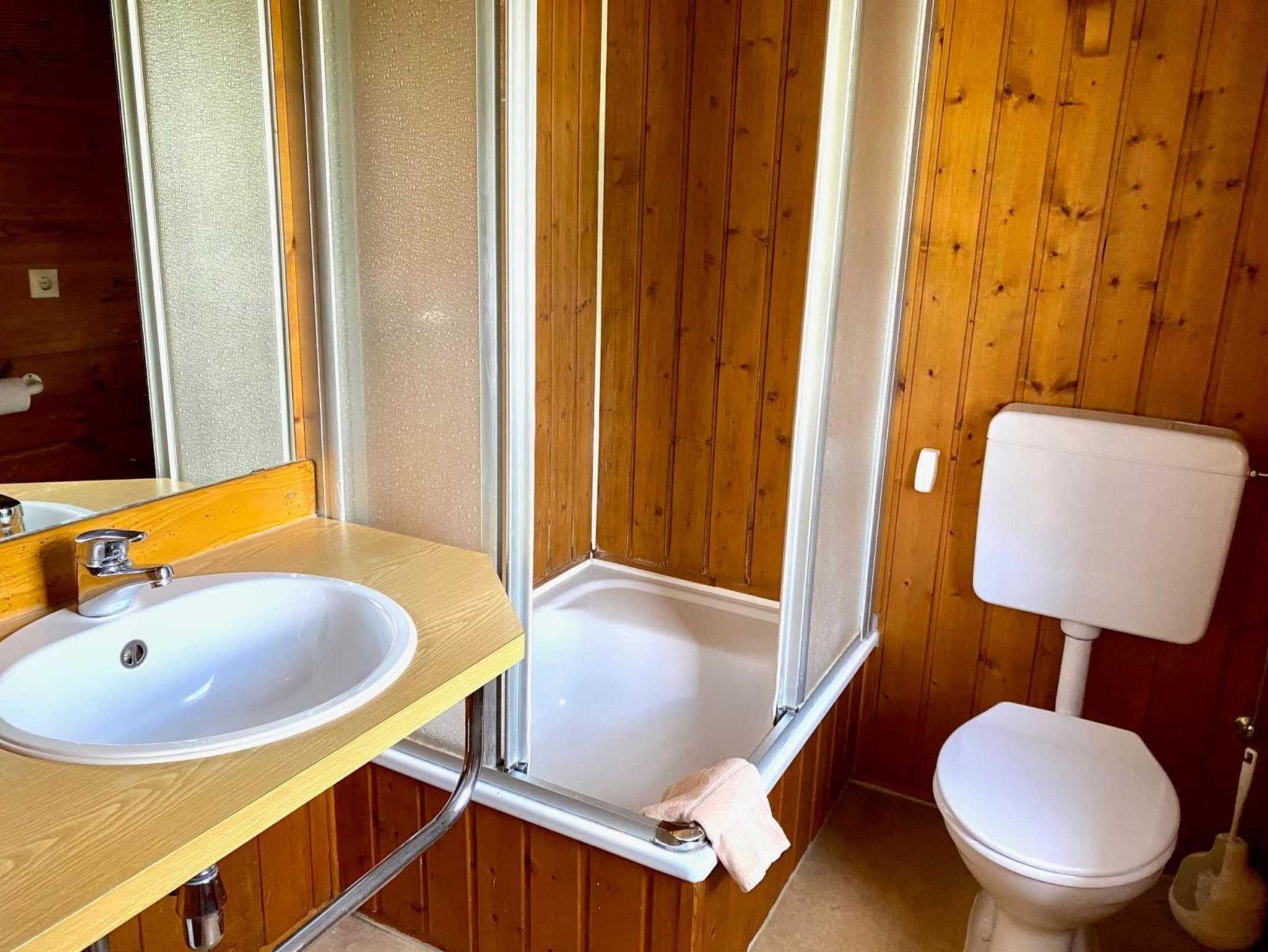 Sie wohnen in einem 3-Zimmer-Ferienhaus für bis zu 4 Personen auf 45 m² Wohnfläche, ein Schlafzimmer mit Doppelbett, ein Schlafzimmer mit Etagenbett, Wohnraum mit Kaminofen, Bücher zum Schmökern, separater Essplatz, voll ausgestatteter Küchenbereich, Diele mit Garderobe, Dusche/WC, Terrasse, SAT-Farb-TV mit Empfang Premiere Film, Premiere 1 + 2 und Disney Channel. Spiele für drinnen und draussen. Autostellplatz am Rande der Anlage.