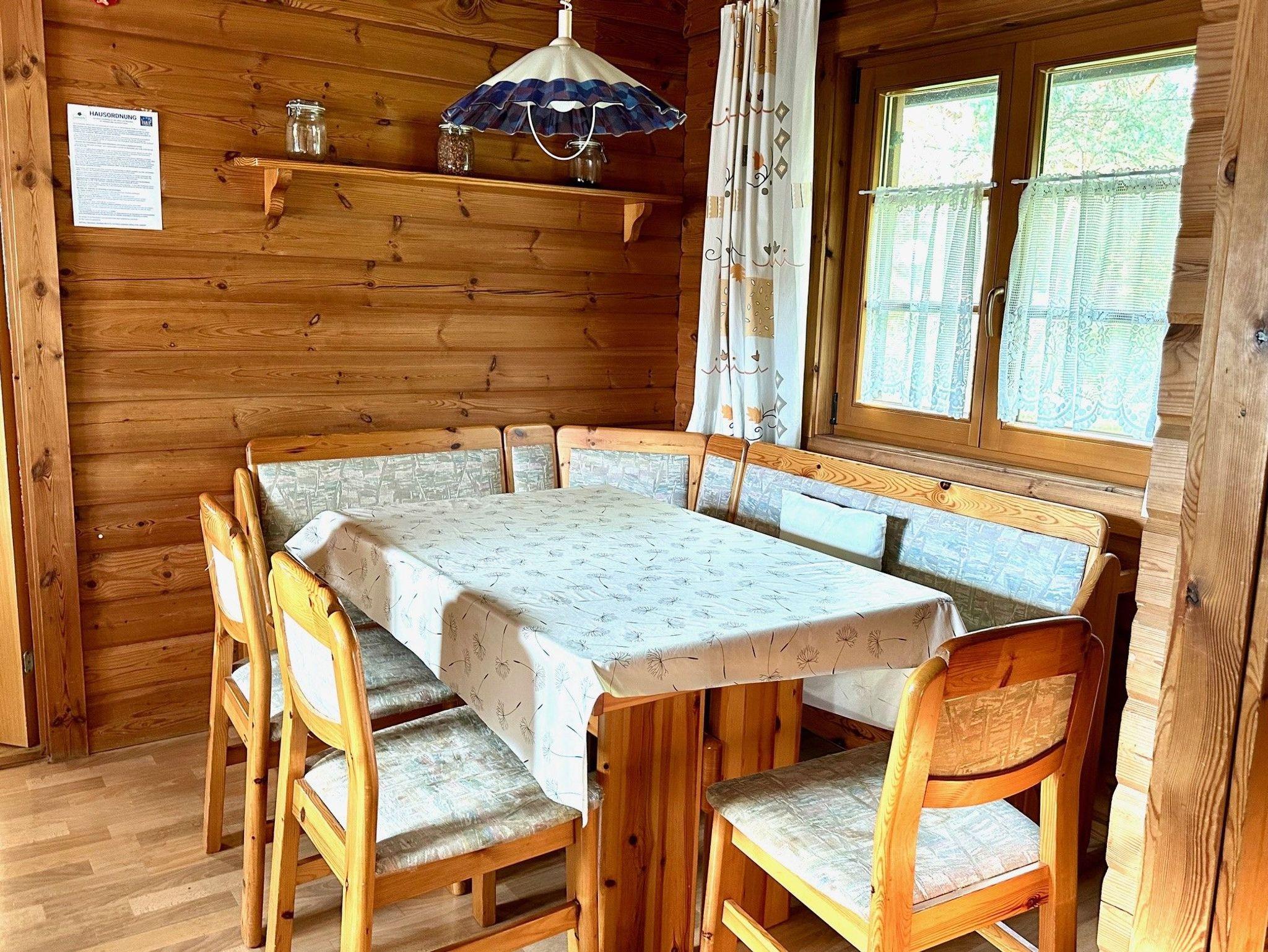 Küche: Herd, Ofen, Kühlschrank und Mikrowelle, Esstisch mit Eckbank.