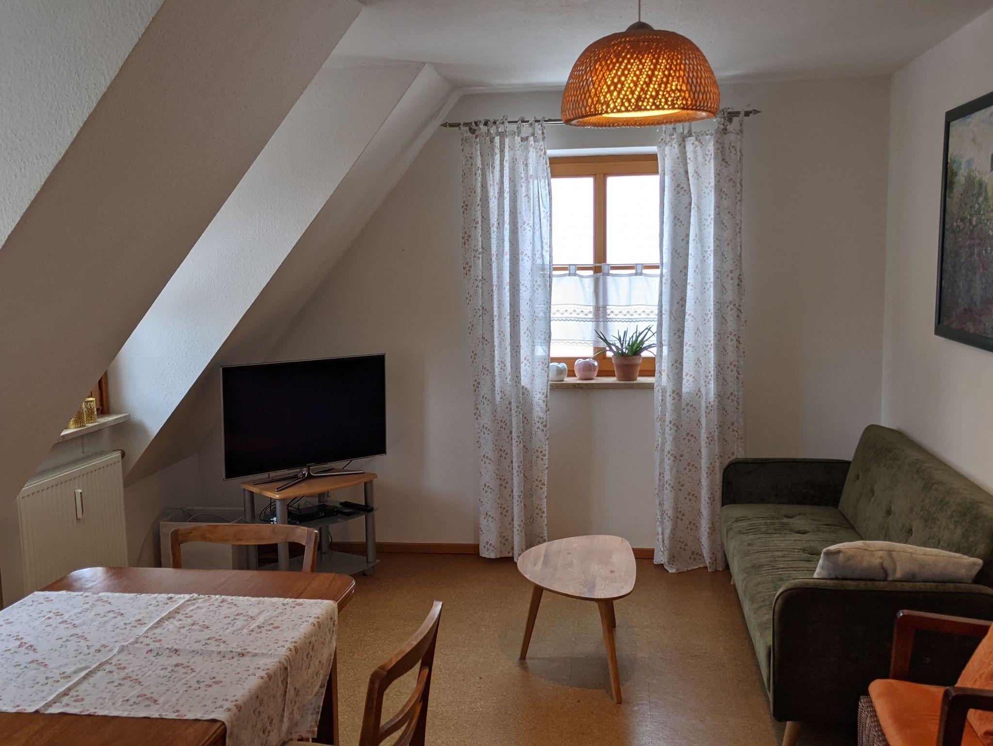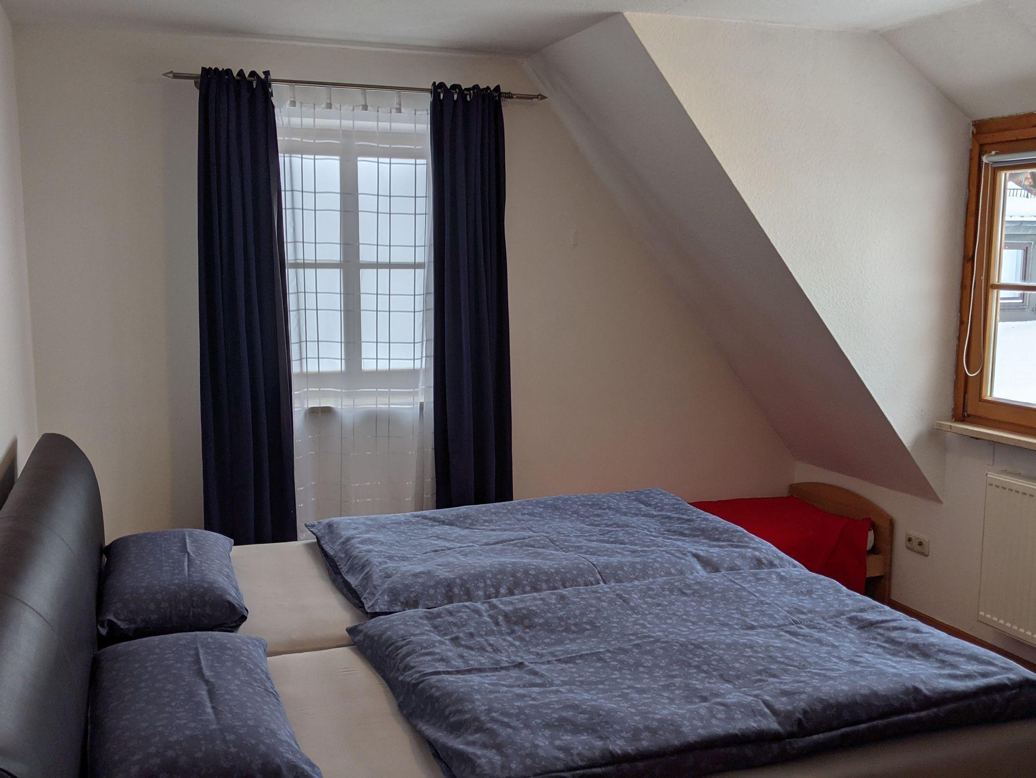 Unsere neuwertige Maisonette-Ferienwohnung mit Sprossenfenstern befindet sich im zweiten Obergeschoss und hat einen tollen Ausblick auf die Altstadt. Sie ist ausgestattet mit einer neuen Einbauküche mit Spülmaschine und Mikrowelle sowie den üblichen Geräten. Das gemütliche Wohn-Esszimmer verfügt über einen Esstisch mit vier Stühlen, einer Couch und TV-Gerät. Das geräumige und helle Badezimmer bietet Waschbecken mit Ablage und Badezimmerschränken, Badewanne und Dusche, WC, Waschmaschine und Fenster. In zwei Schlafzimmern können vier Gäste bequem nächtigen: ein modernes Boxspringbett (2 x 2 Meter) sowie Schrank und ein Doppelbett auf der separaten Maisonette-Ebene lassen keine Wünsche offen. Zusätzlich kann ein Beistellbett für Baby oder Kleinkind angefragt werden. Vom Flur ist ausreichend Platz für Garderobe. Von hier aus führt eine Holztreppe auf die Maisonette-Ebene.