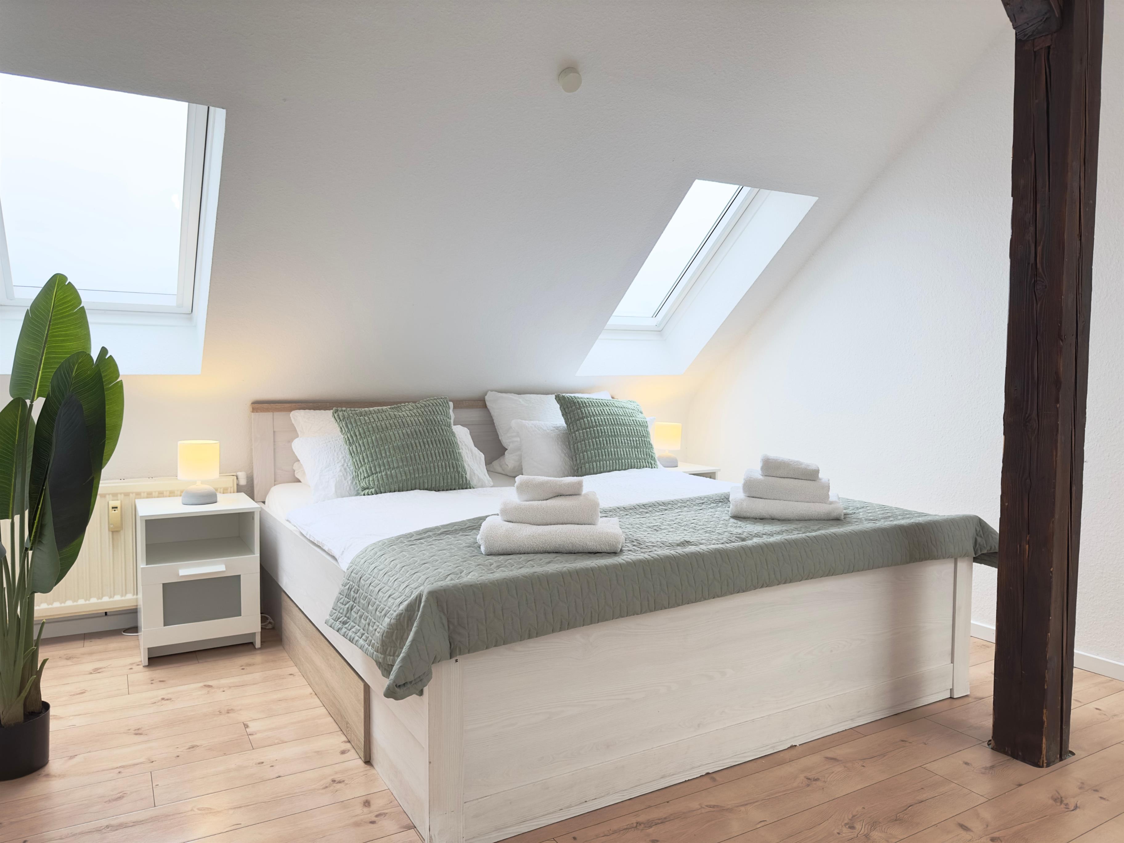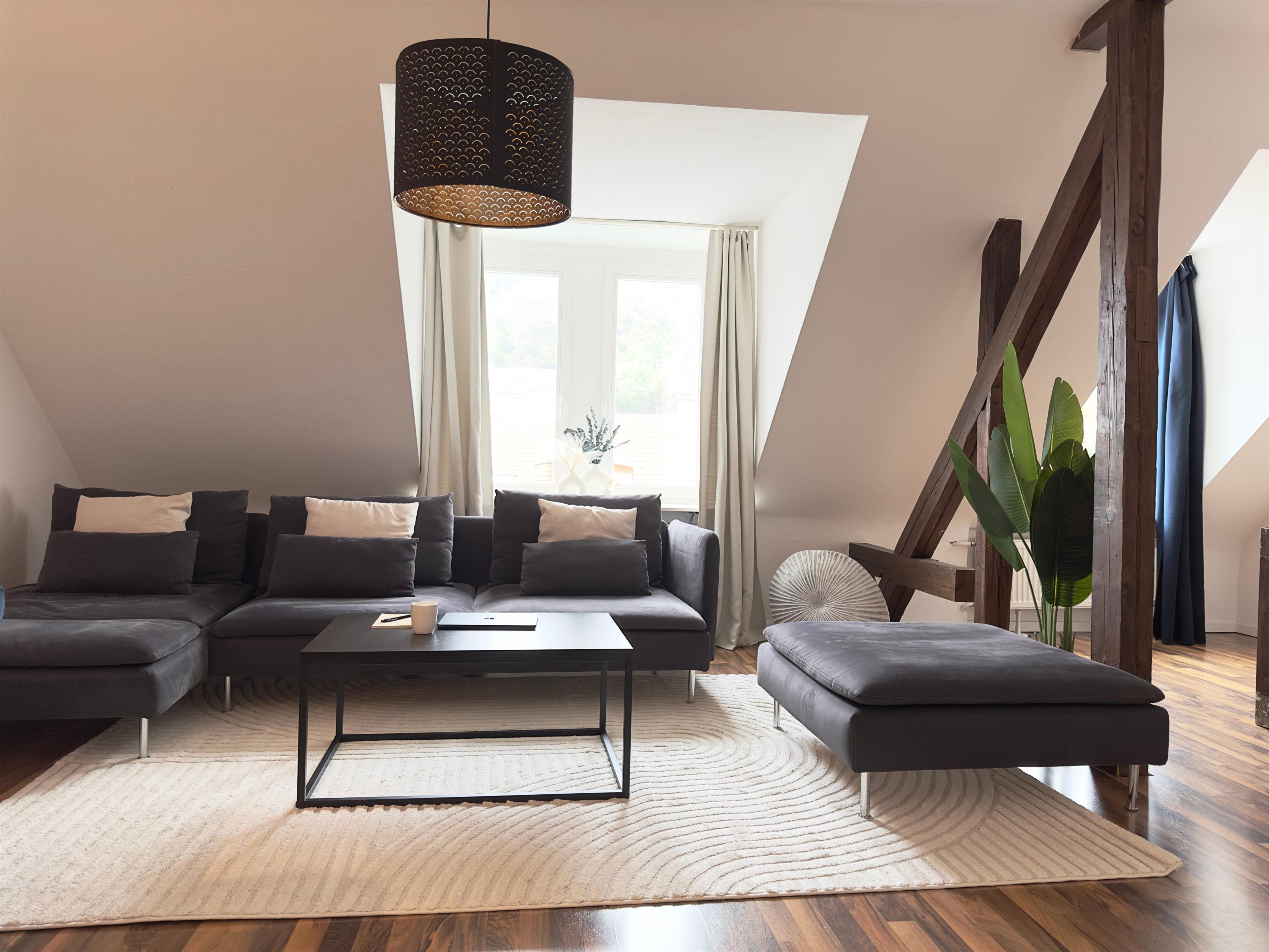 Das vollmöblierte Dachgeschoss Maisonette Apartment befindet sich direkt im Stadtzentrum eines Mehrfamilienhauses mit wunderschönem Ausblick.
