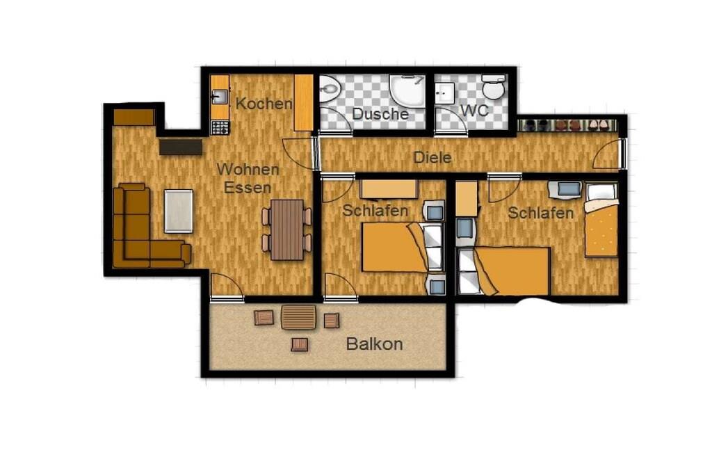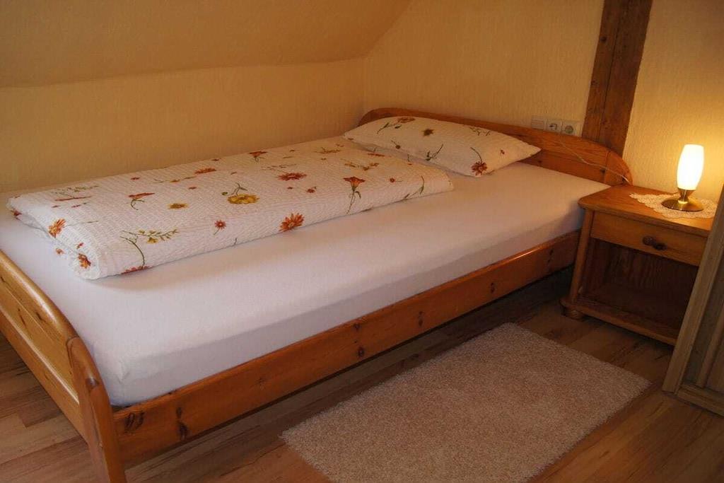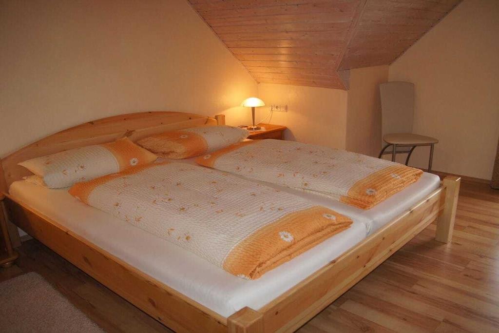 Føl dig hjemme i vores velholdte ejendom med stor have og gårdhave. Den 62 m² store loftslejlighed består af: 1 soveværelse med dobbeltseng, 1 værelse med flere soveværelser, stue med spiseplads, tekøkken, badeværelse og separat toilet. Lejlighedens højdepunkt er den store sydvendte balkon med en smuk udsigt over Rohrach-dalen.