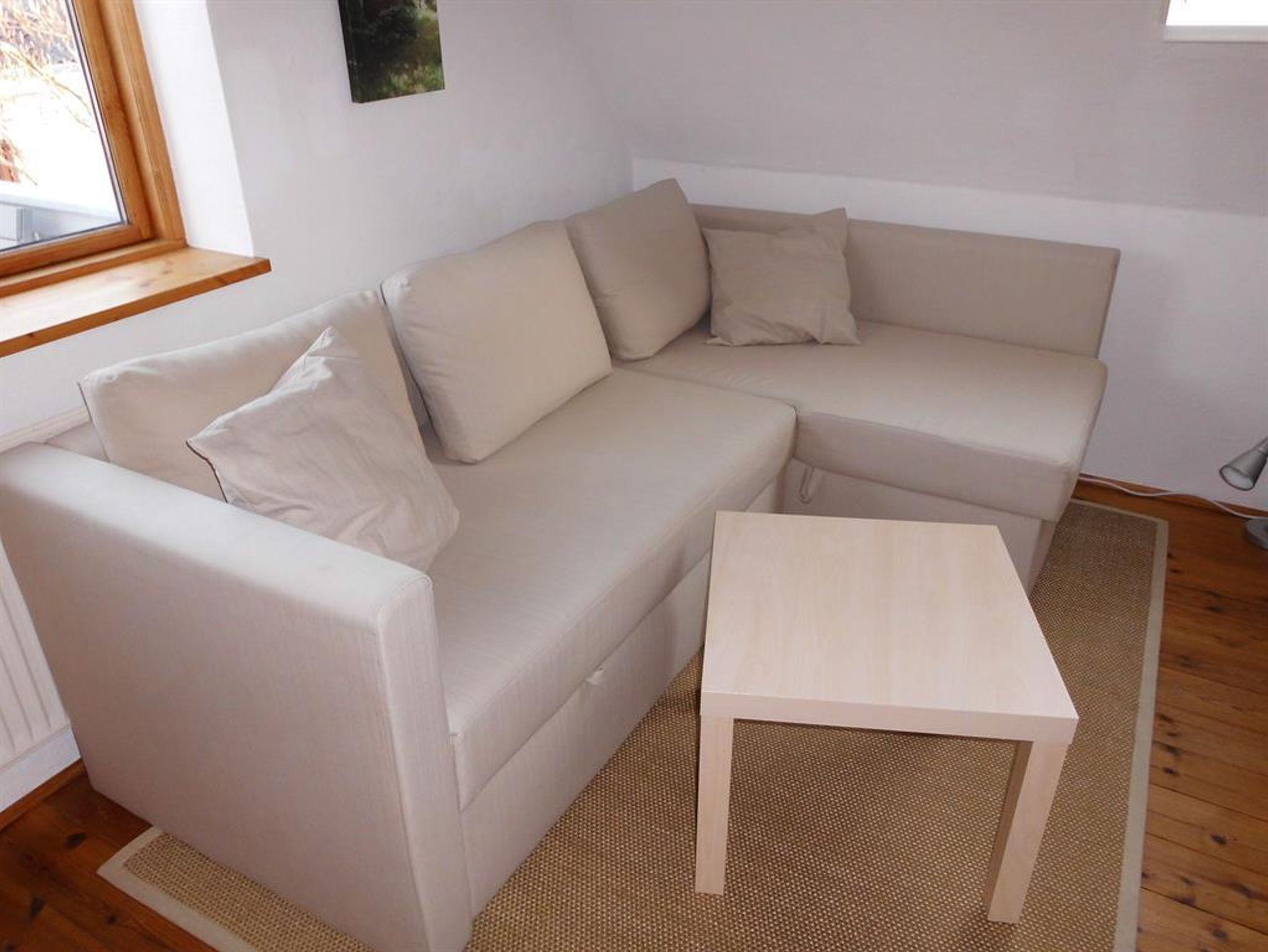 Vom Esszimmer gelangen Sie über eine massive Holztreppe in den Wohnraum. Der Wohnraum ist mit einem gemütlichen Schlafsofa (140 x 200) sowie einem Fernseher, CD und DVD Player ausgestattet. Angrenzend an den Wohnraum befindet sich ein kleines, mit hellen Fliesen ausgestattetes Duschbad.