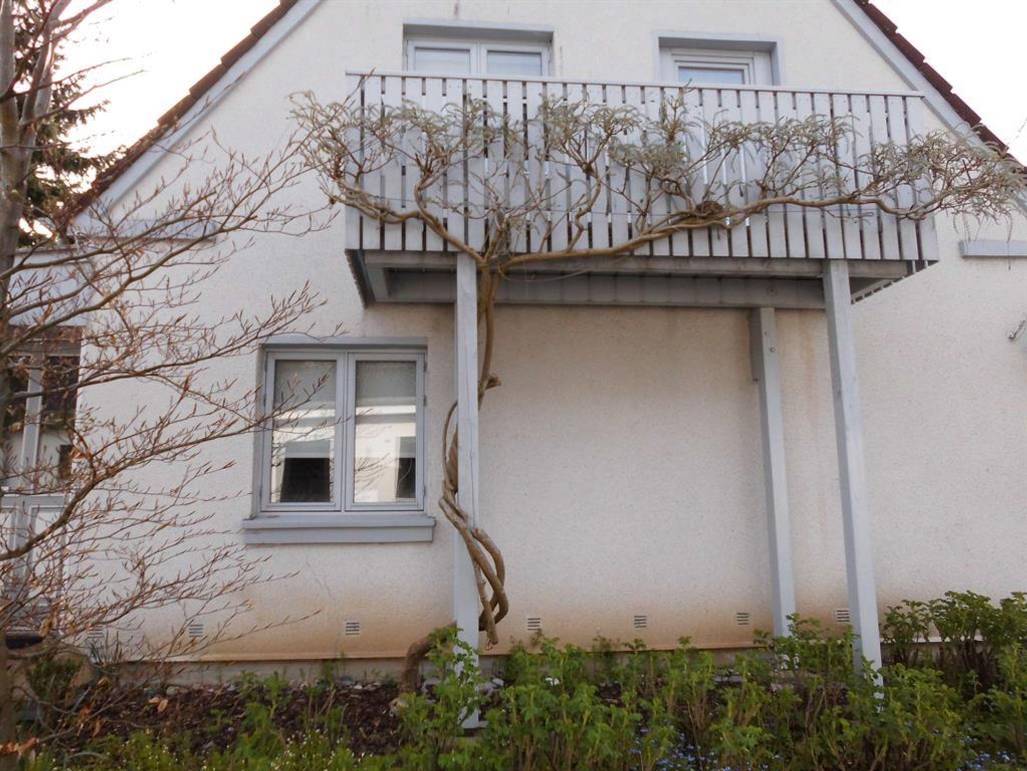 Zu der Wohnung gehört ein Balkon mit Gartenmöbeln und Sonnenschirm, auf dem man schöne gemeinsame Stunden verbringen kann.