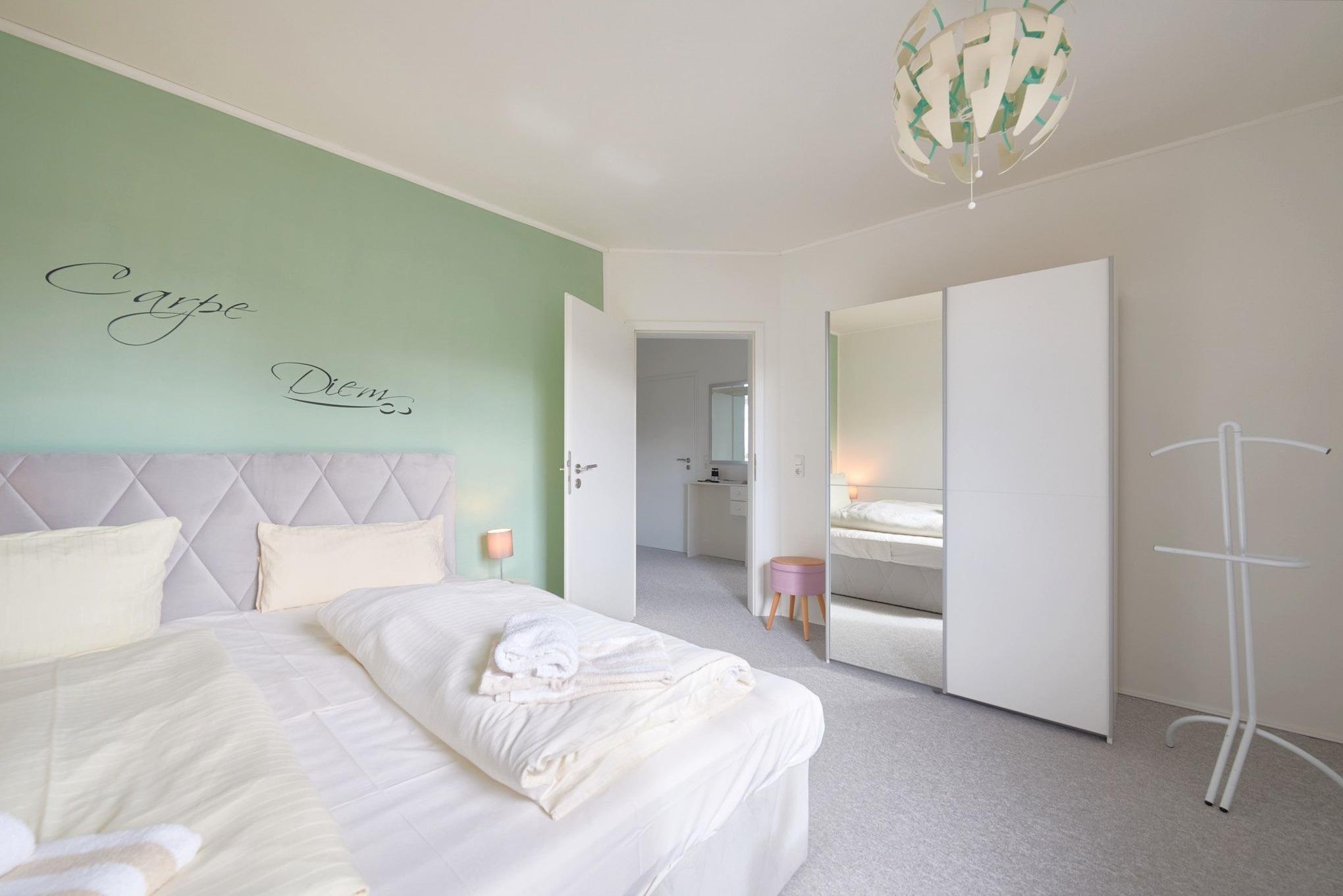 Schlafzimmer: 1 Doppelbett (180x200 cm), Kleiderschrank, Verdunkelung
