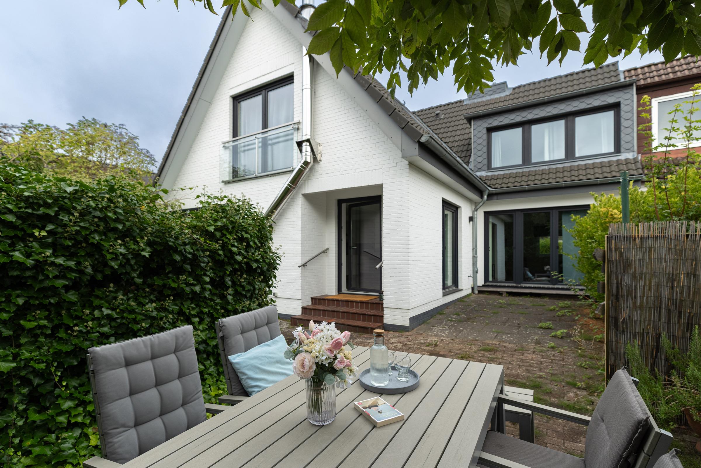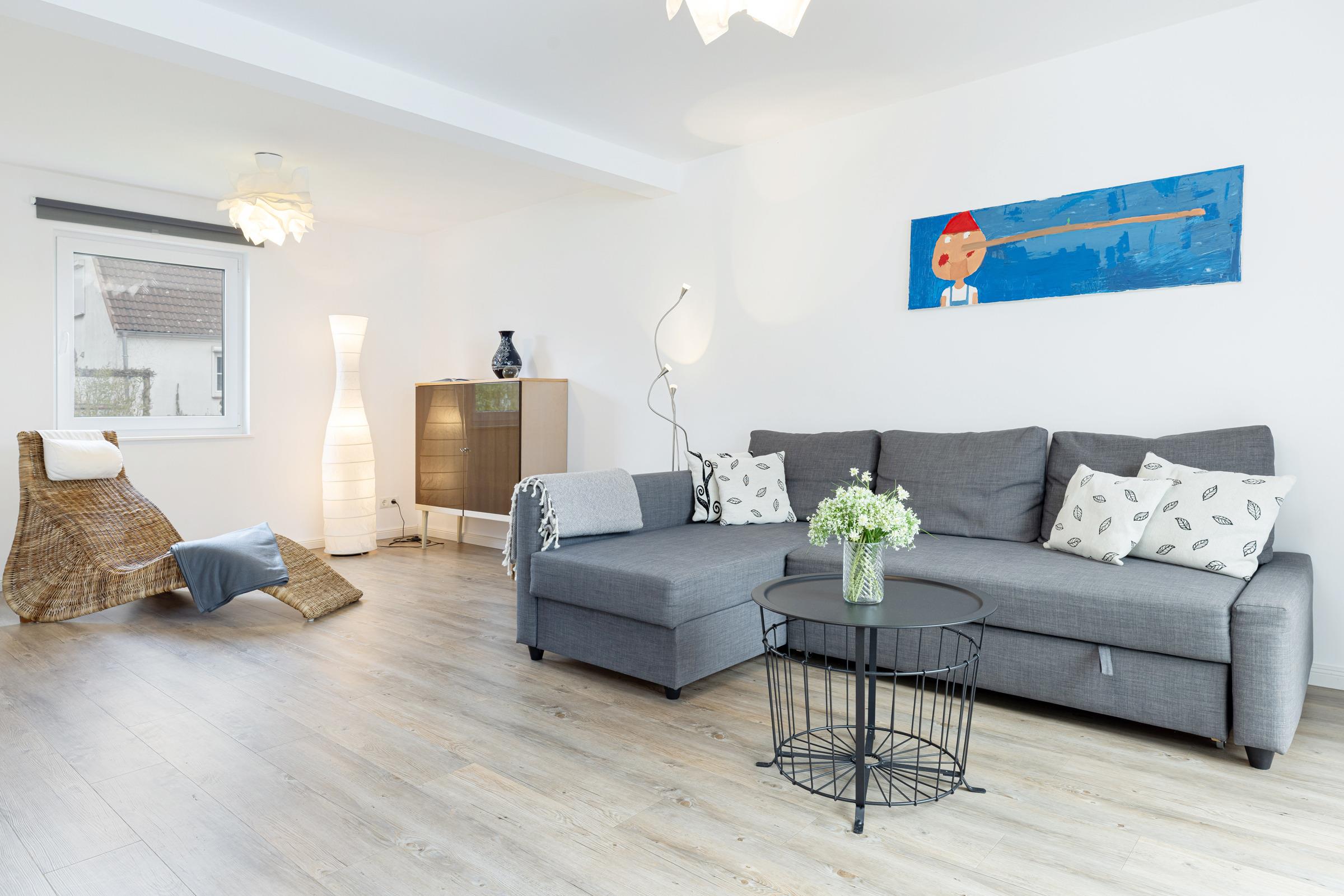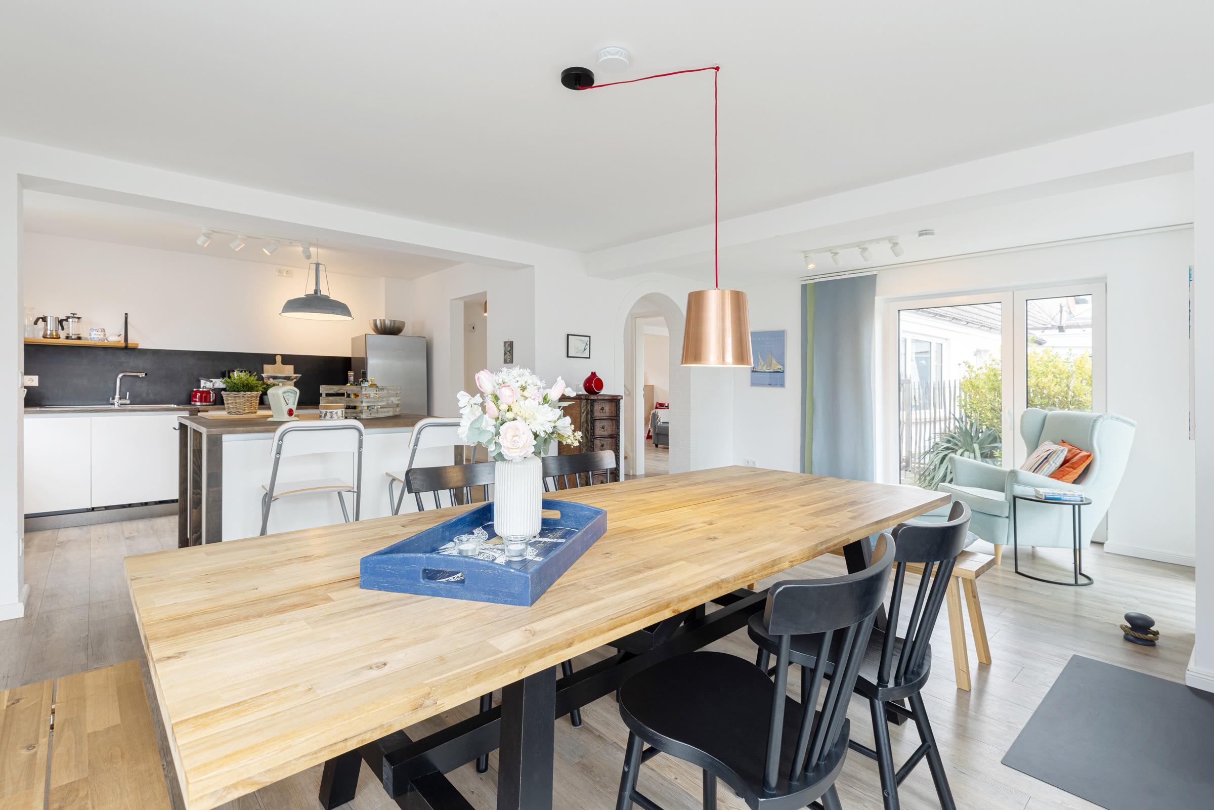 Im Erdgeschoss ist die geräumige, voll ausgestattete Wohnküche mit großen Esstisch, weiteren Sitzgelegenheiten und direktem Zugang zur sichtgeschützten Terrasse und dem großen Garten. Im angrenzenden Wohnzimmer mit Schlafcouch haben Sie ausreichend Platz für kuschelige Stunden vor dem Fernseher. Auch vom Wohnzimmer gelangen Sie auf die Terrasse und in den Garten. Für gemeinsame Grillabende steht Ihnen ein Holzkohlegrill zur Verfügung. Im gesamten Erdgeschoß genießen Sie die Wärme durch eine Fußbodenheizung.