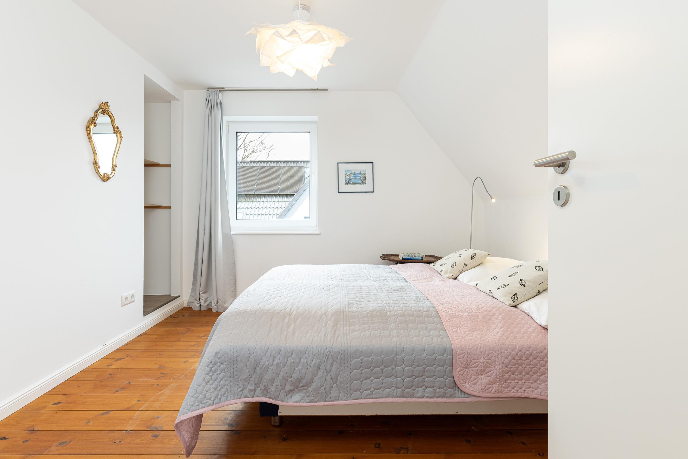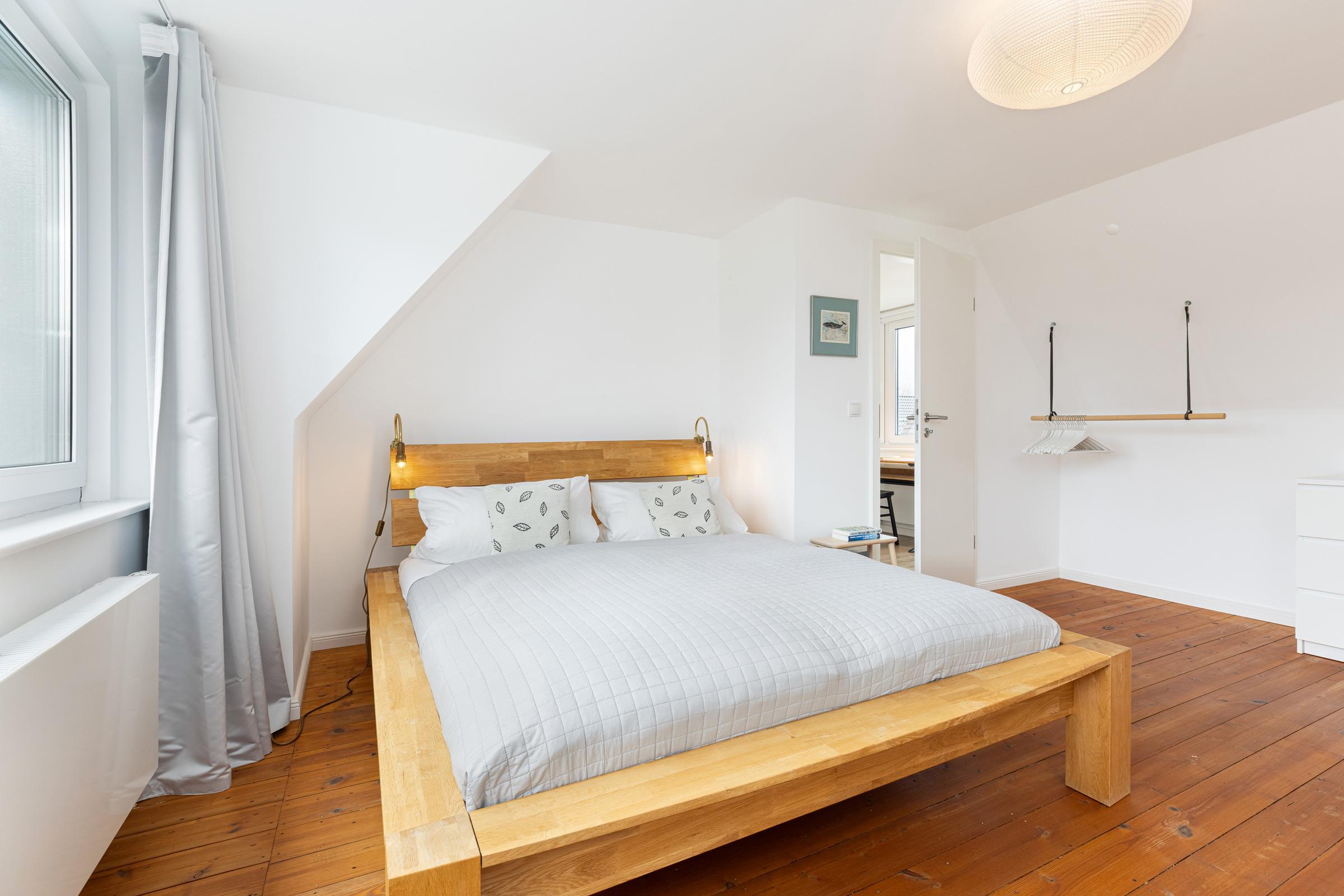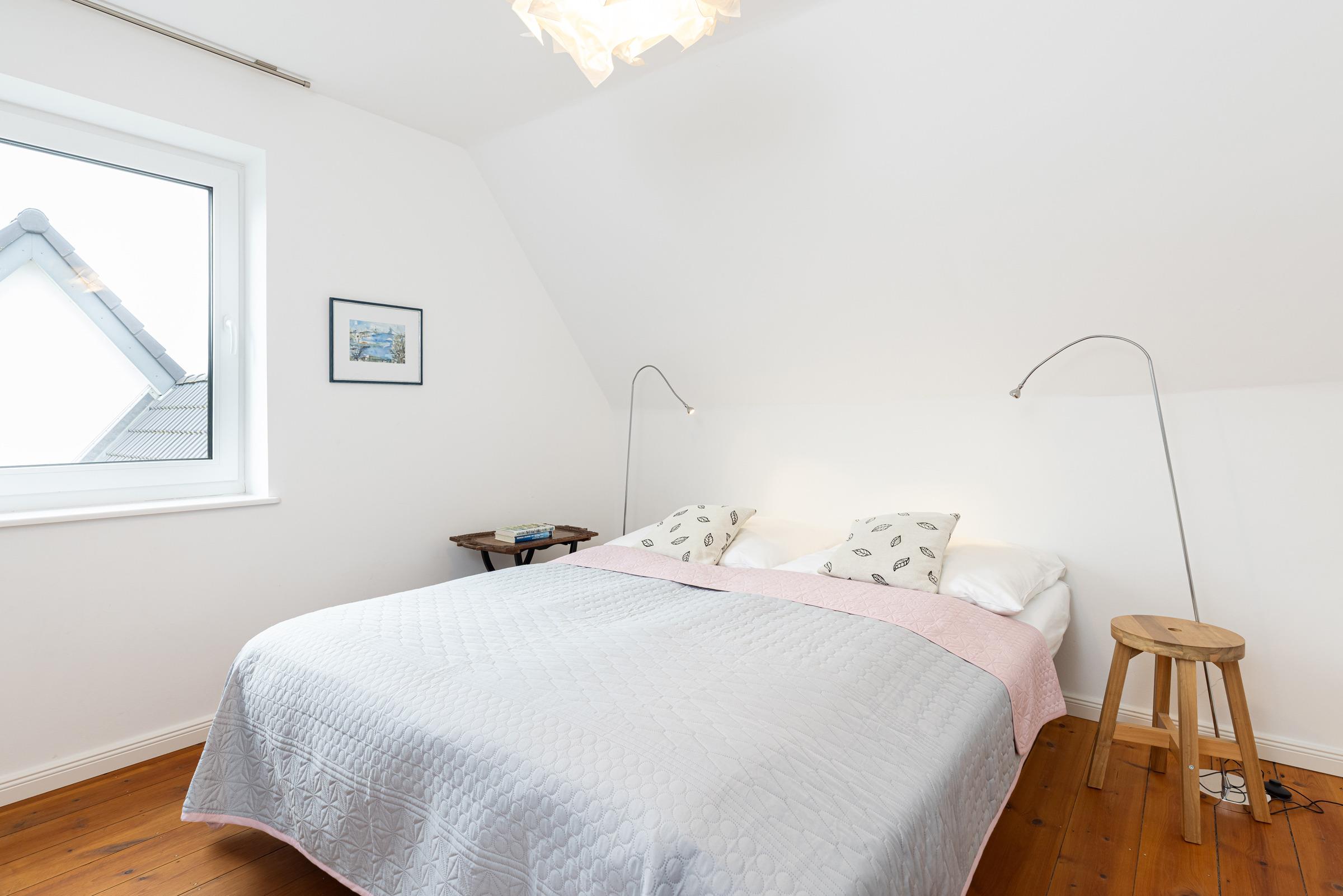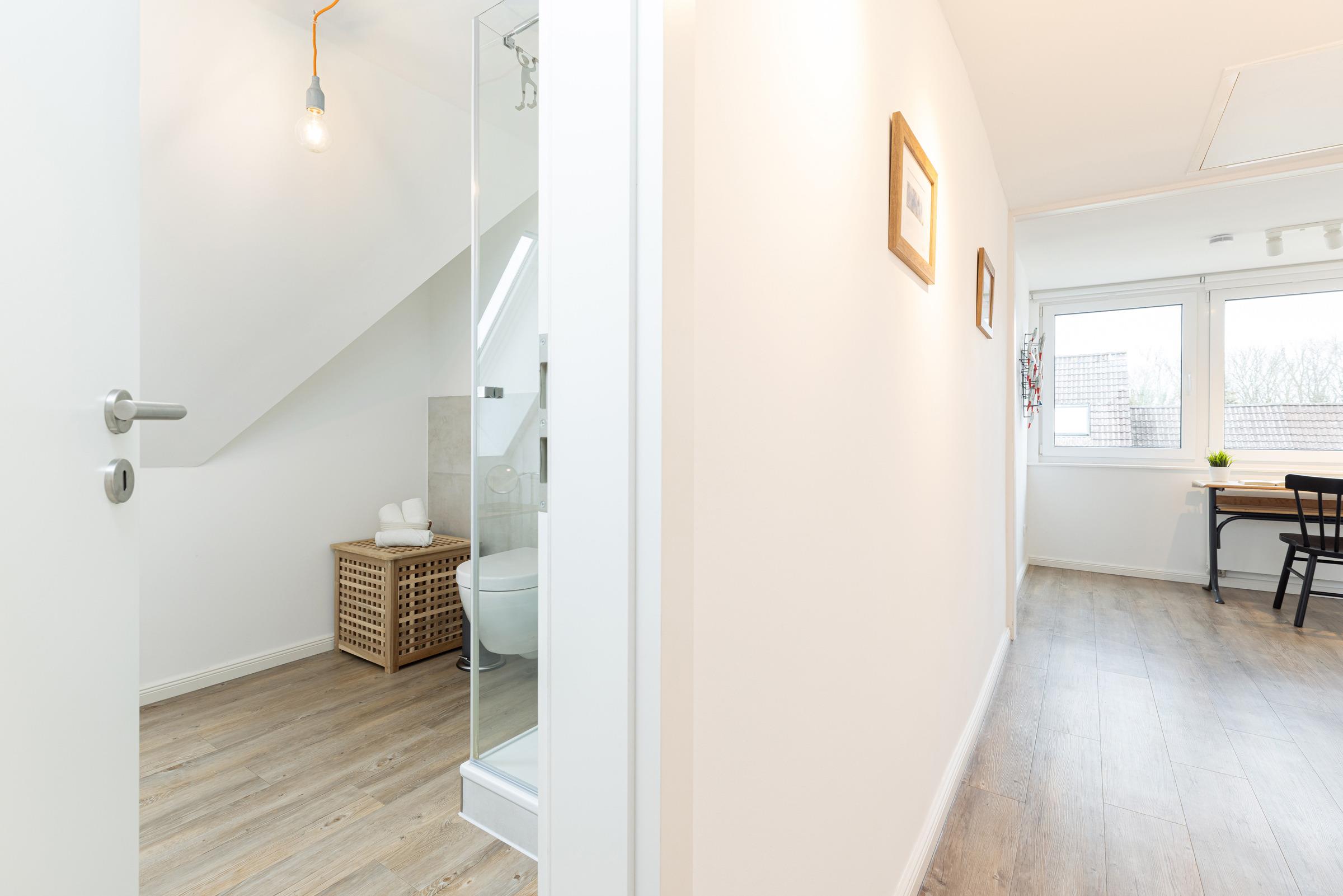 In der ersten Etage sind zwei separate Schlafzimmer. Ein Schlafzimmer mit Doppelbett (160x200 cm) sowie ein weiteres Schlafzimmer mit einer Schlafcouch (160x200 cm) und einem Einbauschrank. Sie haben die Wahl, auf beiden Etagen befindet sich ein modernes Duschbad mit Tageslicht. Ein Arbeitsplatz mit Internetanschluss ist in der Gaube des geräumigen Flurs im Obergeschoss gegeben.