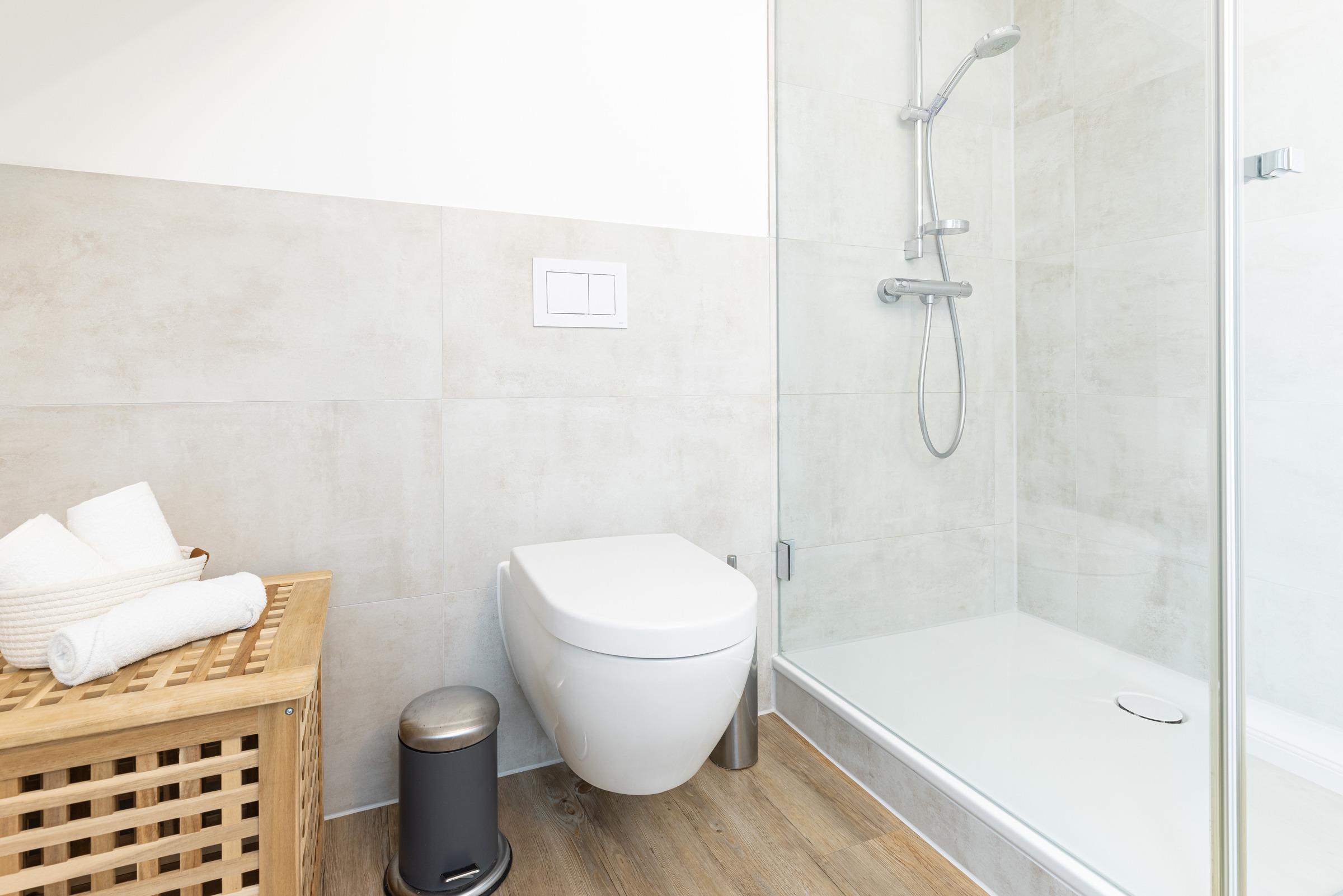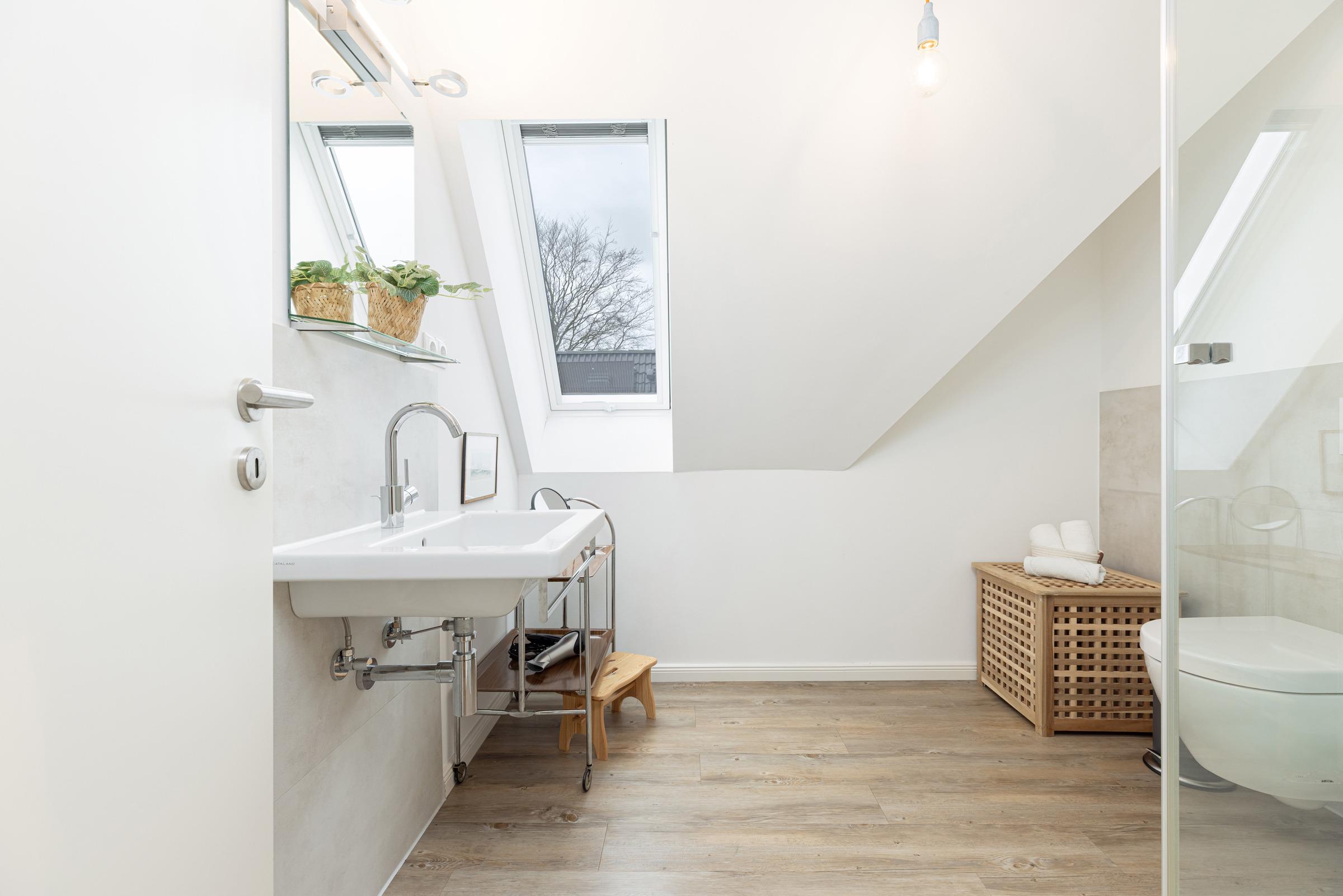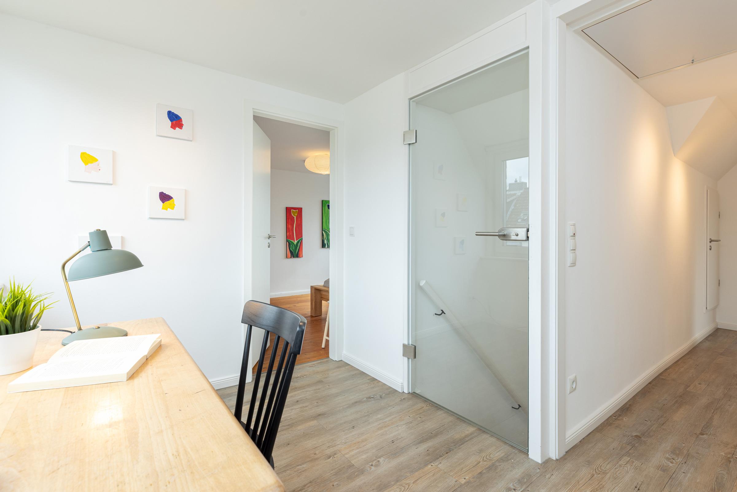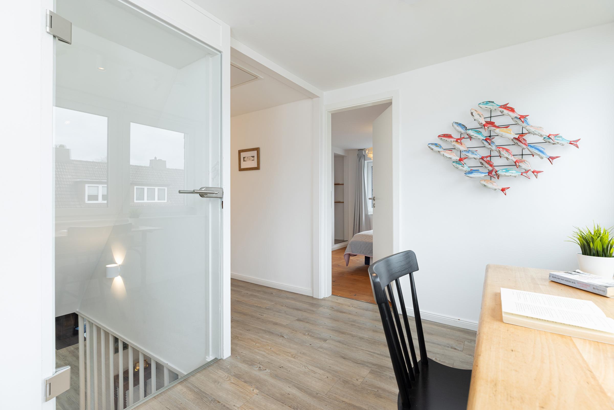In der ersten Etage sind zwei separate Schlafzimmer. Ein Schlafzimmer mit Doppelbett (160x200 cm) sowie ein weiteres Schlafzimmer mit einer Schlafcouch (160x200 cm) und einem Einbauschrank. Sie haben die Wahl, auf beiden Etagen befindet sich ein modernes Duschbad mit Tageslicht. Ein Arbeitsplatz mit Internetanschluss ist in der Gaube des geräumigen Flurs im Obergeschoss gegeben.