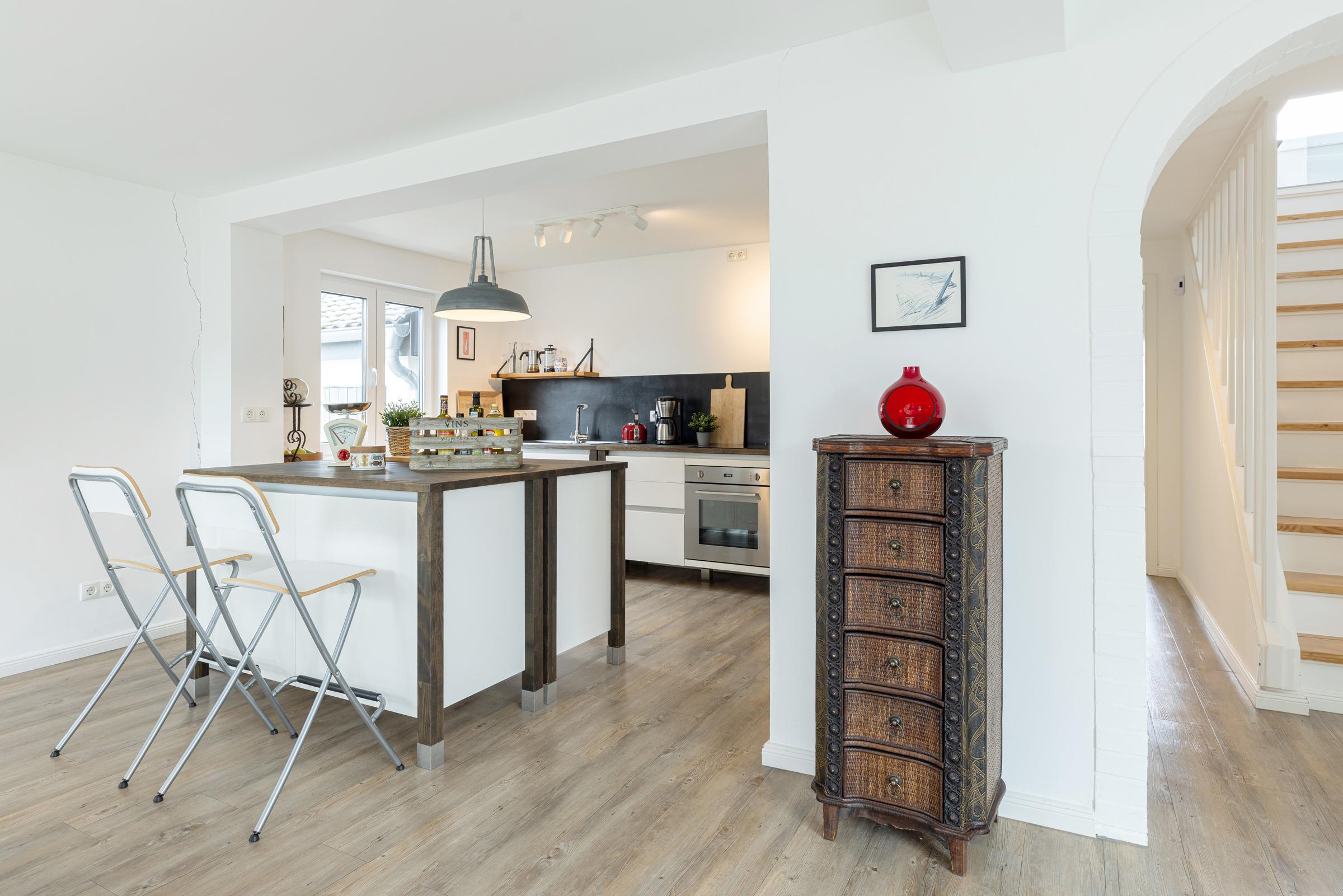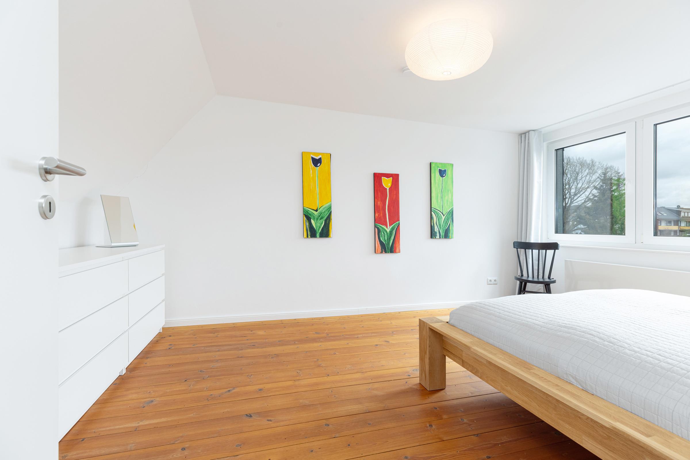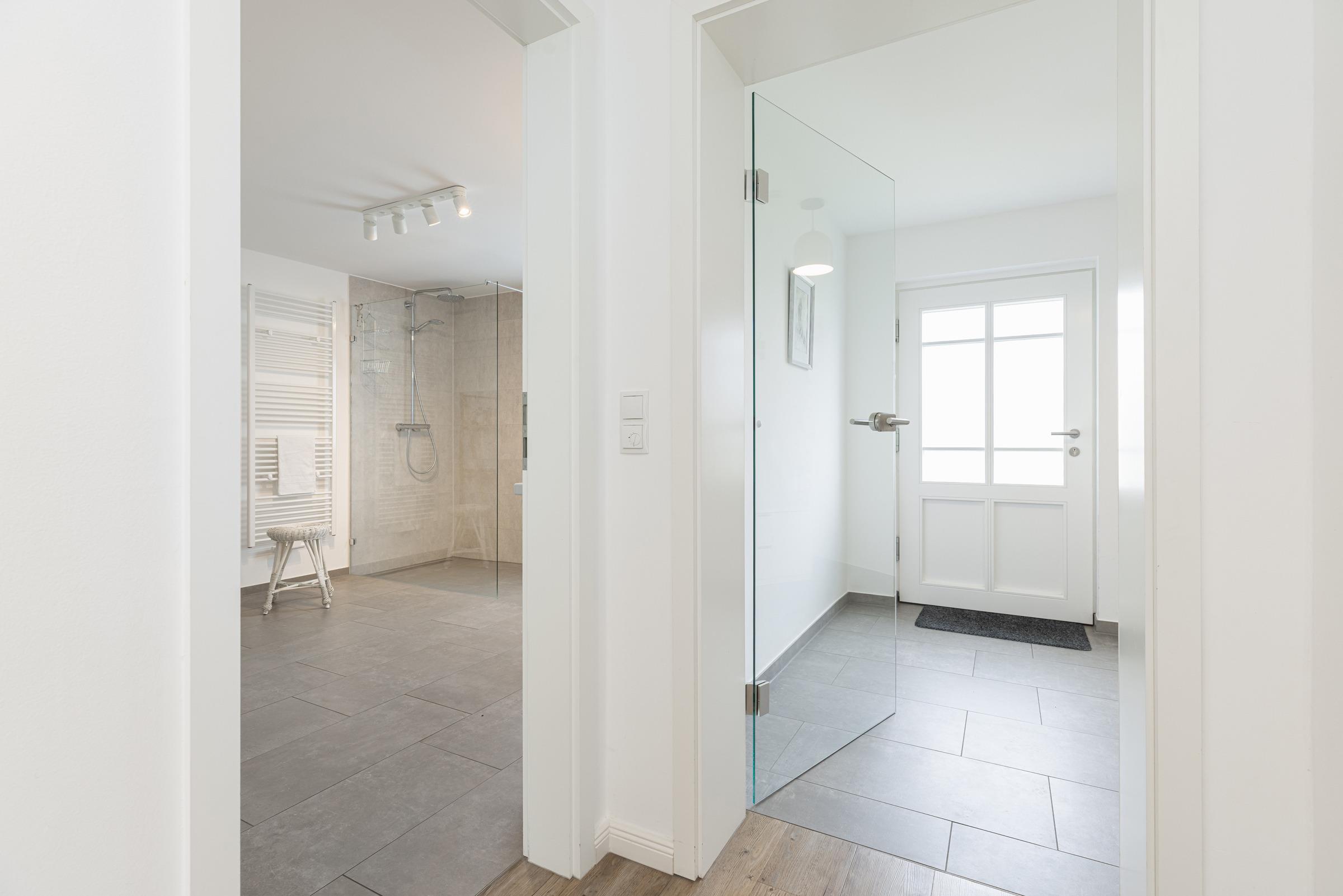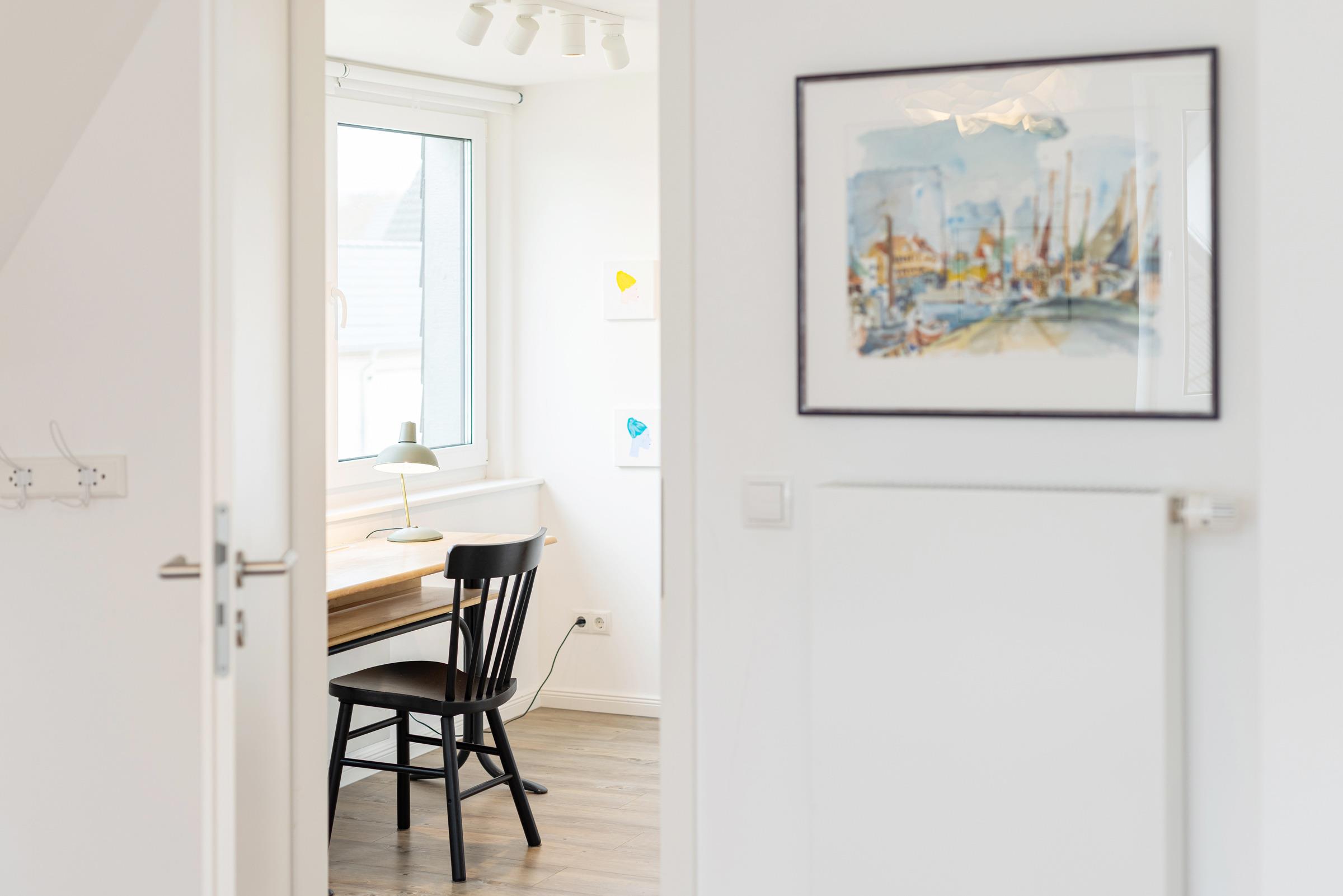 In der ersten Etage sind zwei separate Schlafzimmer. Ein Schlafzimmer mit Doppelbett (160x200 cm) sowie ein weiteres Schlafzimmer mit einer Schlafcouch (160x200 cm) und einem Einbauschrank. Sie haben die Wahl, auf beiden Etagen befindet sich ein modernes Duschbad mit Tageslicht. Ein Arbeitsplatz mit Internetanschluss ist in der Gaube des geräumigen Flurs im Obergeschoss gegeben.