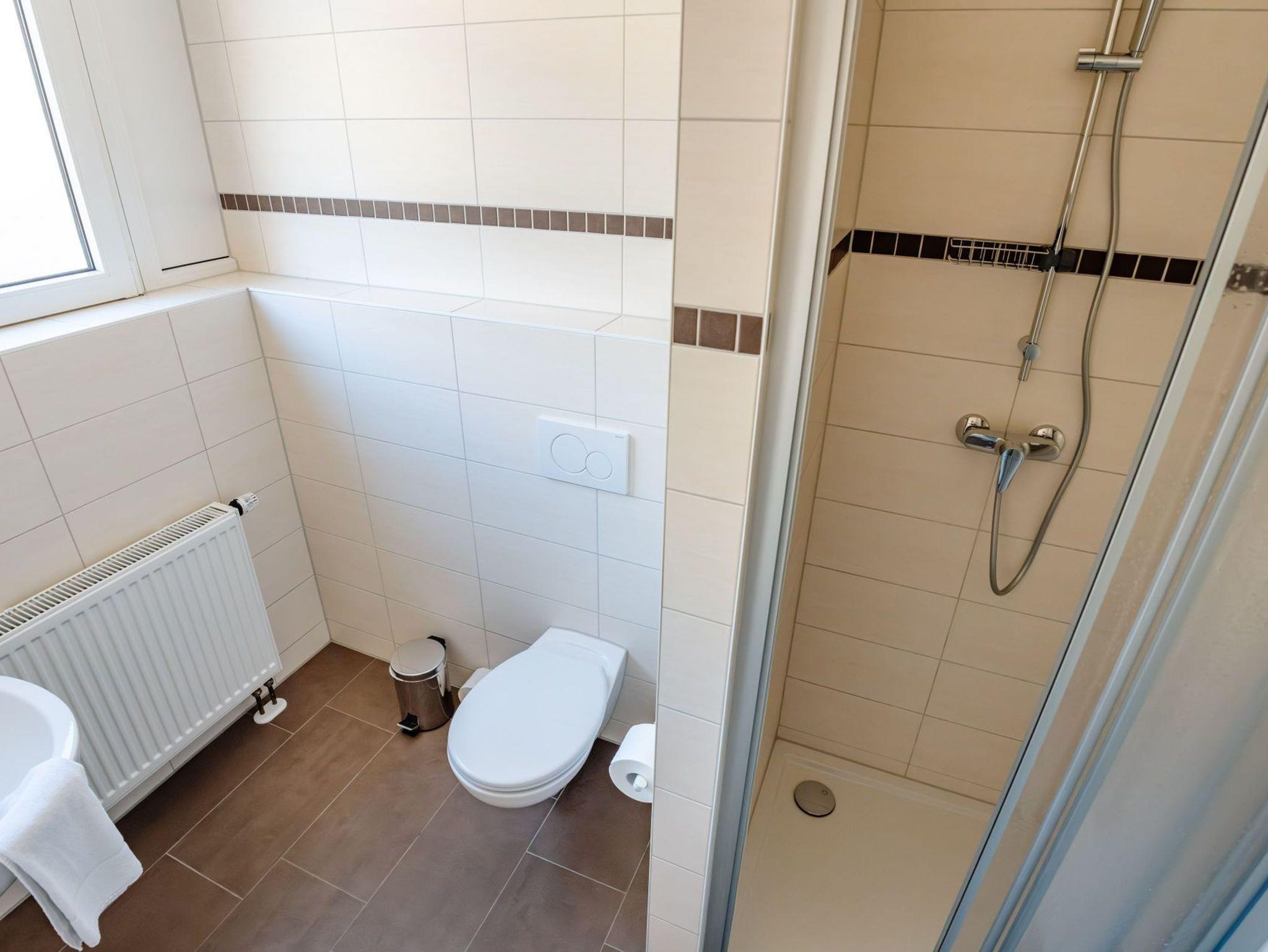 Das eigene Badezimmer mit WC und Dusche befindet sich gegenüber und ist vom Flur zugänglich.