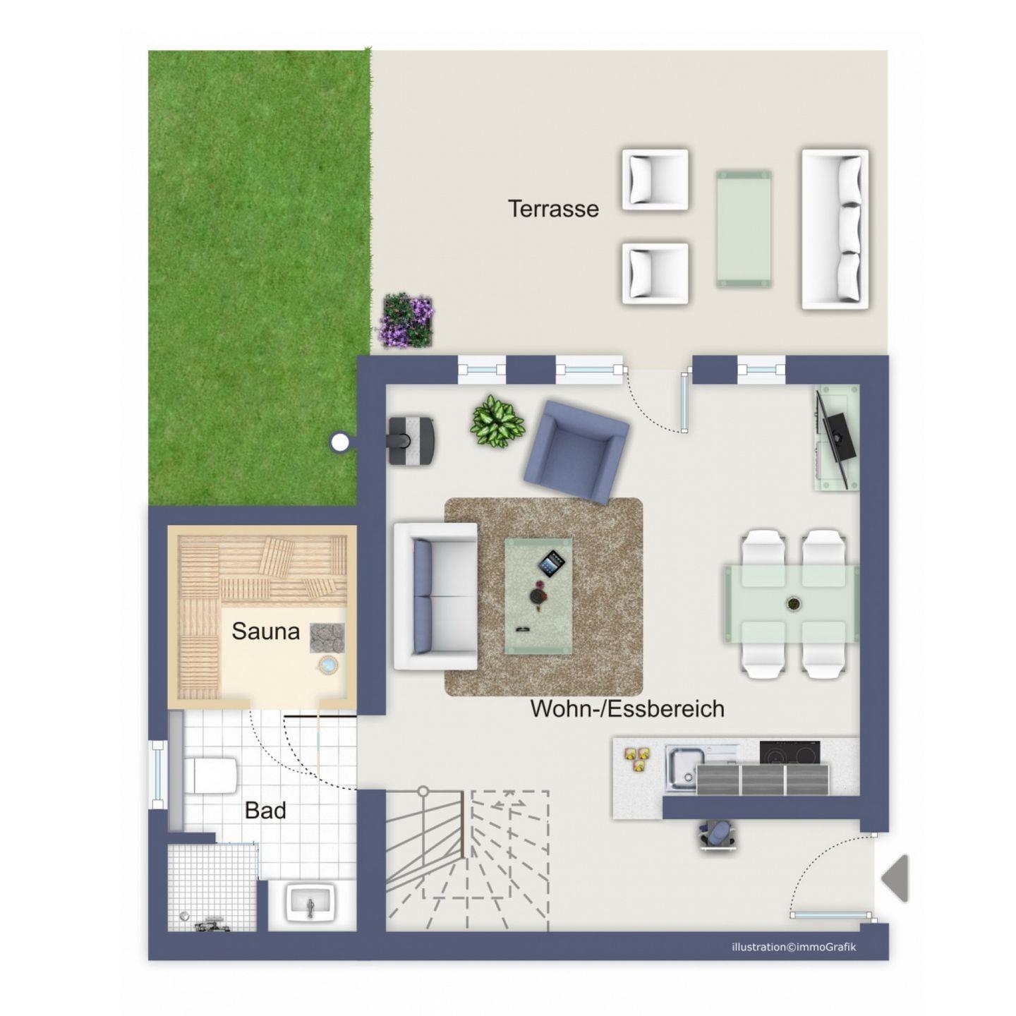 Zum Tageslichtbad im Untergeschoss mit Dusche und WC gehören ein Waschtisch mit beleuchtetem Spiegel sowie ein Föhn. Im gesamten Erdgeschoss sind Bodenfliesen mit Fußbodenheizung verlegt. Die Schlafräume im Obergeschoss sind mit einem Laminatboden ausgestattet. In dieser Nichtraucherwohnung sind Haustiere nicht erlaubt.
