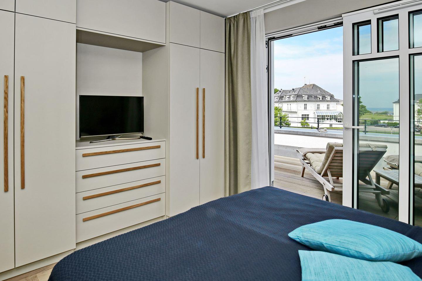 Das Schlafzimmer mit bodentiefen Fenstern ist mit einem komfortablen Doppelbett (2 x 90 x 200 cm) und einem Flatscreen-TV eingerichtet. Ihr Urlaubsgepäck können Sie im großzügigen Entree verstauen.
