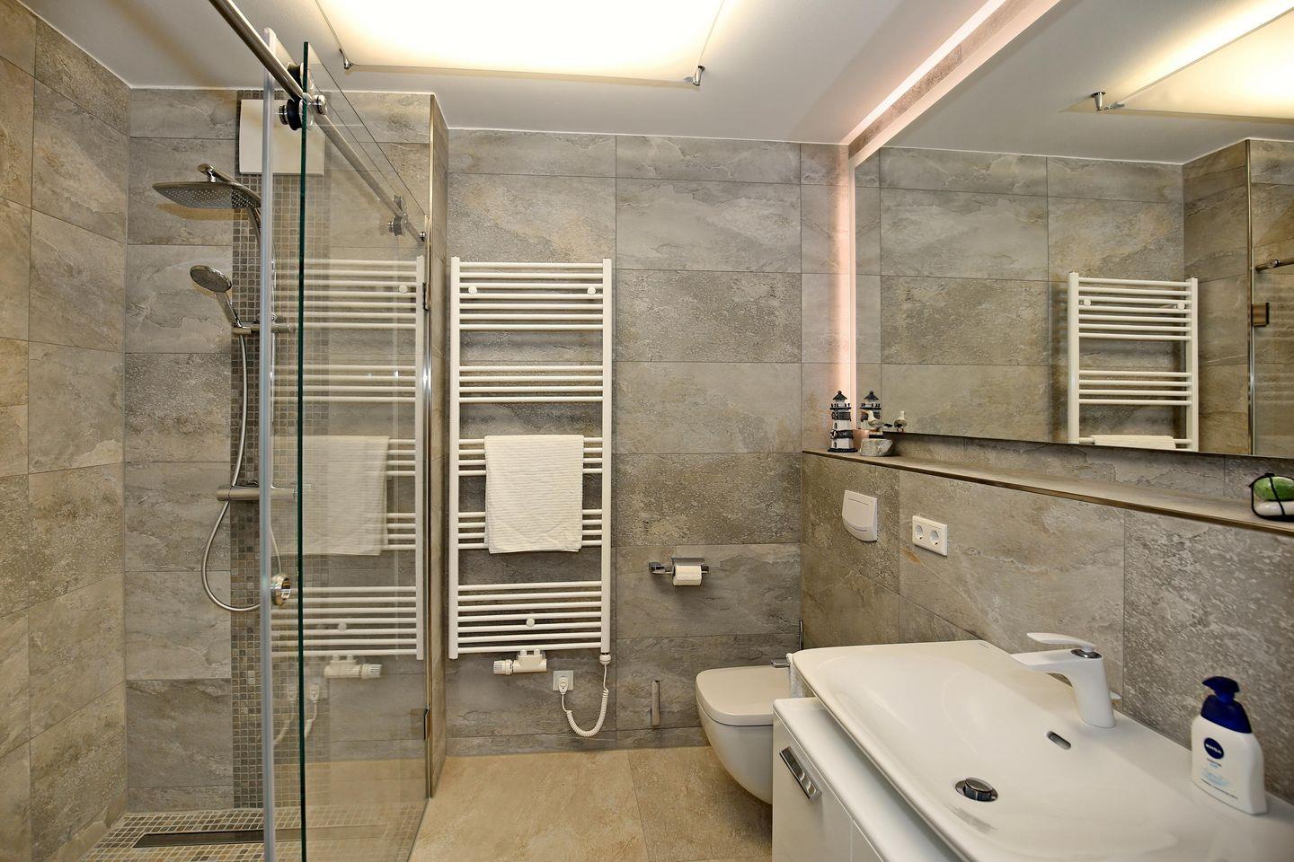 Zur Ferienwohnung gehört ein modernes Duschbad mit einer ebenerdigen Dusche und einem Föhn. Das großzügige Bad ist behindertenfreundlich eingerichtet. In der Wohnung sind Bodenfliesen verlegt. Die Fußbodenheizung in allen Wohnräumen sorgt für wohlige Wärme.