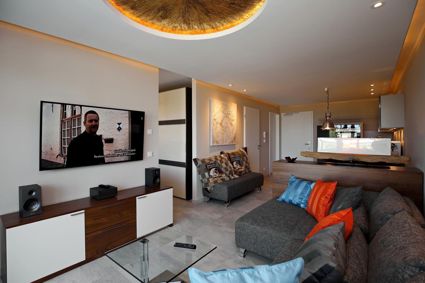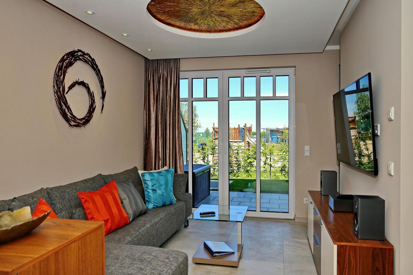 Im offen gestalteten Wohnbereich lädt eine moderne Couch mit passenden Sesseln zu gemütlichen Stunden vor dem Flatscreen-TV ein. Zur weiteren Unterhaltung stehen Ihnen ein DVD-Player, eine Stereoanlage mit CD-Player sowie ein kostenloser WLAN-Zugang zur Verfügung. Der Essbereich ist im Wohnbereich integriert.