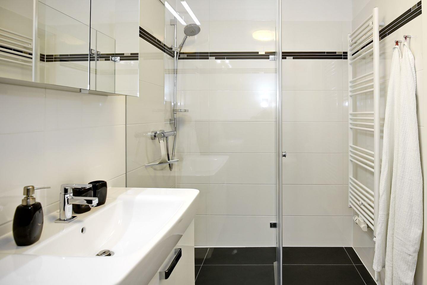 Das moderne Duschbad der Ferienwohnung verfügt über eine ebenerdige Dusche und einen Spiegelschrank. Ein Föhn, ein Kosmetikspiegel sowie ein Handtuchheizkörper vervollständigen die Badeinrichtung. In der gesamten Wohnung sind Bodenfliesen verlegt. In allen Wohnräumen sorgt die Fußbodenheizung für wohlige Wärme. Es handelt sich um eine Nichtraucher-Wohnung. Haustiere sind in dieser Wohnung nicht gestattet.