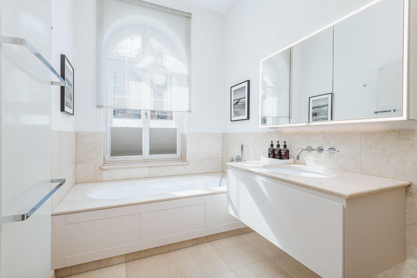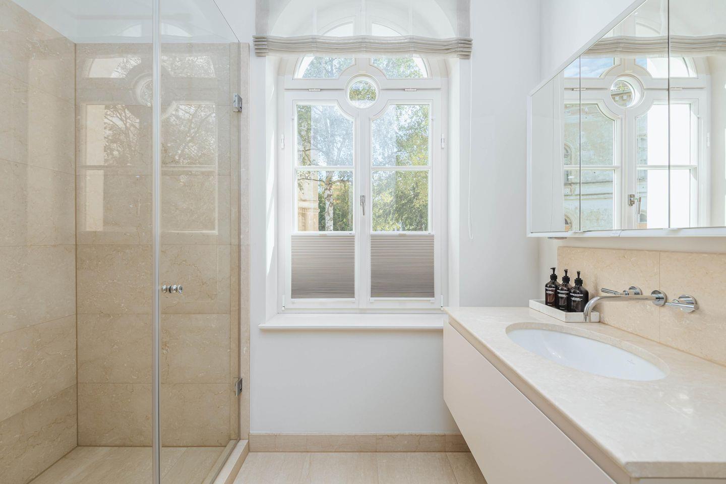 Die beiden Tageslicht-Badezimmer in Botticino Marmor sind mit extra großen Walk in Duschen sowie einer extra großen Badewanne, einem Waschtisch mit großzügiger Ablage und Armaturen der Firma Dornbracht, einem Badezimmerregal, einem Kosmetikspiegel und Fön ausgestattet.