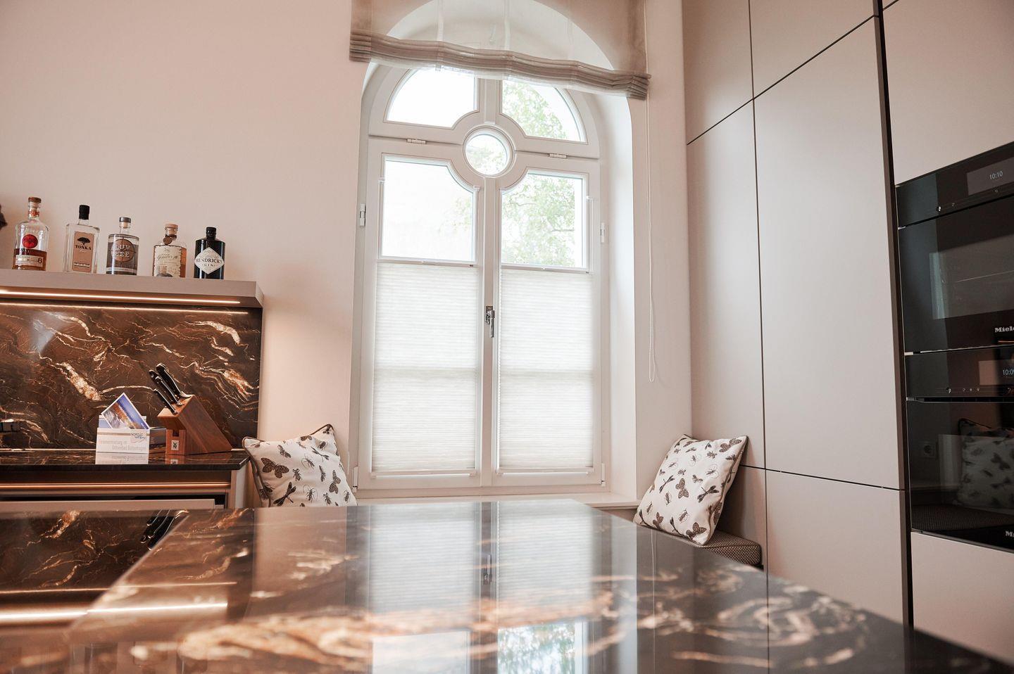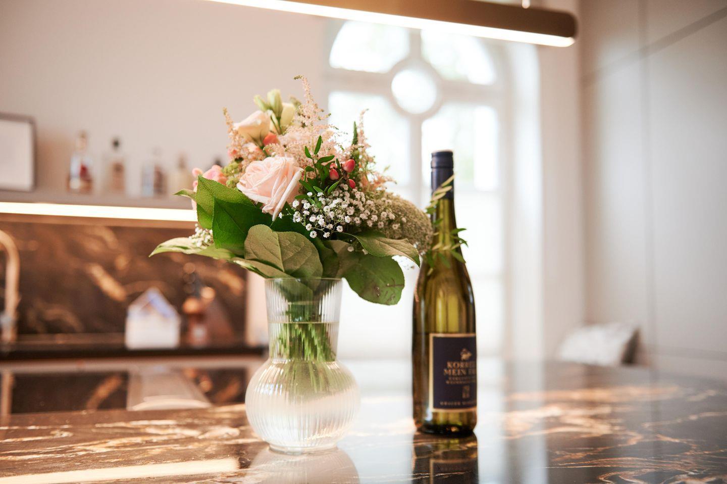 Die voll ausgestattete, großzügige Siematic-Küche mit Weinkühlschrank, Kühlschrank mit Ice Maker, Gefrierschrank, Backofen, Bora Induktions-Kochfeldern, Dampfgarer, Mikrowelle, Nespresso-Kaffeemaschine und Kitchen Aid Geräte wie Filterkaffeemaschine, Wasserkocher, Toaster, Blender und Handrührgerät lassen keine Wünsche offen, falls man auch selber Mahlzeiten zubereiten möchte.