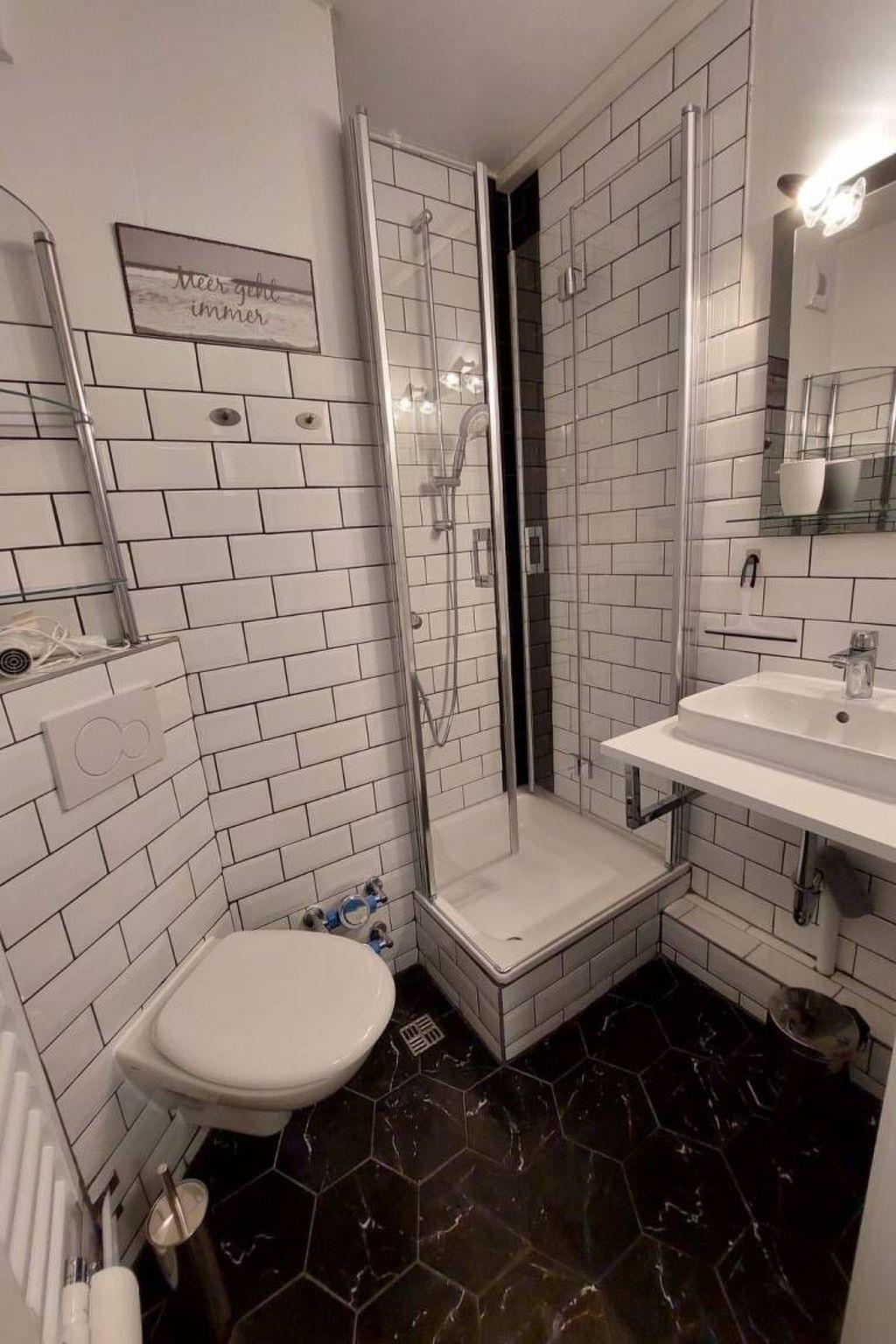 Heating, towel warmer, WC, washbasin with console holder incl. towel rails, shower cubicle, mirror with shelf, hairdryer, make-up mirror, hot water.
