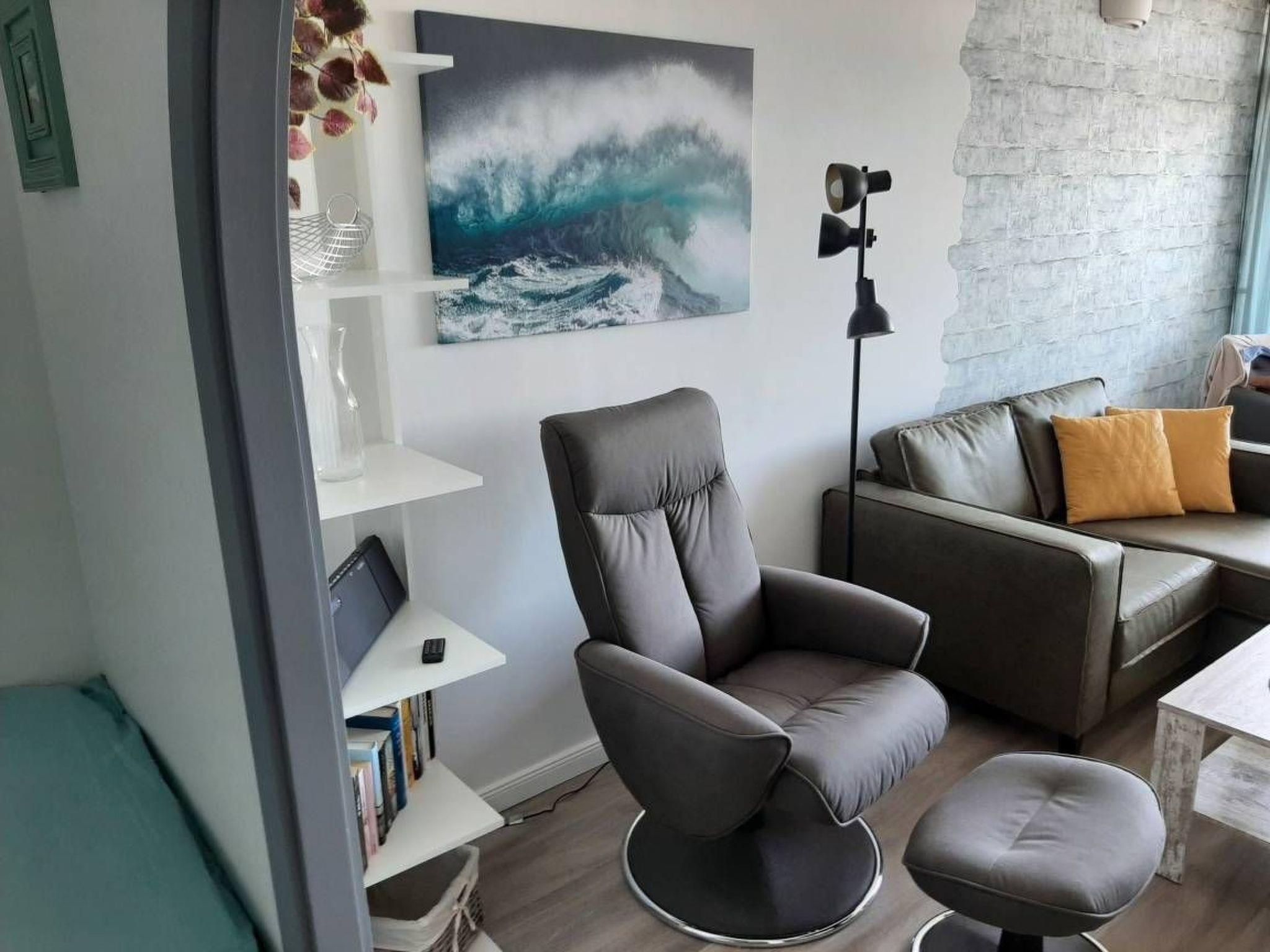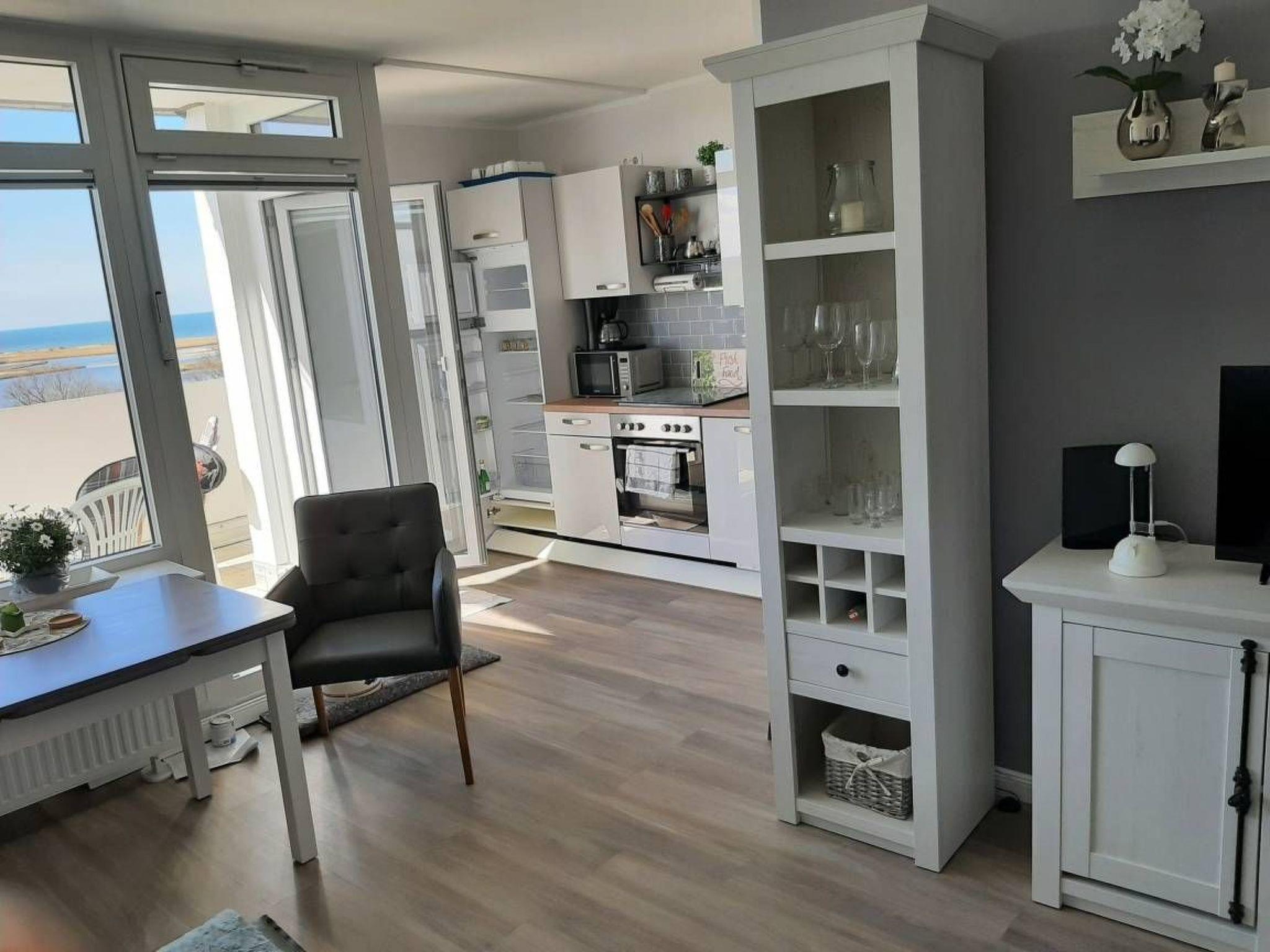 Lamps on the walls, WLAN, heating, games collection, books, large window front with pleated blind and view of the Baltic Sea and nature reserve, table and 2 leather armchairs, exit balcony.