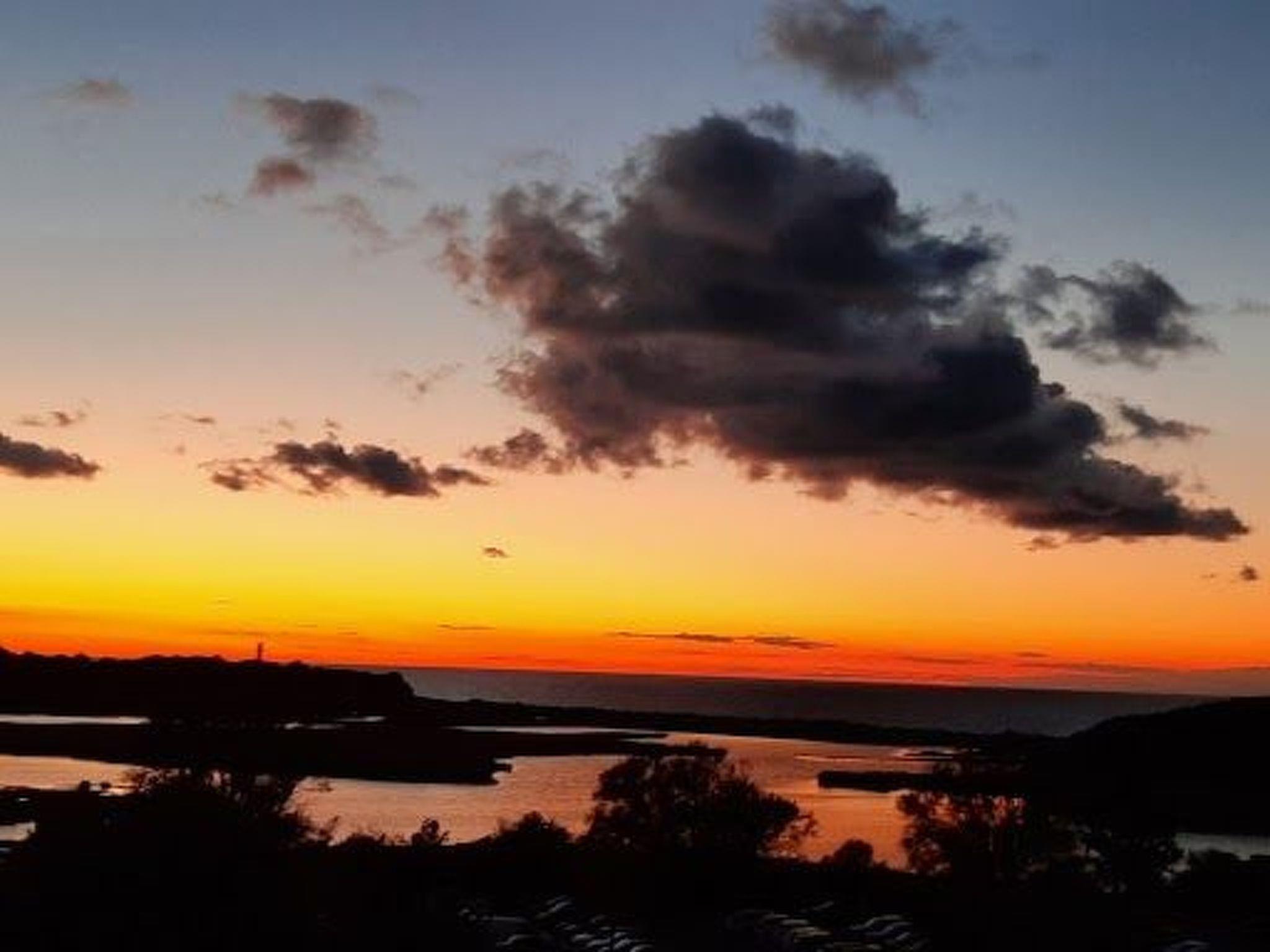 Partly covered, awning, furnished with table, 2 adjustable chairs with cushions and footrests. Side tables, west-facing with sunset.