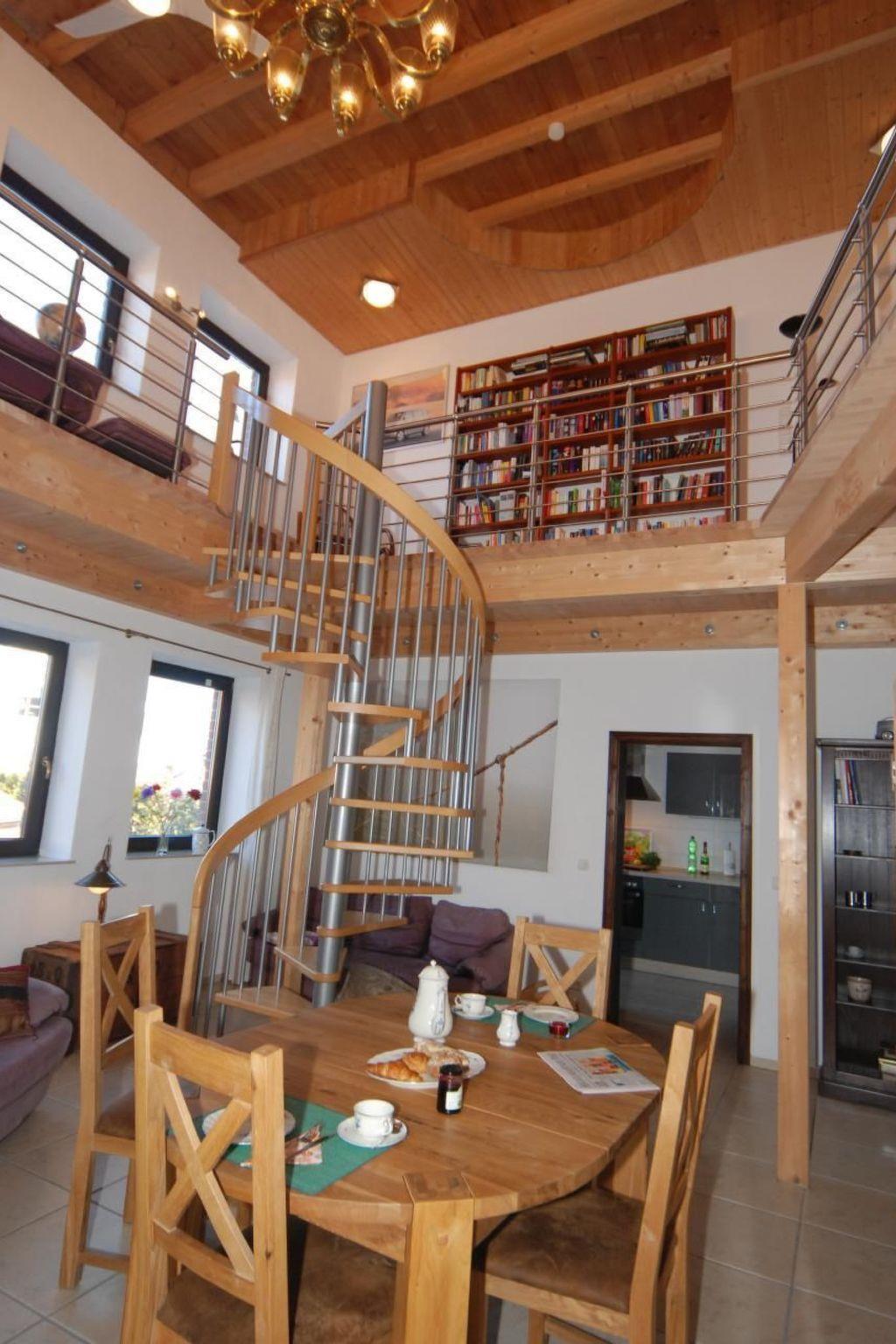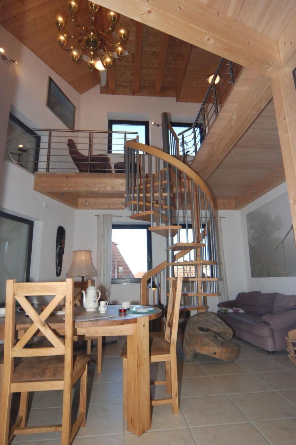 For your holiday in Heiligenhafen, we offer a high-quality overall design with superior comfort, spaciousness and a special ambience. Attractive holiday flats with a coordinated overall impression. Individually adjustable underfloor heating in every room, the furniture is made of hardwood and conveys an exclusive feeling of well-being. The spacious living room with 33 square metres of living space is equipped with a leather suite, flat screen, DVD, safe, stereo system, iPhone/ iPod dock, living to feel good and relax. A wooden spiral staircase leads through the dining room, open to the roof gable, to the gallery with library and a super panoramic view over the roofs of Heiligenhafen to the Baltic Sea, the harbour, the island of Fehmarn with Fehmarnsund Bridge. There you can retire to a comfortable leather armchair to read.