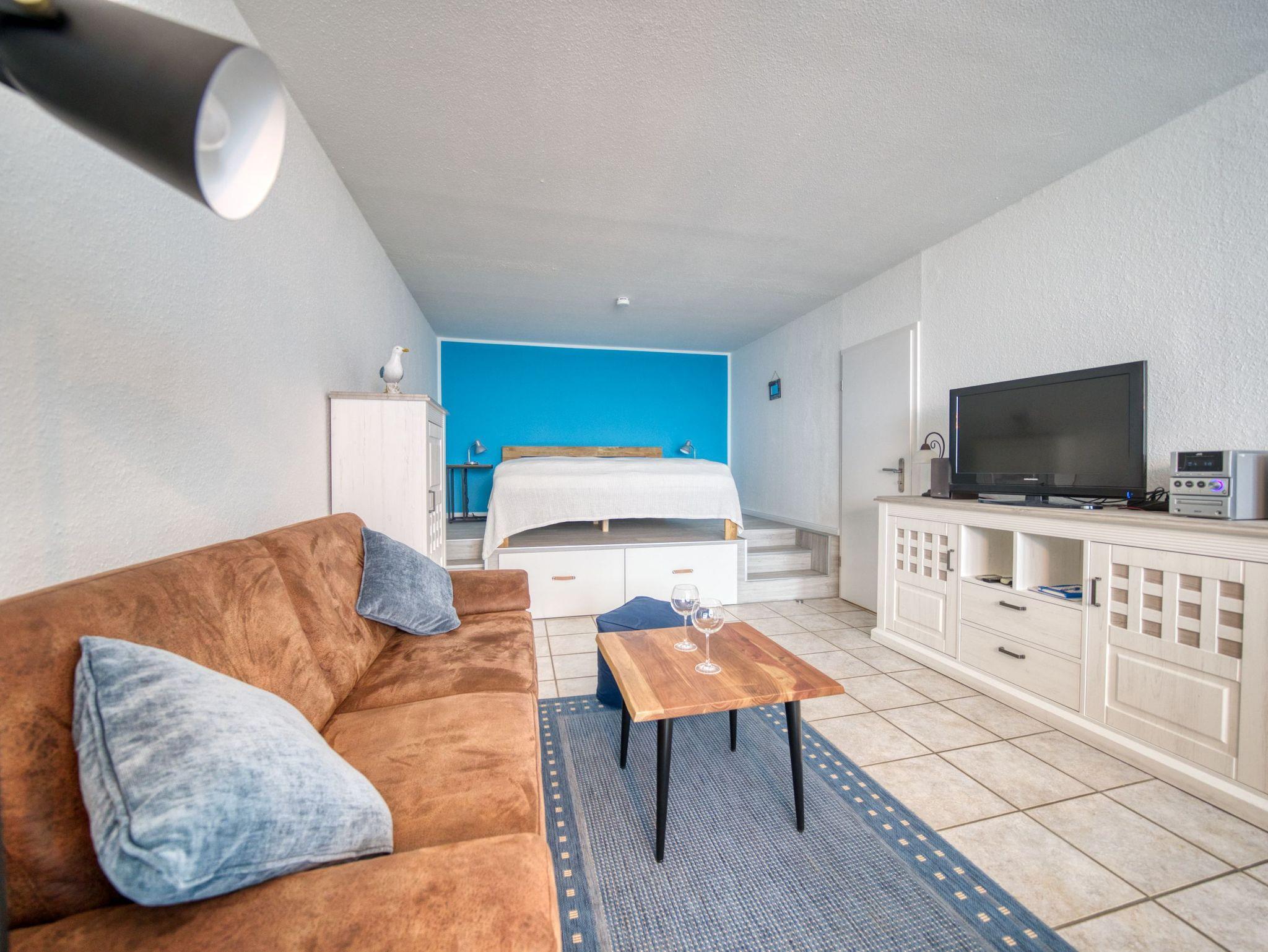 Wohn-Schlafbereich mit Doppelbett (erhöht auf einem Podest für Meeresblick beim Aufwachen)