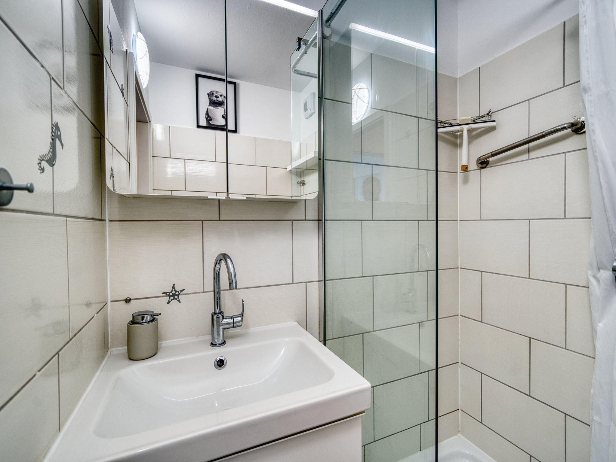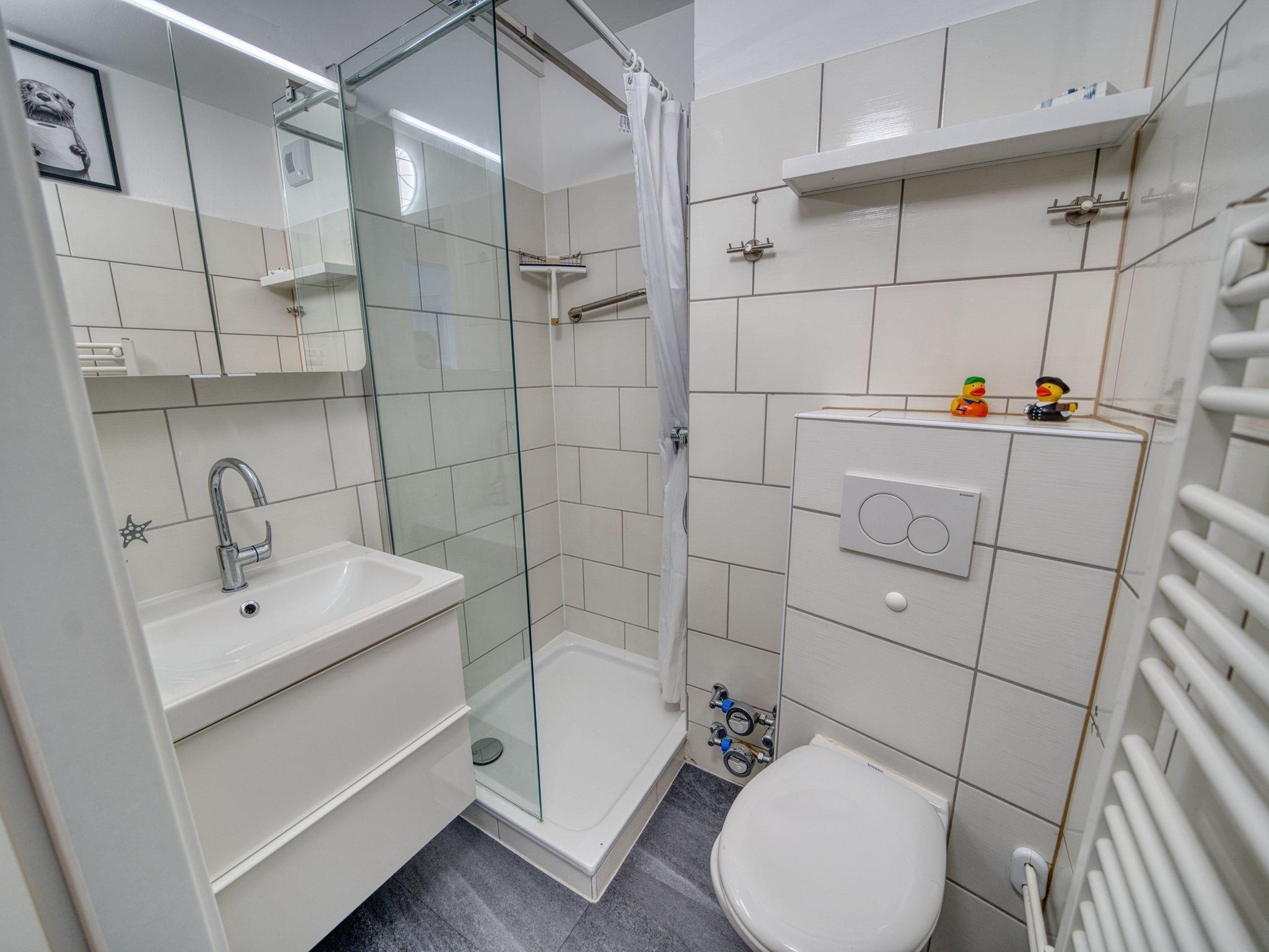 Neues Bad mit Dusche (Glasfront [&] Duschvorhang) und WC