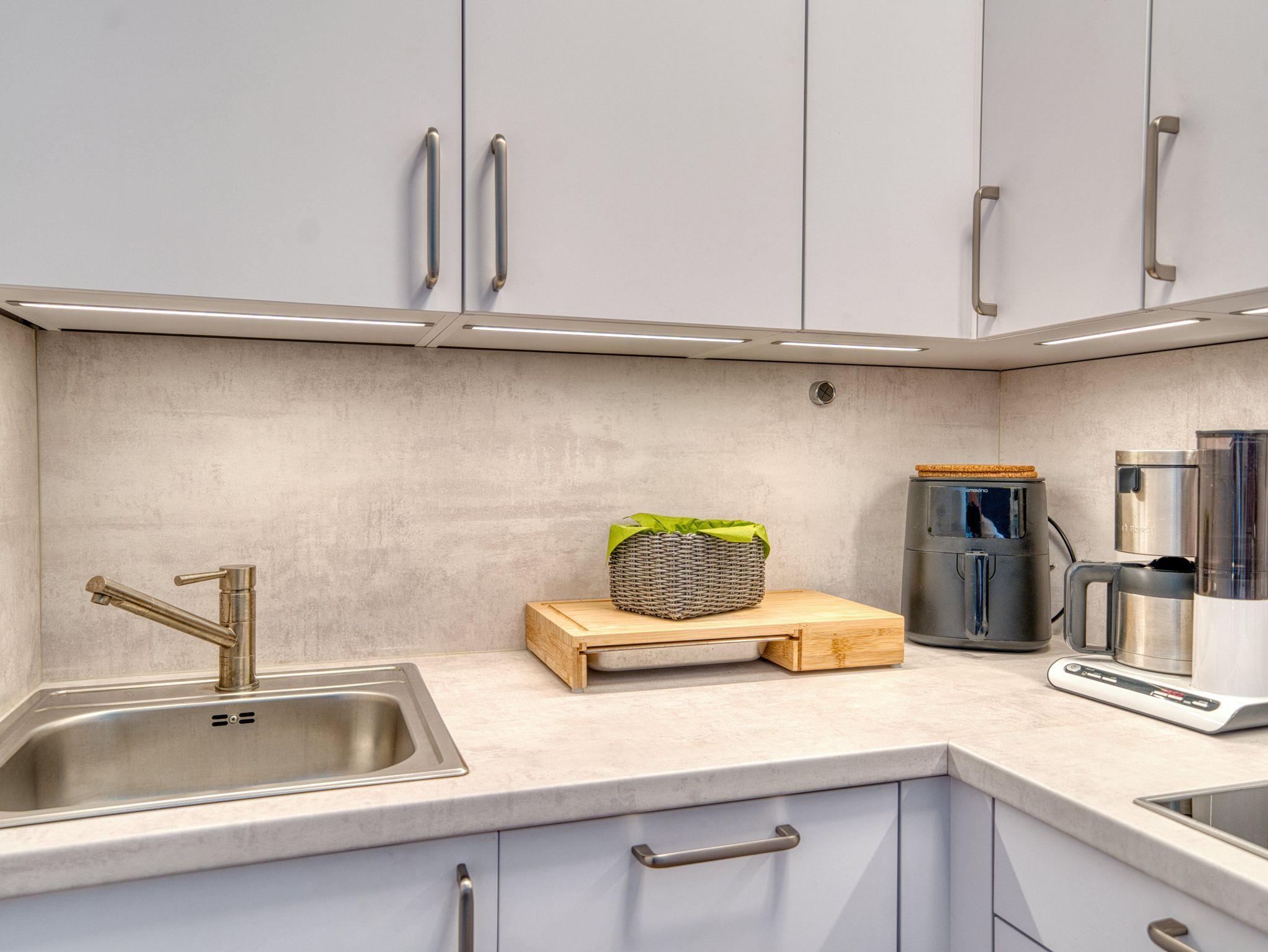 Moderne Küche mit kompletter Ausstattung: Kühlschrank, 2-Platten-Ceranfeld, Mikrowelle mit Grill-/Backfunktion, Heißluftfritteuse, Kaffeemaschine und Toaster