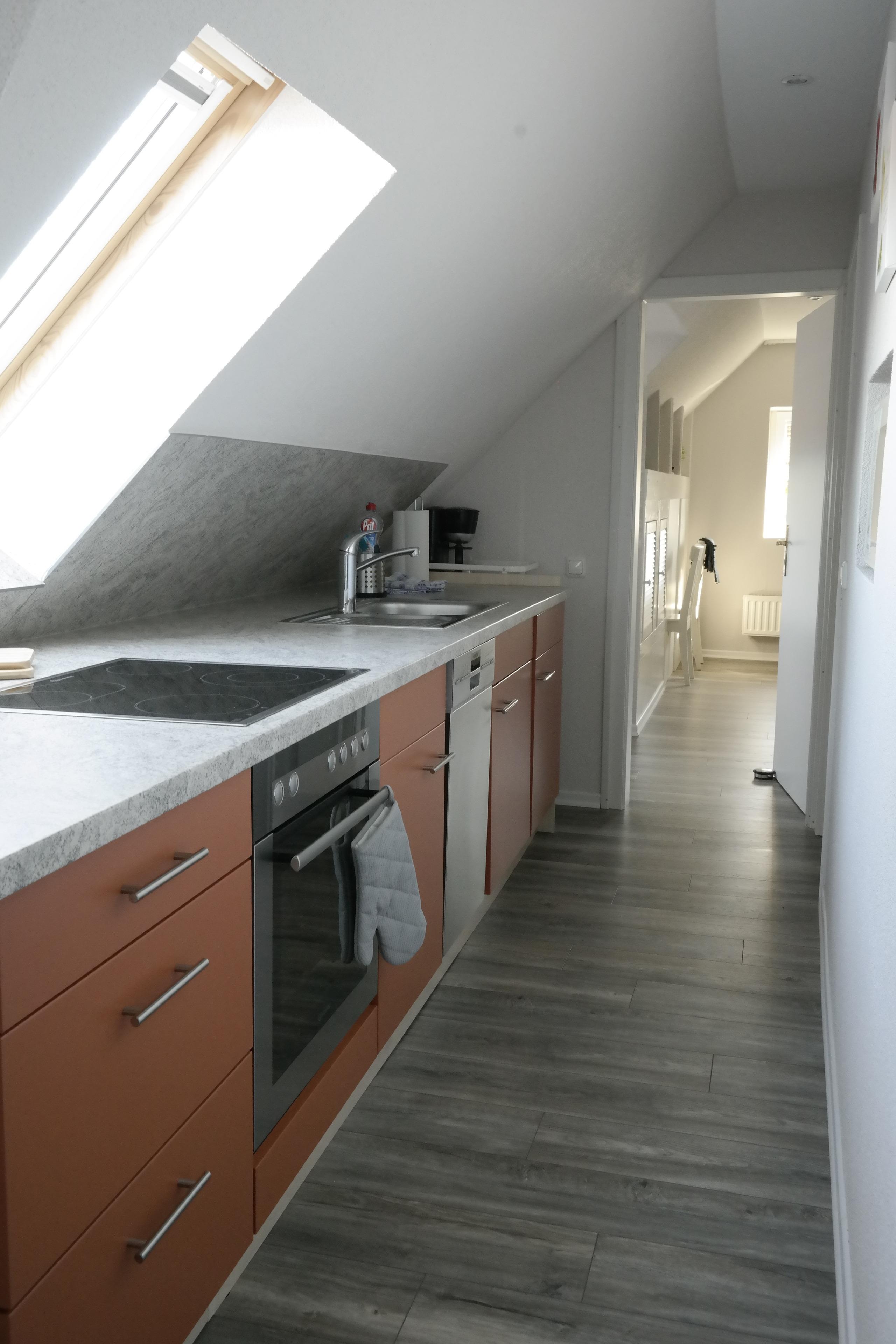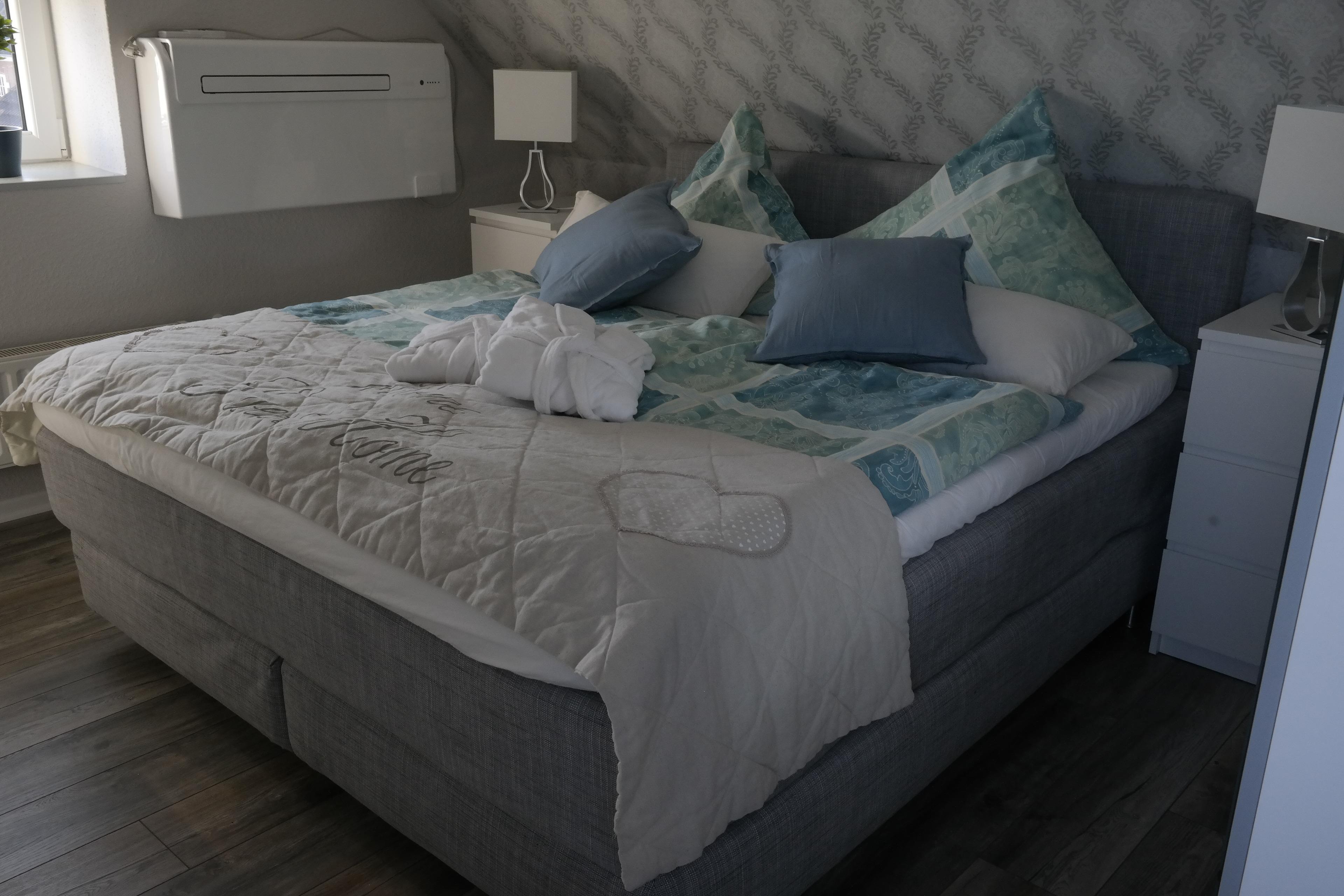 Großes Wohnzimmer mit angrenzender, voll ausgestatteter Küche- genießen Sie zunächst beim Kochen den herrlichen Ausblick bis nach Dänemark und dann ihre frisch zubereiteten Speisen. Das klimatisierte Schlafzimmer ist mit LCD-TV, Boxspringbett und genügend Stauraum ausgestattet. Ein gemütliches, feines Bad rundet die außergewöhnliche Ferienwohnung ab.