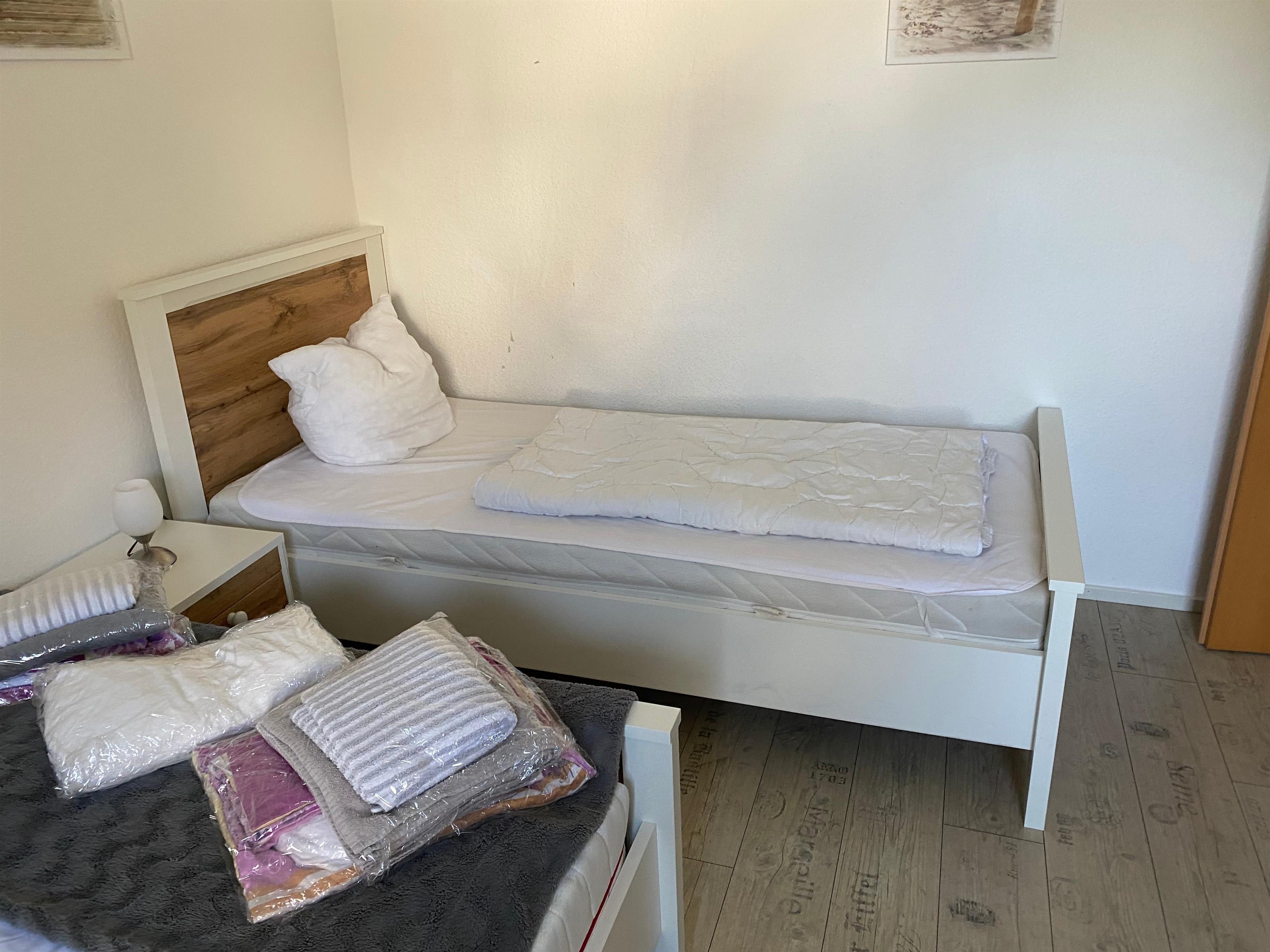 Schlafzimmer mit Doppelbett (1,80 x 2,00 m) erhöht und Kinderbett.