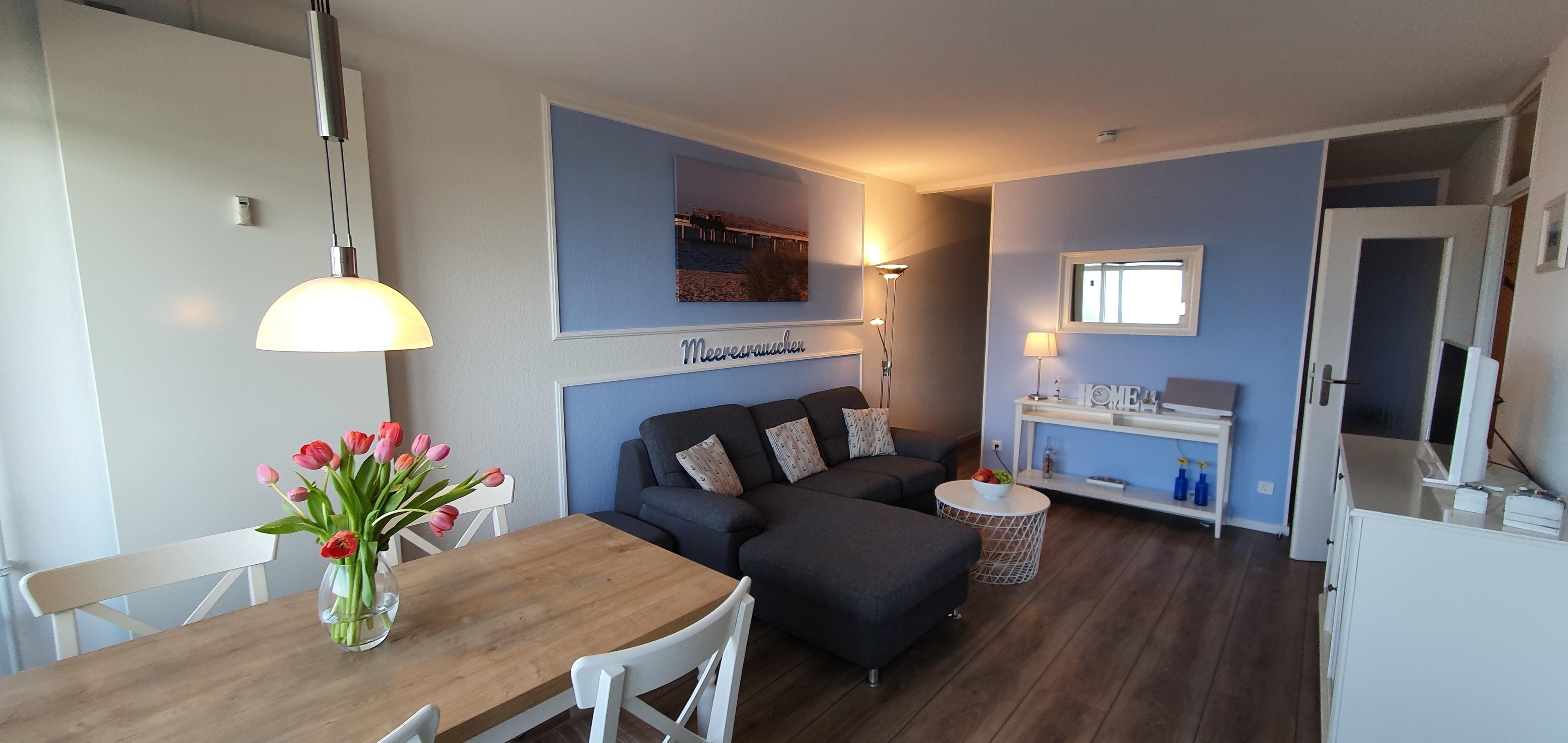 Im offenen Wohn- und Essbereich erwartet Euch eine neue und voll ausgestattete Einbauküche, sowie ein einladendes Sofa mit Recamiere. Hier könnt Ihr Euch Wohlfühlen und den Tag mit der Familie ausklingen lassen. Die Ferienwohnung wurde mit einem modernen und hochwertigen Designer-Vinylboden ausgestattet. Erlebt unvergessliche Urlaubsmomente in unserer Ferienwohnung "Strandläufer"!