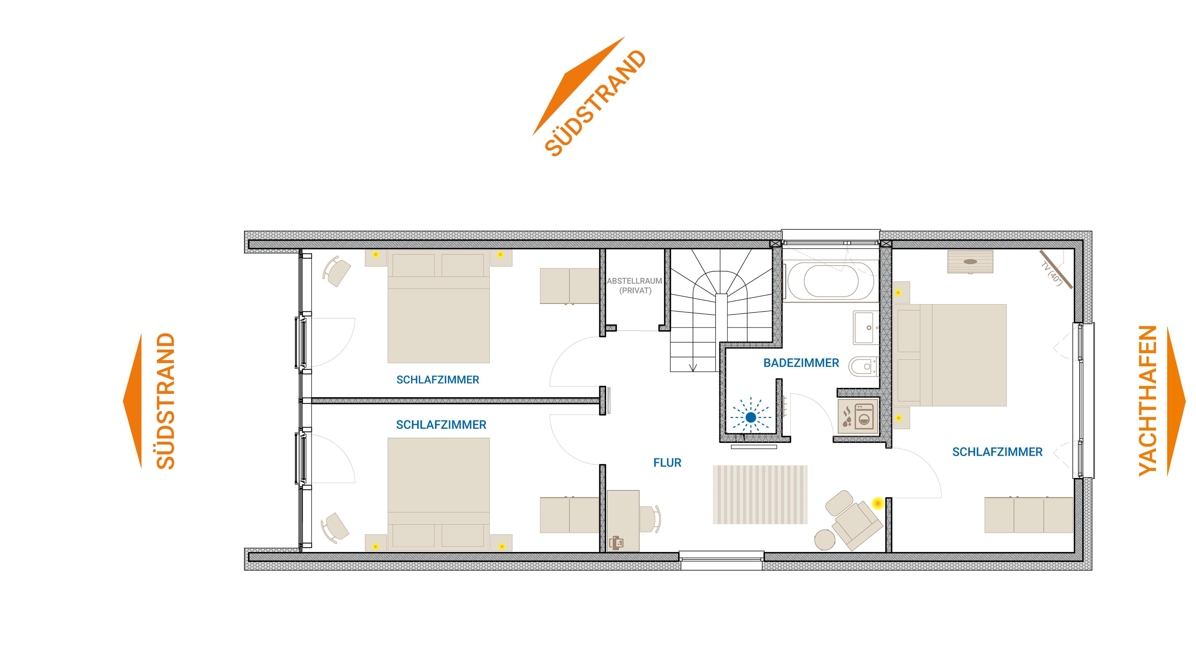 Das moderne 5-Sterne SÜDSTRANDHUS liegt in direkter Nähe zur Ostsee sowie zum Naturschutzgebiet Graswarder mit seinen weiten Salzwiesen. Schon von den bodentiefen Panoramafenstern im Wohnzimmer aus können Sie entspannt den Blick über den Binnensee schweifen lassen. Der großzügige Wohn- und Essbereich lädt zum Verweilen vor dem Kamin ein. Daneben gibt es im Erdgeschoss ein ruhiges Lesezimmer und ein WC. Ein weiteres Highlight des Hauses ist die Sauna nebst Regendusche. Im Obergeschoss befindet sich neben den drei Schlafzimmern mit Marina- bzw. Binnenseeblick das moderne Bad mit Badewanne. Also auch bei Schietwetter können Sie mal so richtig die Seele baumeln lassen – mit einem Wellnesstag im eigenen Ferienhaus.