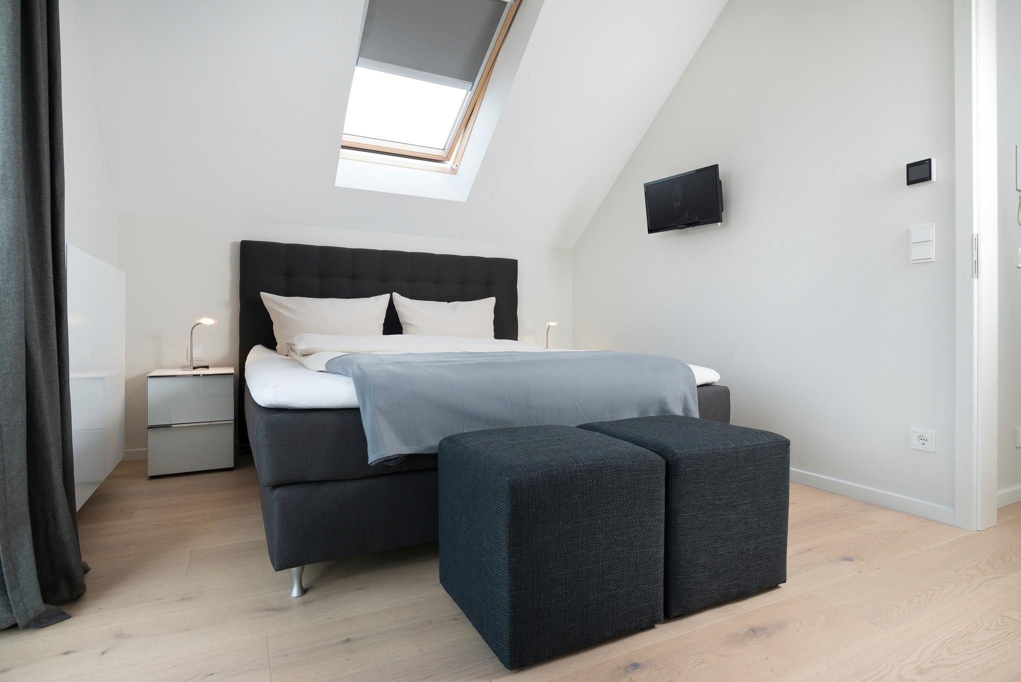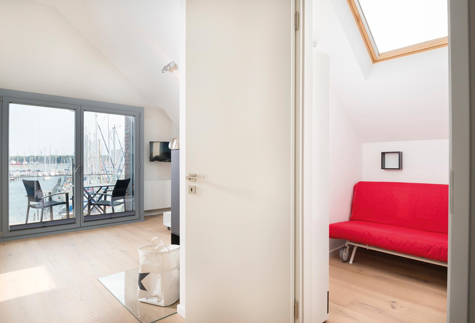 Diese exklusive Ferienwohnung mit fantastischem Hafenblick und Loftgefühl im großzügigen Dachgeschoss bietet ein Schlafzimmer, ein Wohnschlafzimmer mit Kaminofen, ein Kojenschlafzimmer mit Ausziehbett für zwei Personen, eine voll ausgestattete Einbau-Eck-Küche sowie ein Bad mit Dusche, Sauna und Waschmaschine (mit integrierten Trockner). Der Wohnraum besticht durch ausgesuchte Design-Möbel, die Küche ist mit hochwertigen Siemens-Markengeräten ausgestattet. Die Landhaus-Dielenböden unterstützen den Loft-Charakter. Zwei Balkone mit Glasbrüstungen und Balkonmöbeln laden zum Genießen des traumhaften Blicks auf Hafen, Dünenlandschaft und Meer ein. So wird die Wohnung zur perfekten Wohlfühl-Oase. Gäste haben die Wahl, bei einer Belegung mit vier Personen neben dem Schlafzimmer entweder das Kojenschlafzimmer oder das Schlafsofa im Wohnzimmer zu nutzen.