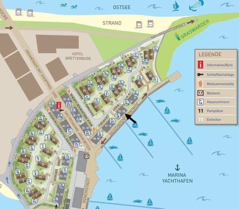 Die Wohnung liegt direkt an der Jachthafenpromenade im ruhigen und hinteren Bereich des Strand Resorts. Die Wohnung liegt in unmittelbarer Nähe zur Seebrücke und ist nur ein Steinwurf vom Zentrum mit all seinen Geschäften, Restaurants und dem Fischereihafen entfernt.