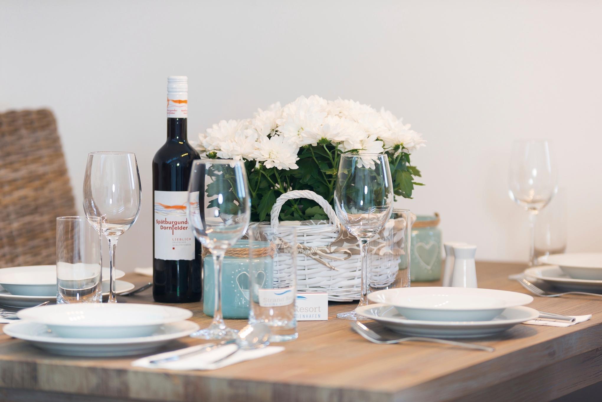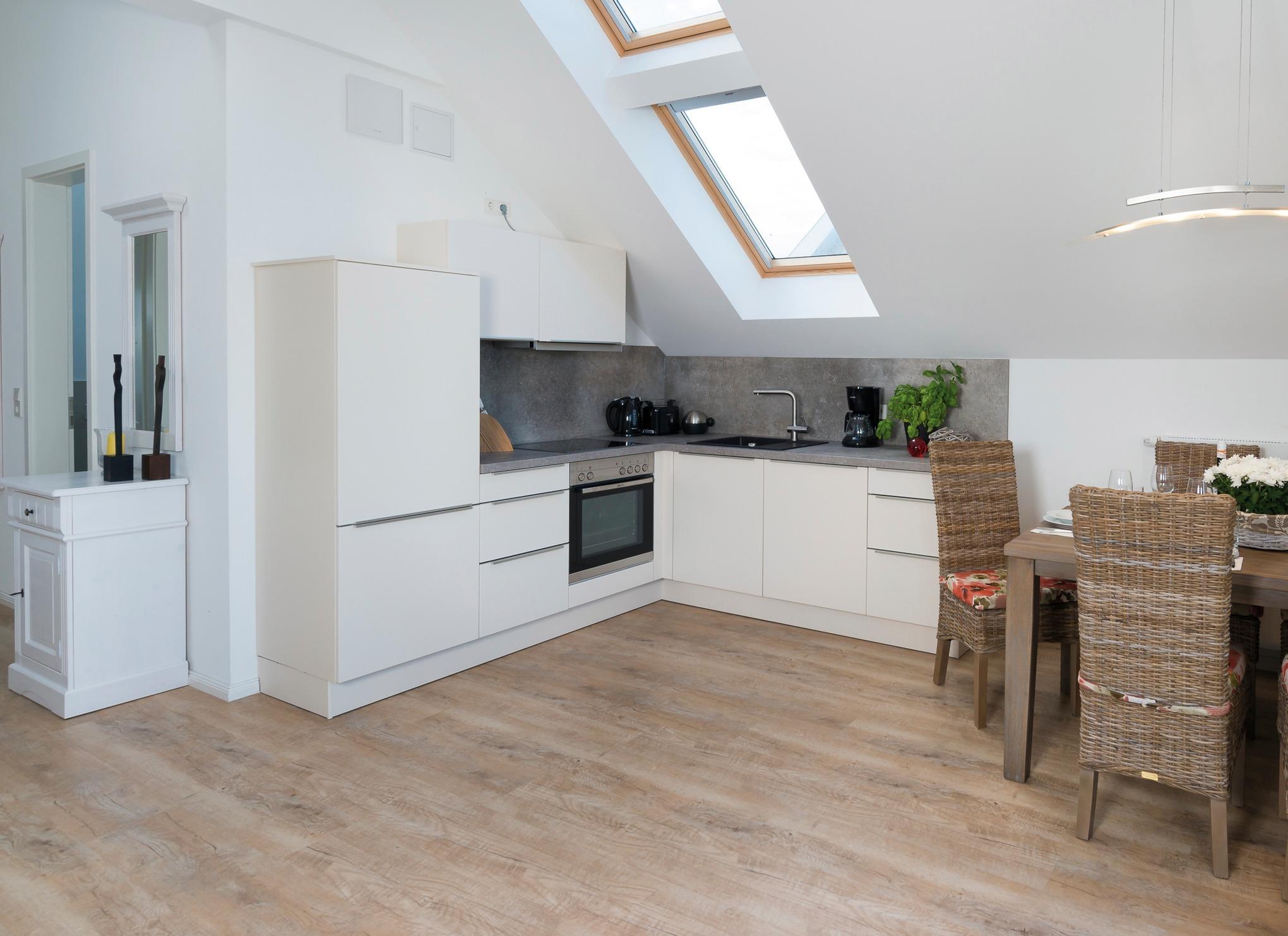 Die Wohnung ist mit hochwertigen Möbeln im Landhausstil ausgestattet. Sie besteht aus einem Schlafzimmer, einem Wohn- und Esszimmer mit integrierter Küche und einem Bad mit Dusche.