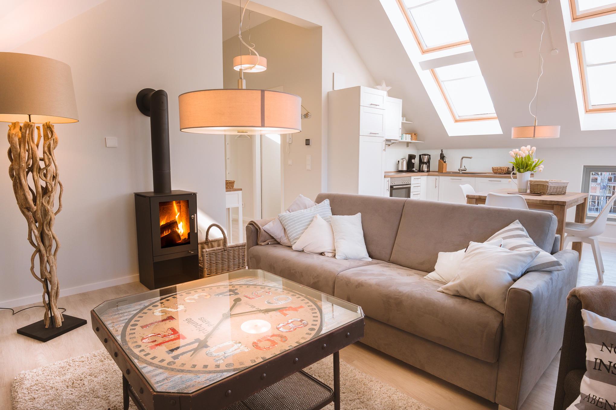 In den kühleren Monaten sorgt ein knisternder Kaminofen für die Gemütlichkeit.