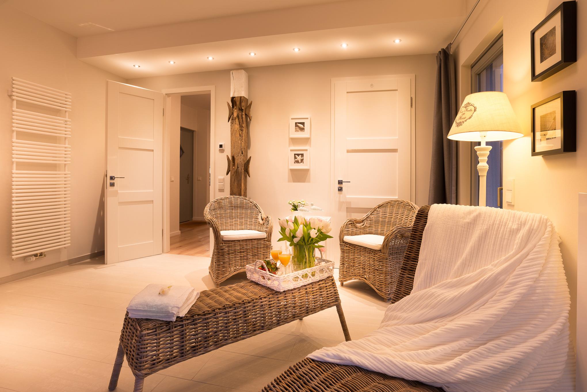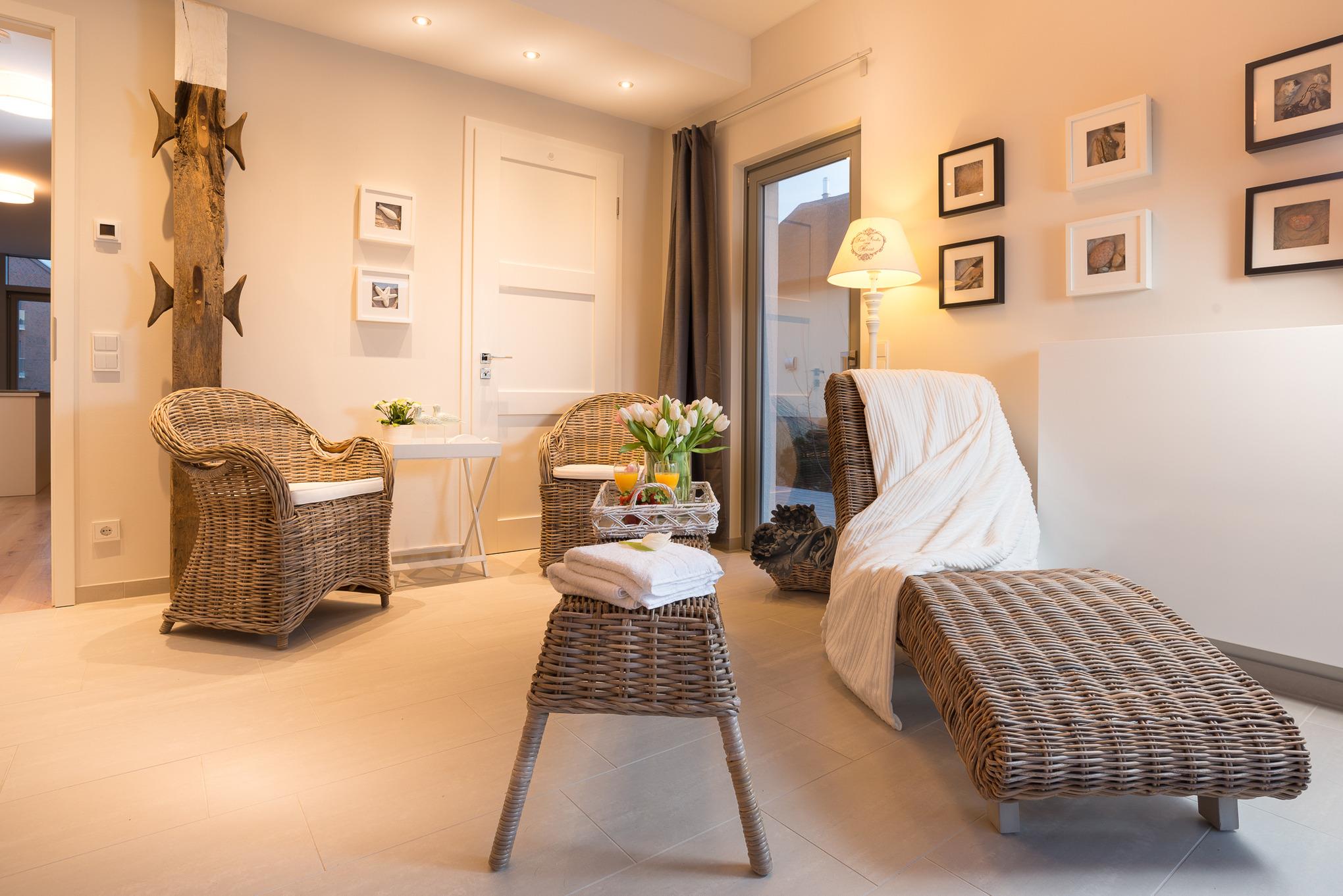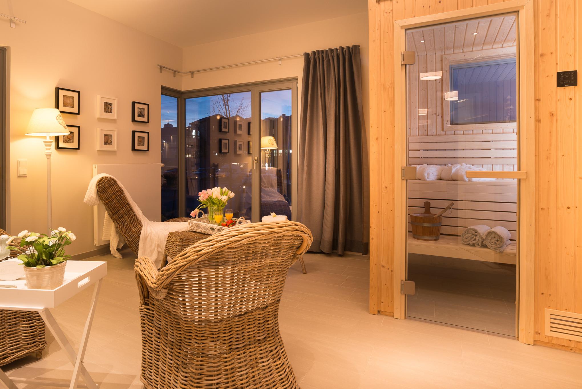Neben dem geräumigen Flur befindet sich der große Saunabereich. Hier kann man nach dem Saunieren auf Liegen entspannen und aus dem Fenster den Dünenblick genießen. Ein Gäste WC befindet sich ebenfalls hier im Erdgeschoss.