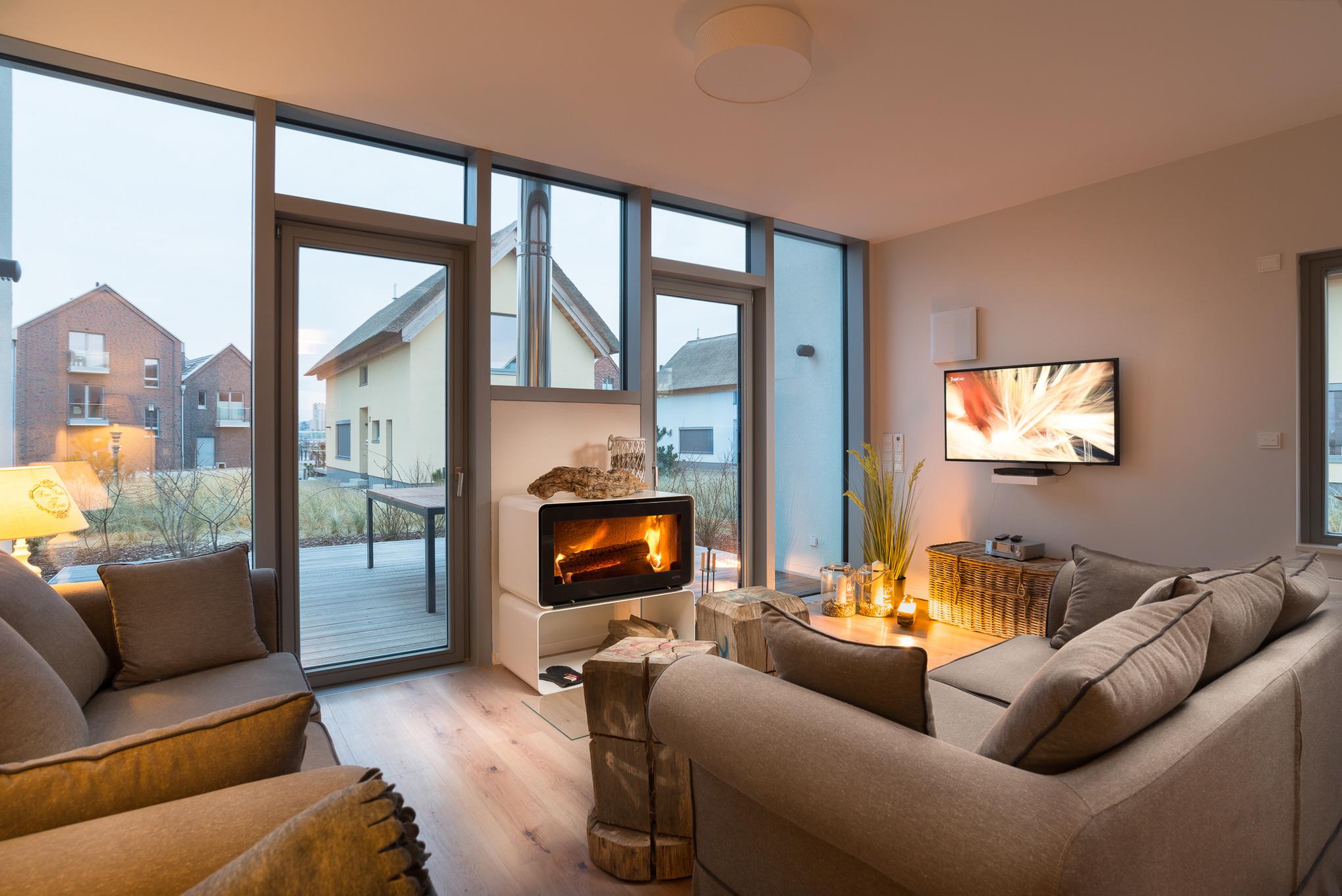 Ob vom gemütlichen Sofa, den Sesseln am Esstisch oder aus der Küche, alle können hier das Feuer im Kamin genießen.