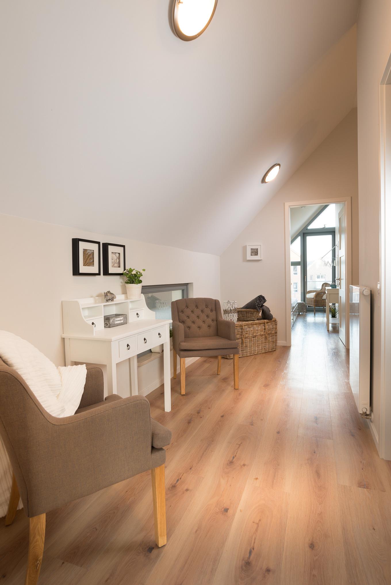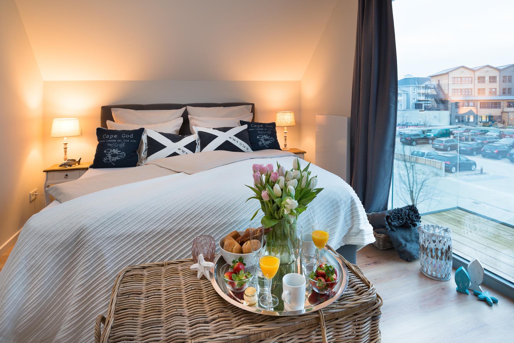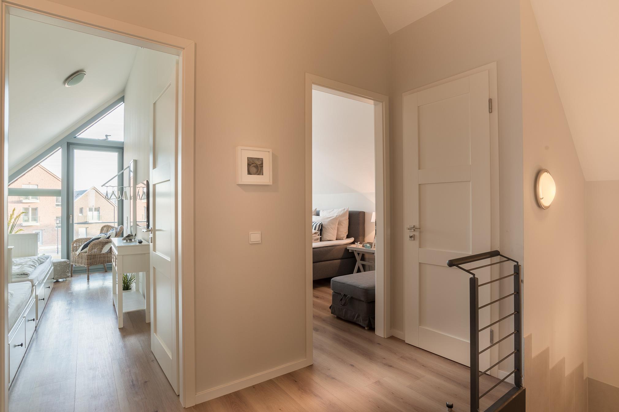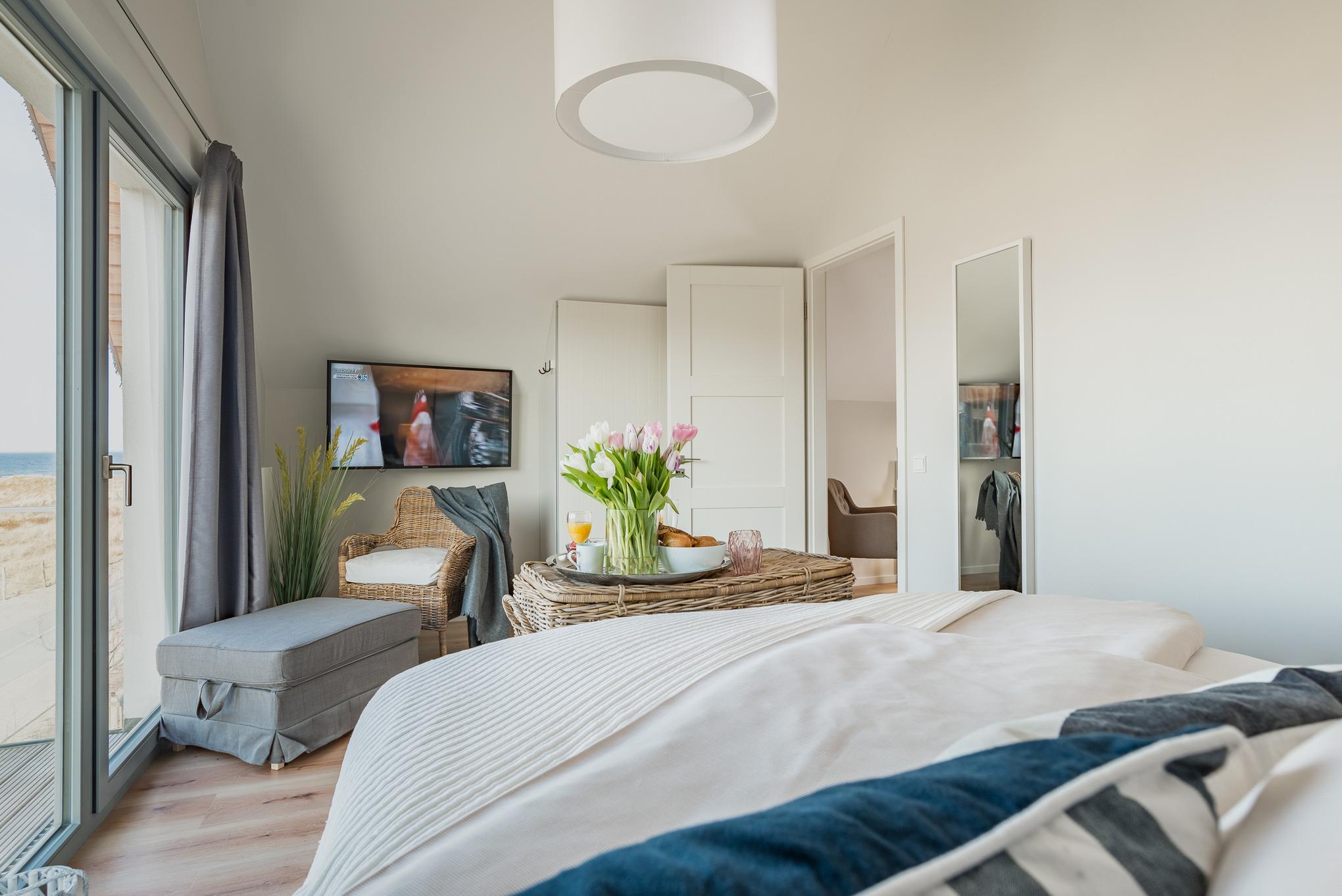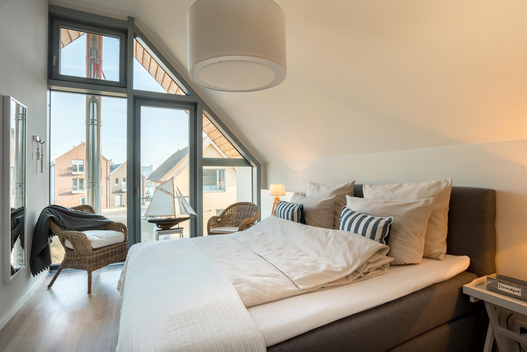 Zwei Master-Schlafzimmer sowie ein Kinderschlafzimmer, welches ohne weiteres für Erwachsene geeignet ist, befinden sich im Obergeschoss. Die Masterzimmer sind mit Boxspringbetten ausgestattet. Auch hier münden die hohen Räume in verglasten Giebelwänden und großen Fenstern um die Aussicht auf die Dünen, die Ostsee oder den Jachthafen genießen zu können. Eines sogar mit Balkon, auf dem die Abendsonne genossen werden kann. Wer es dennoch schafft den Blick von der Natur zu wenden, dem steht in jedem Schlafzimmer eine Flachbild-TV zu Verfügung.