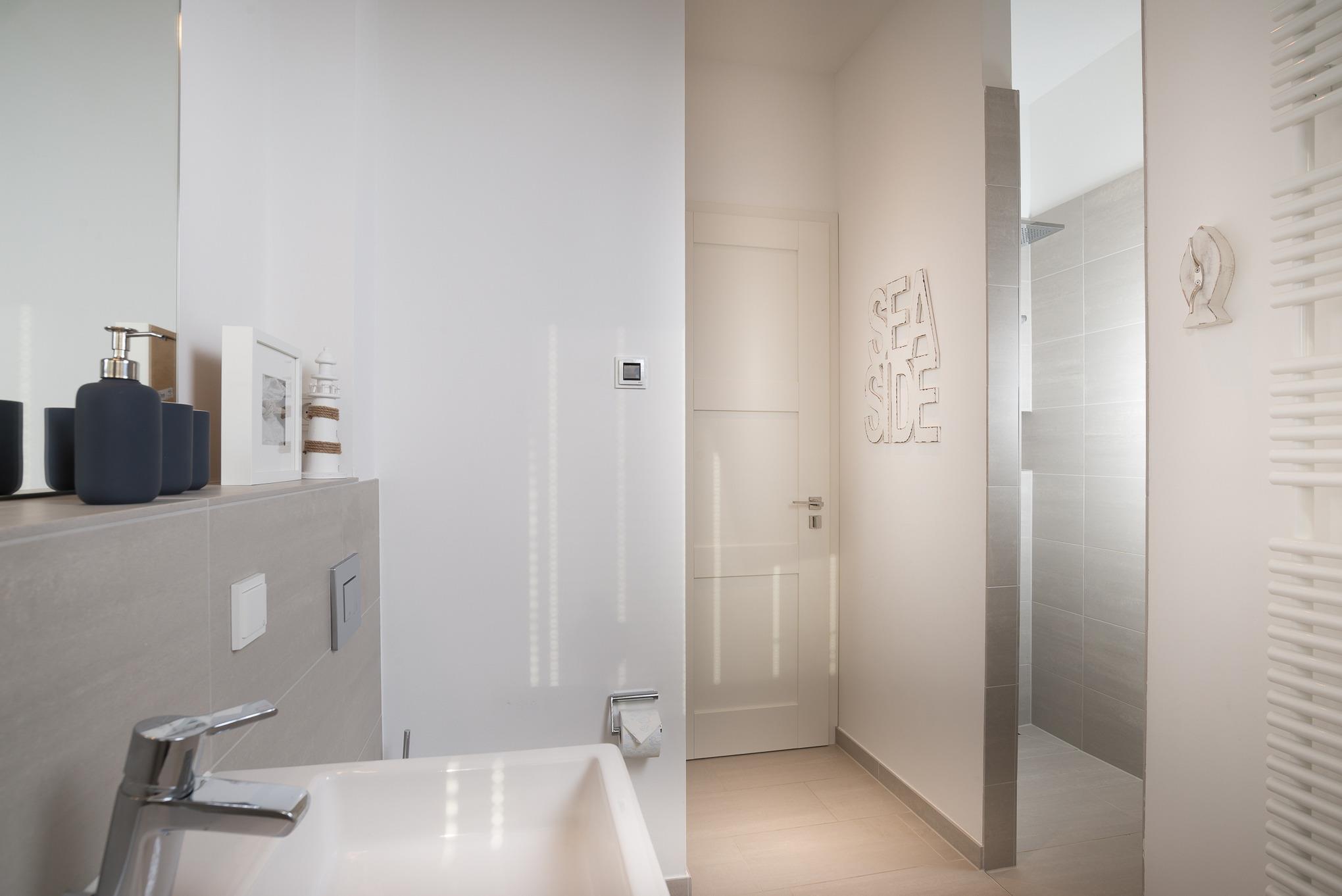 Im Zentrum des Obergeschosses befindet sich auch das Bad, das wie die Sauna eine bodenebene Walk-In-Dusche beinhaltet. Auch hier beflügelt der Ausblick aus dem Fenster.