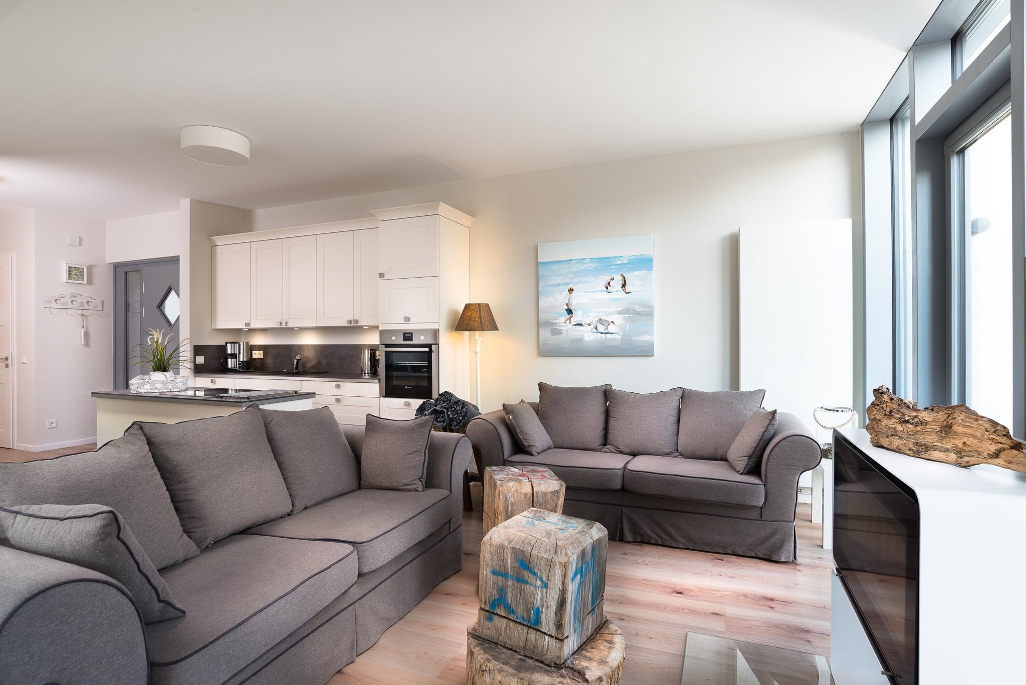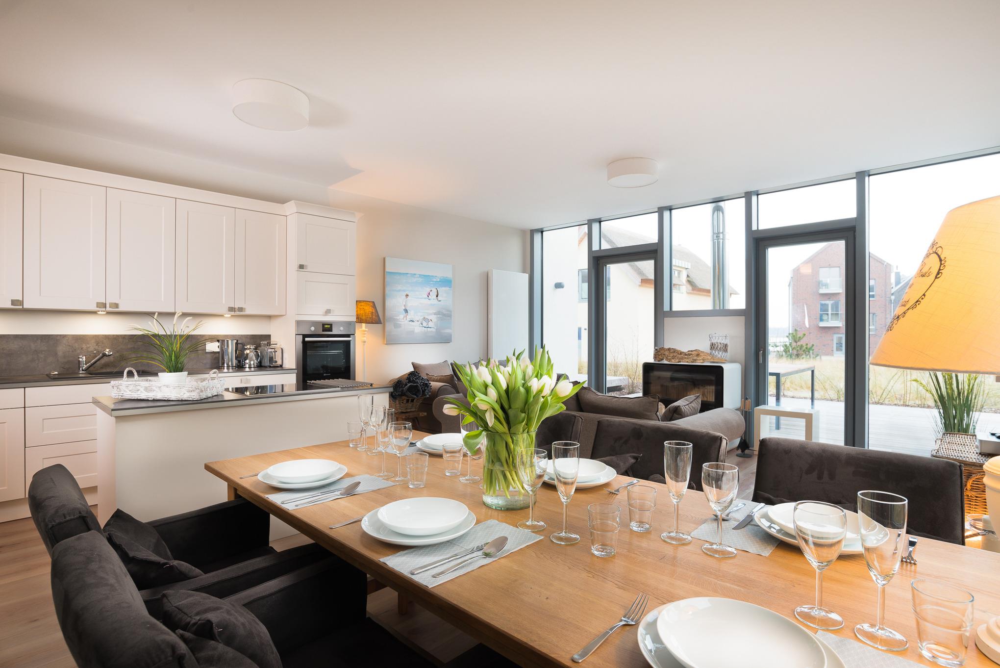 Das offene Wohn- und Esszimmer ist lichtdurchflutet durch seine giebelseitige Fensterfront. So entsteht der Eindruck direkt in den Dünen zu leben. Dort, im Wohn-Essbereich, befindet sich auch die Küche, die durch ihren zum raumgerichteten Küchenblock das Kochen zum Vergnügen werden lässt.