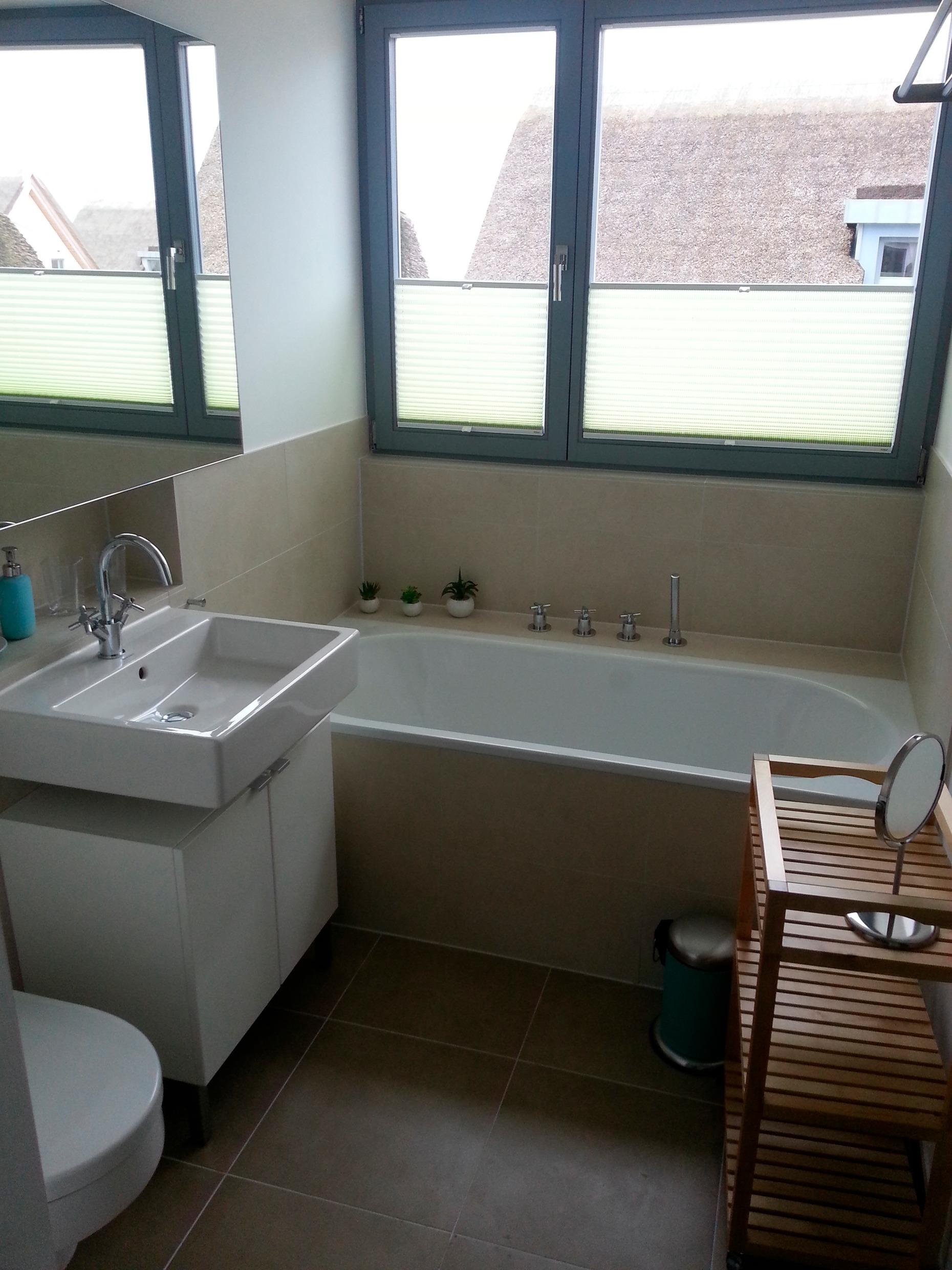 Beim Biss ins knackige Frühstücksbrötchen blickt man aufs Meer, wenn man von seiner Ferienlektüre aufschaut, glitzert das Wasser und wenn man abends auf dem Balkon steht, schweift der Blick weit über die Wellen. Das Haus ist modern eingerichtete, wobei die massiven Eichenplatten der Tische im Wohn-Esszimmer einen Hauch wohnlicher Rustikalität verströmen. Wenn man dann abends in die Flammen des Kaminofens blickt, verliert das Wetter an Bedeutung und wem es immer noch nicht warm genug ist, der kann sich in der Sauna aufheizen.
