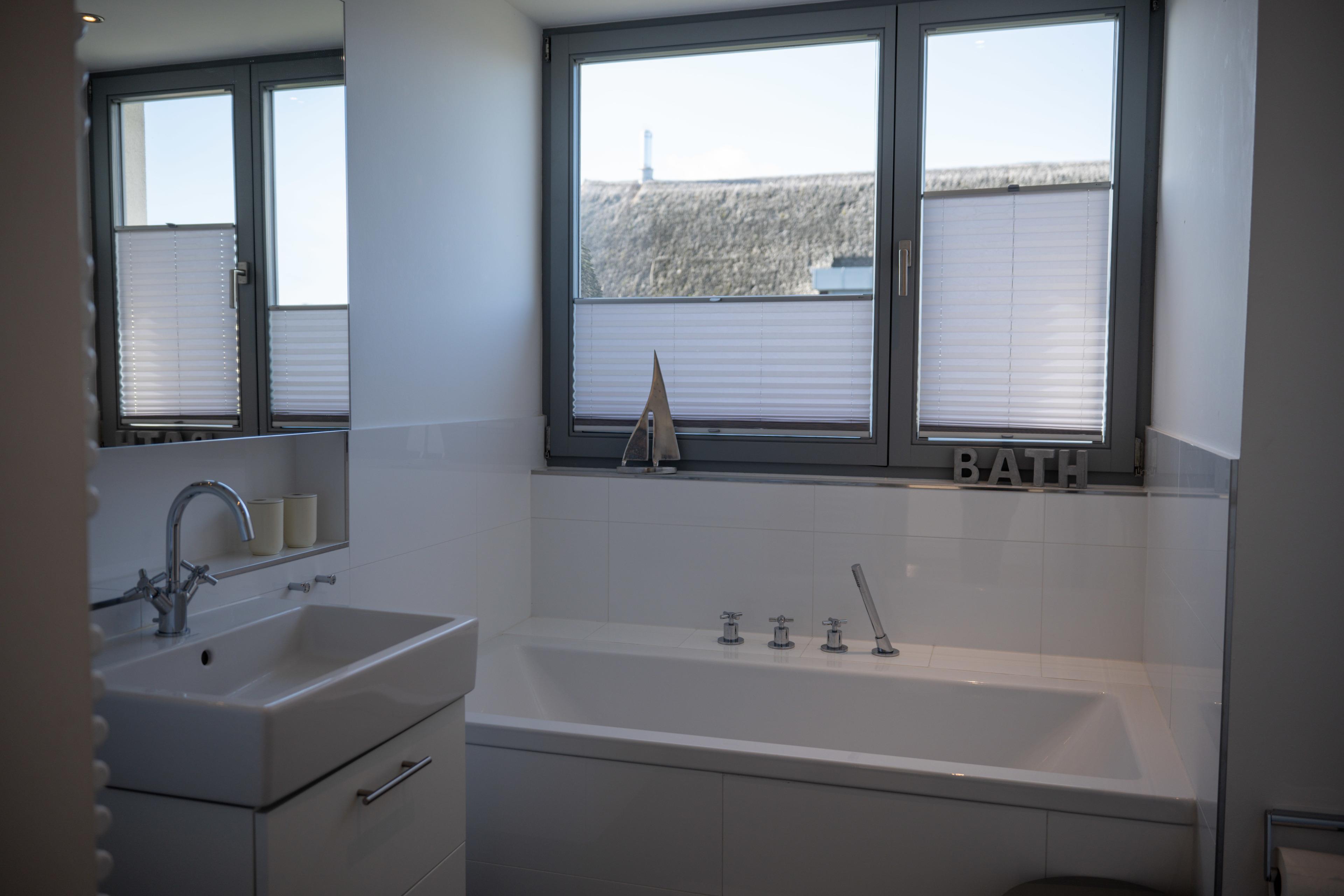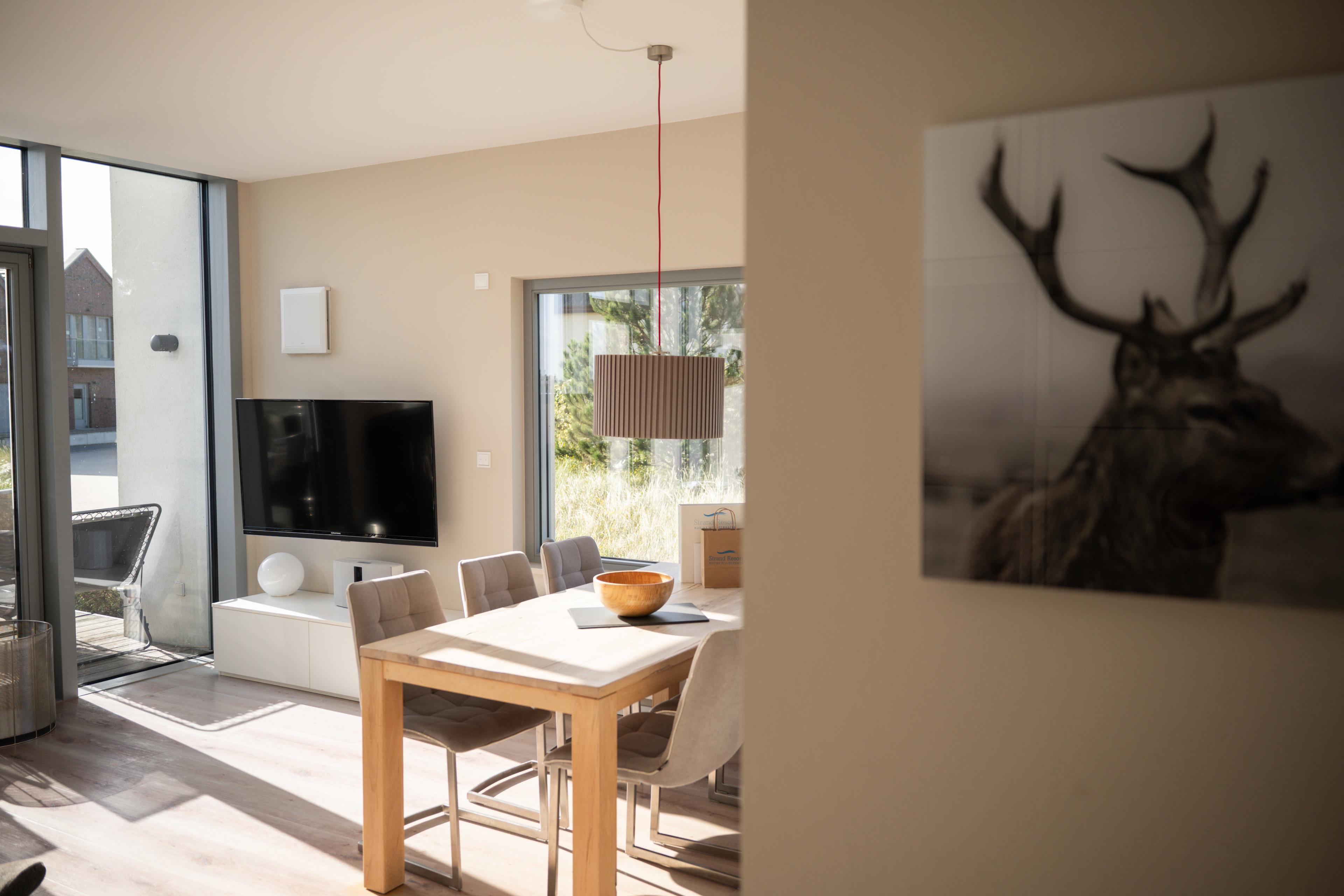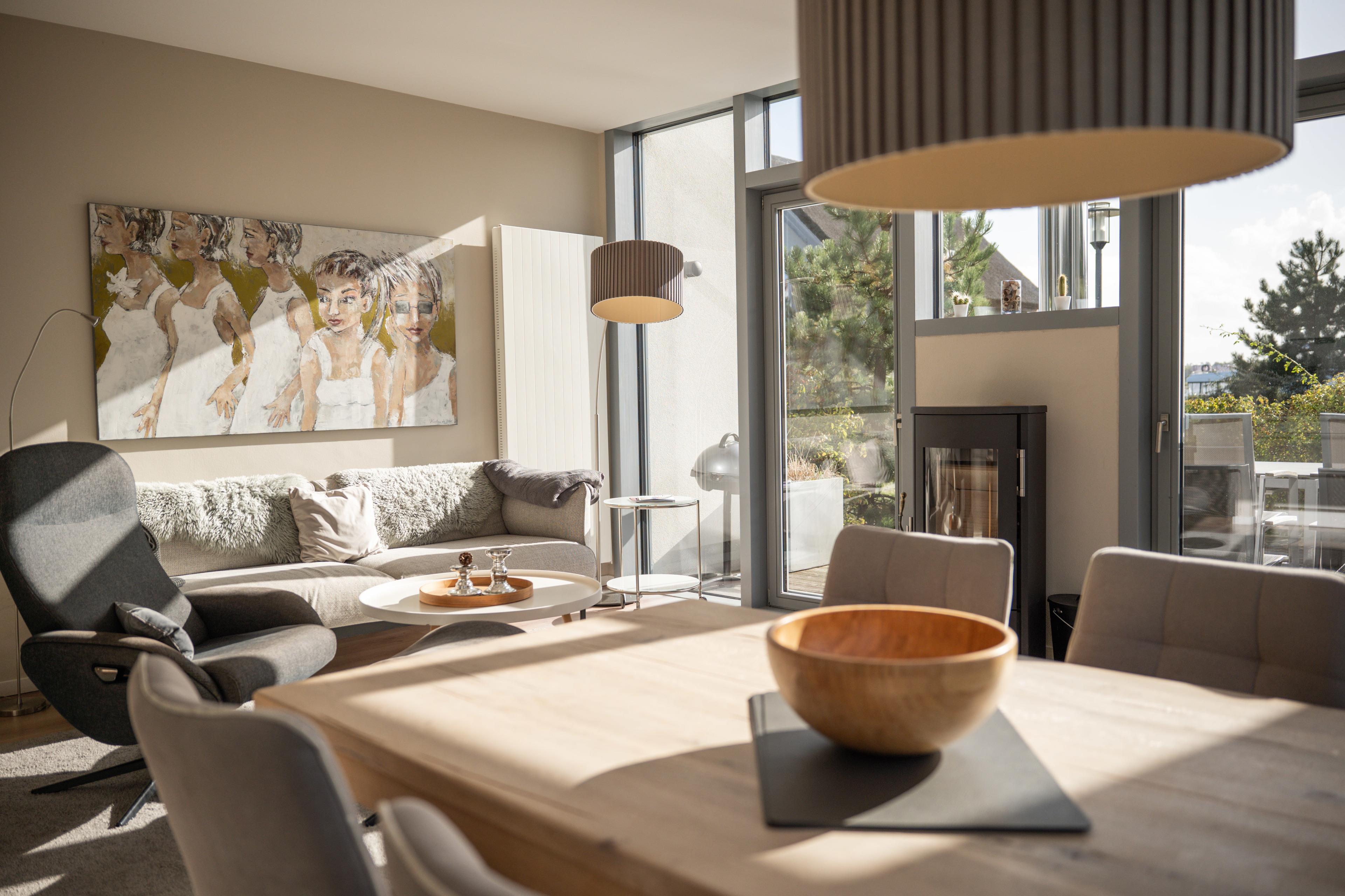 Neues, qualitativ hochwertig eingerichtetes Domizil mit finnischer Sauna, luxuriösem Wohn-/Essbereich, Kamin, 3 Schlafzimmer (insgesamt 6 Erwachsenenbetten), großzügiger holzgetäfelter Terrasse.