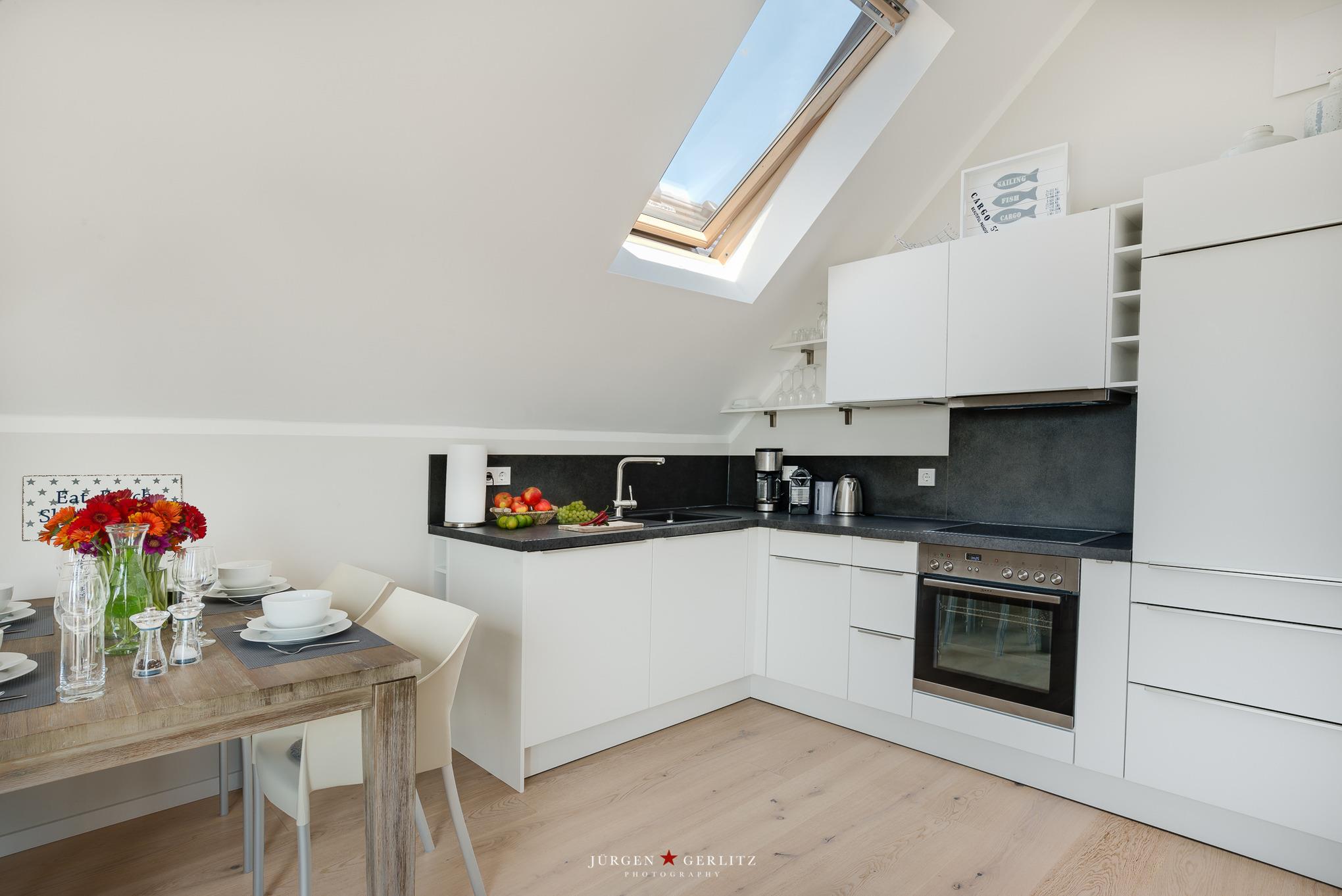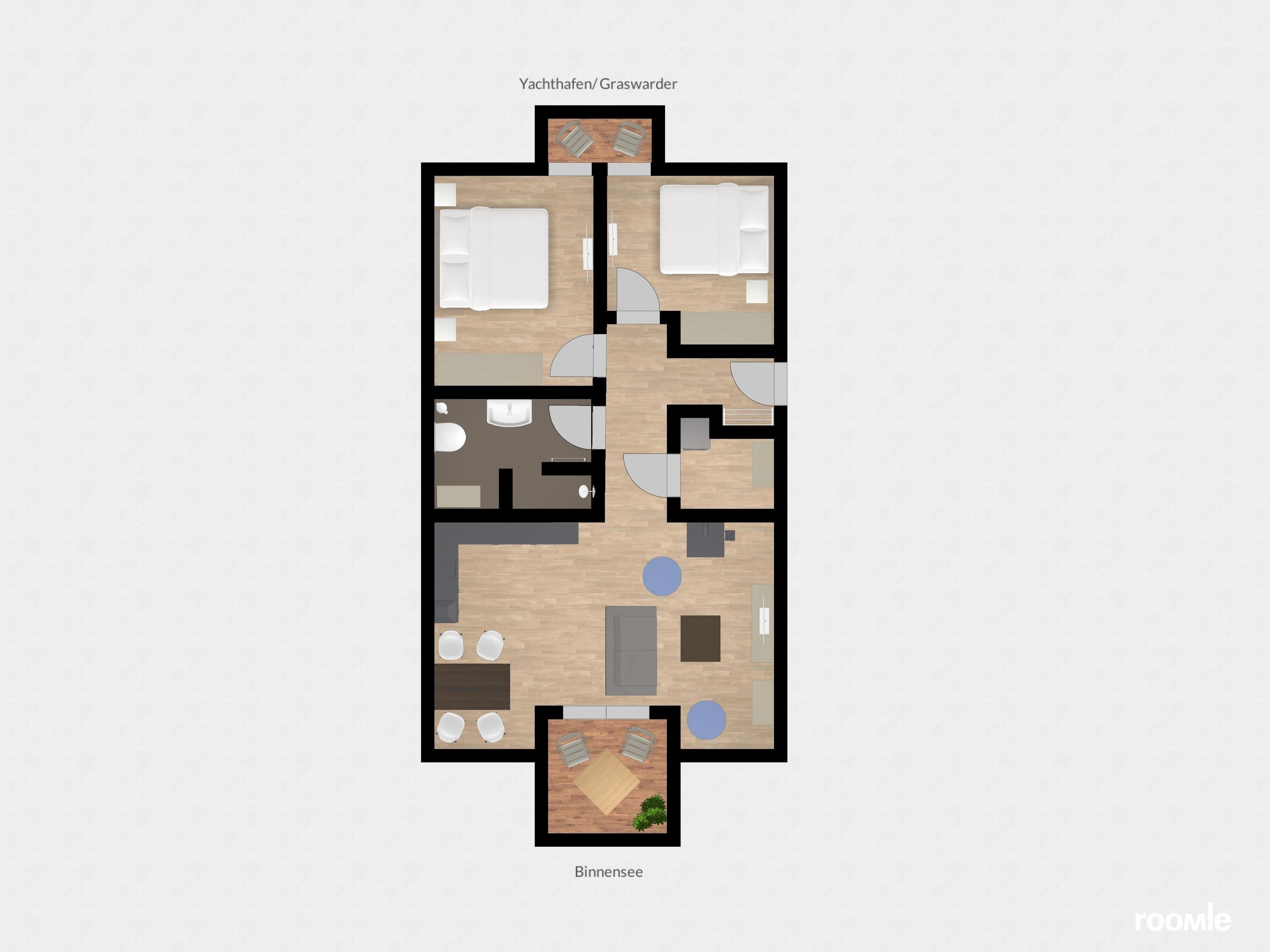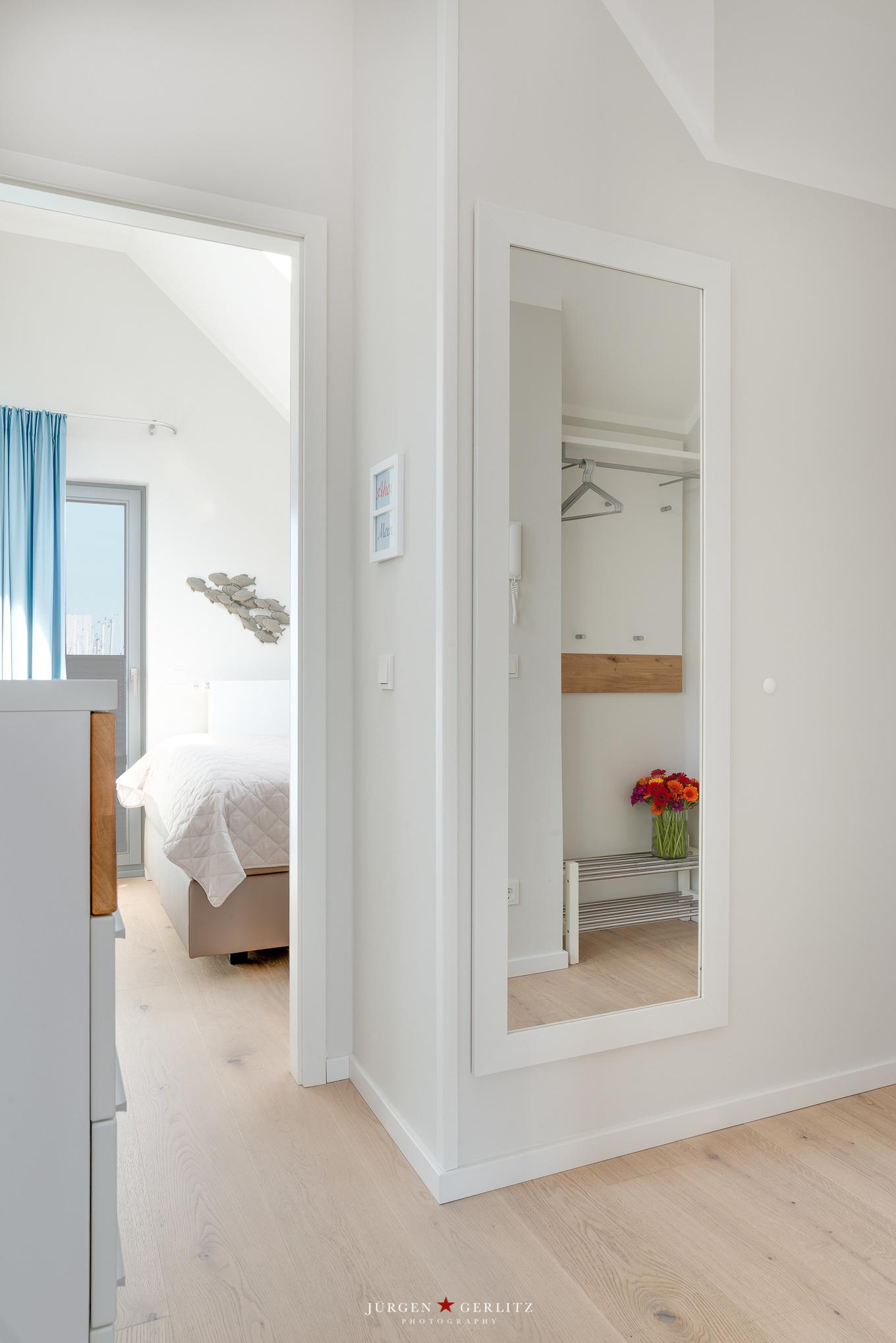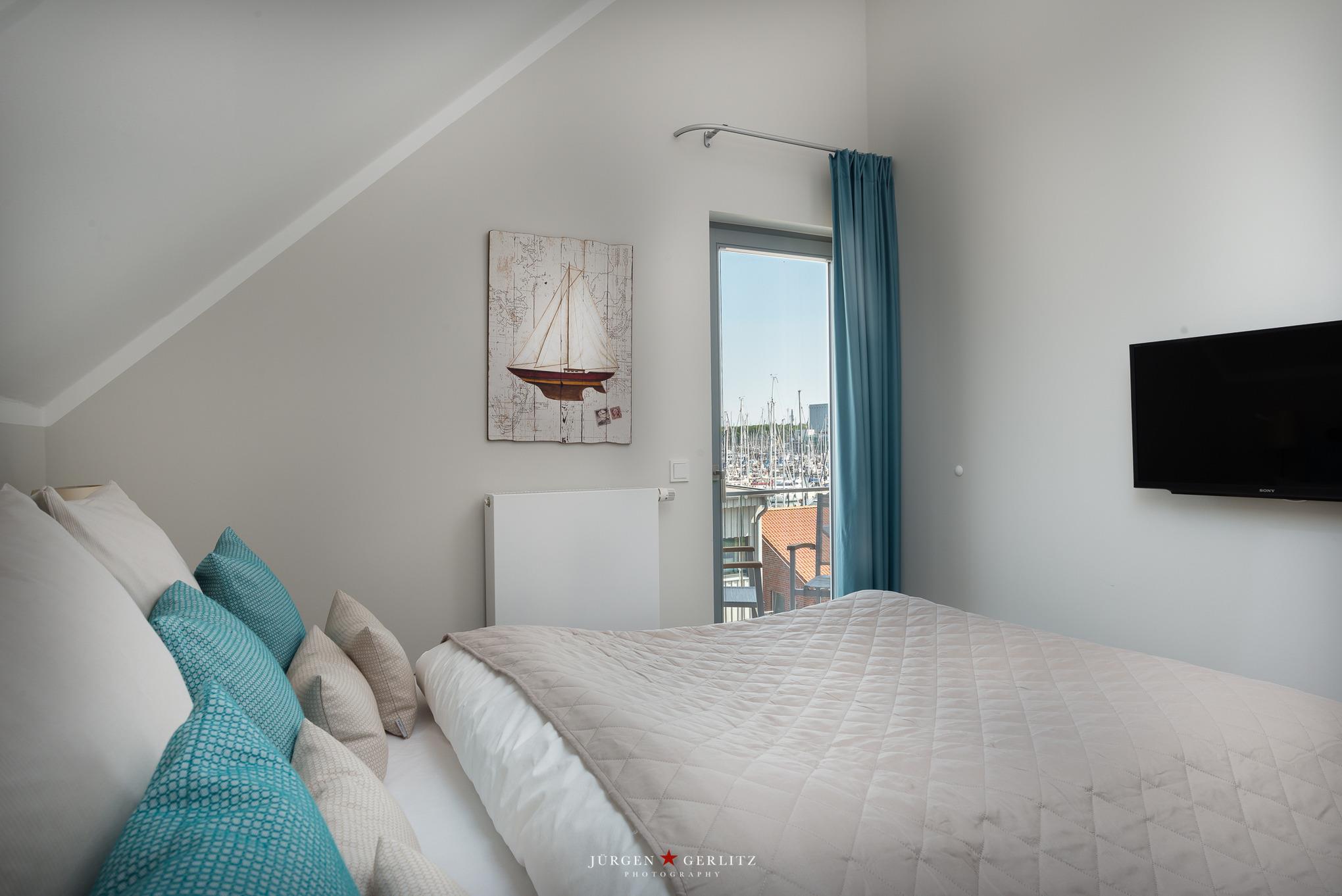 Die nach Westen ausgerichtete Balkon-Loggia eröffnet einen weiten Blick über den Binnensee mit Binnenstrand. Von hier genießen sie die wunderschönen Sonnenuntergänge. Der nach Osten ausgerichtete Balkon vor den Schlafzimmern lässt den Blick über den Yachthafen bis über den Graswarder zur Ostsee schweifen.
