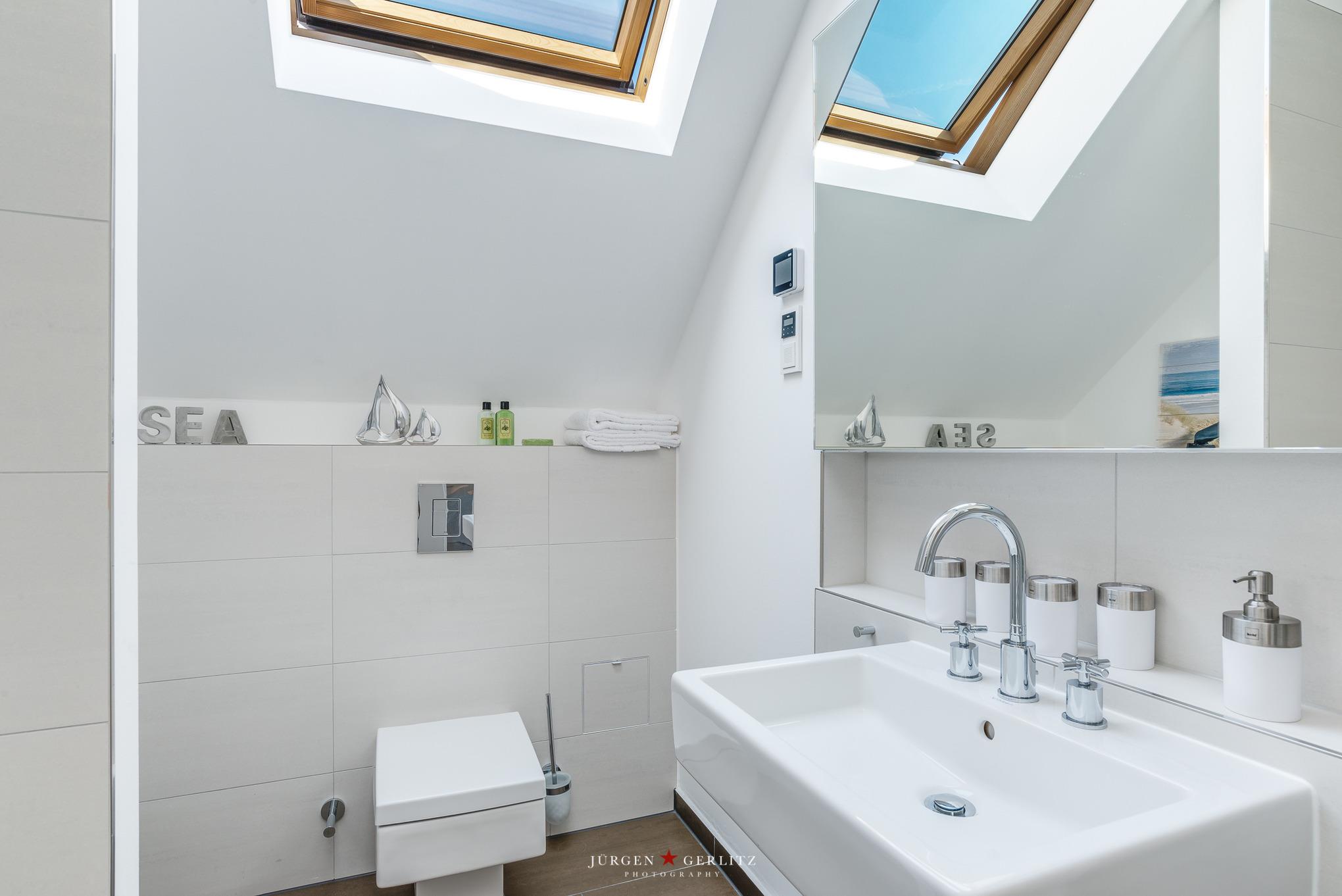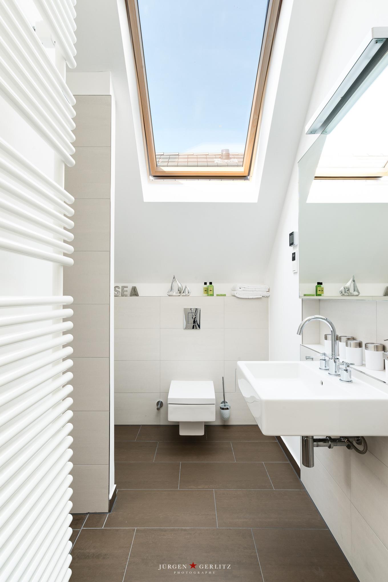 Das Bad ist mit einer Fußbodenheizung, einem Handtuchwärmer, einer bodengleichen Regendusche und einem in die Wand integrierten GIRA-Radio komfortabel ausgestattet.