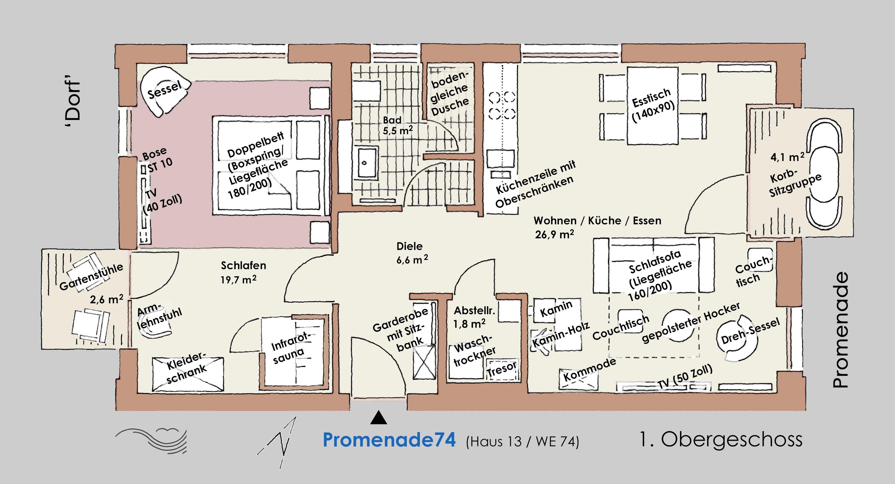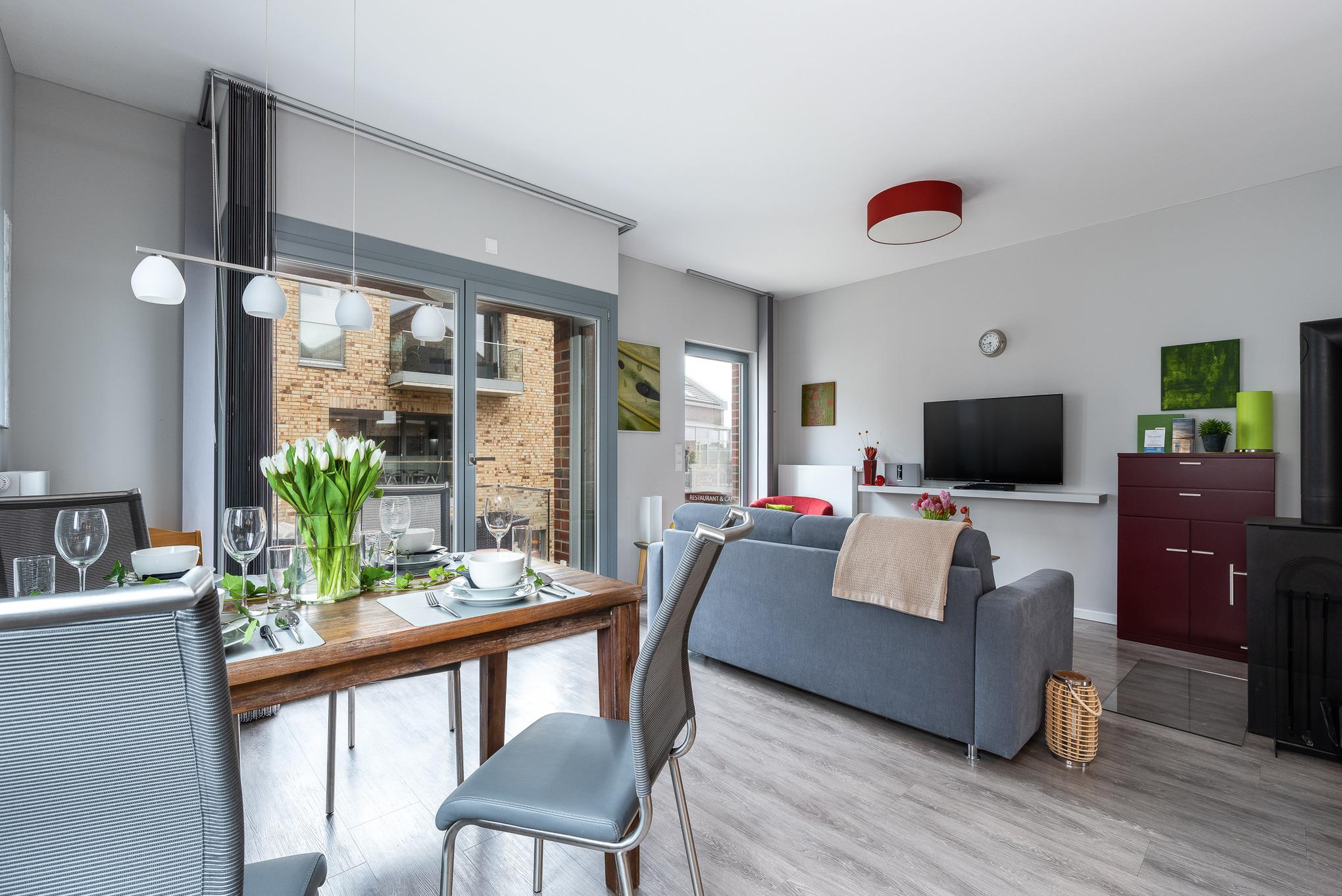 Direkt an der Promenade, gleich neben der Marina, liegt im ersten Obergeschoss die helle, großzügige 2- Zimmerwohnung mit zwei Balkonen und einer hochwertigen, modernen Ausstattung. Ein hochwertiges Schlafsofa ermöglicht die Aufbettung für zwei weitere Personen.