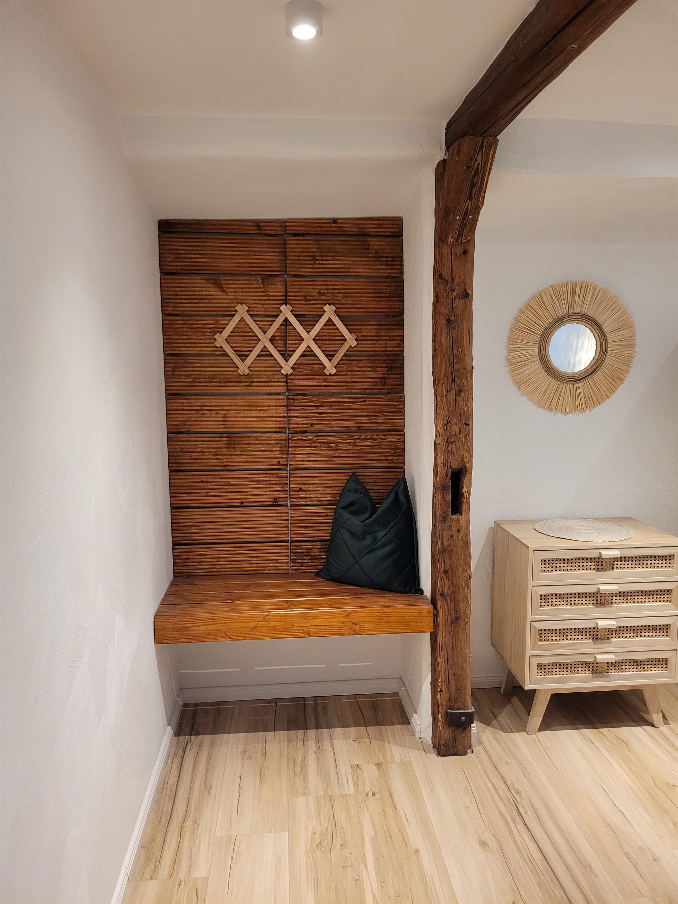 Die Sanierung der FeWo „Strandgut “ wurde im Juli 2023 abgeschlossen, also „brandneu“. In der Wohnung trifft der exklusive Skandi-Stil auf den gemütliche Boho-Stil, dabei verfügt die Wohnung über eine hochwertige Ausstattung. Die FeWo „Strangut“ besteht aus einem Wohnzimmer mit offener Küche, welche komplett ausgestattet ist. Diese verfügt über einen Geschirrspüler, Kühlschrank, Ceranherd, Backofen, Toaster, Kaffeemaschine und Wasserkocher. Des Weiteren befindet sich im Wohnzimmer ein qualitativ hochwertiges Sofa und der gemütliche Essbereich. Das Schlafzimmer ist mit einem komfortablen Boxspringbett in Queensize-Größe plus Topper für einen erholsamen Schlaf eingerichtet. Die FeWo "Strandgut" besitzt ein einzigartiges innenliegendes Duschbad mit WC und Föhn. Das absolute Highlight der FeWo "Strandgut" ist aber der große Balkon mit Süd-West-Ausrichtung, hier kann man schöne sonnige Tage und Abende genießen, auch der Blick in den geheimen Garten lädt zum Entspannen und Erholen ein. Zur weiteren Ausstattung gehören: Flachbild-Fernseher, Radio-anlage, Wäscheständer. Ein Waschtrockner, Bügeleisen und Bügelbrett sind auch im Hause vorhanden. PKW-Stellplätze befinden sich 200 m weiter direkt am Binnensee. Ein wunderschöner Innenhofgarten mit der alten Fasswerkstatt #LostPlace und einem Grillplatz lädt zum Verweilen und grillen ein.